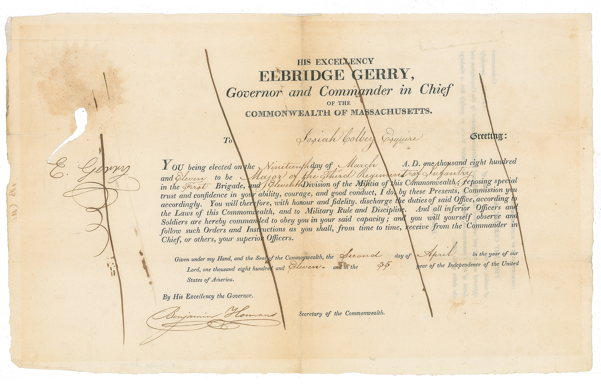 Signer of the Declaration of Independence from Massachusetts (1744–1814) who later served as vice president under James Madison. His name entered the language as a result of his support of politically advantageous redistricting, which became known as 'gerrymandering.' Partly-printed DS, signed "E. Gerry," one page, 15 x 9.25, April 2, 1811. As governor of Massachusetts, Gerry appoints Josiah Colbey as "Major of the Third Regiment of Infantry in the First Brigade, and Eleventh Division of the Militia of this Commonwealth." Signed in the upper left by Gerry and countersigned at the conclusion by Benjamin Homans as secretary. The seal affixed to the upper left remains only partially intact. In fine condition, with faint toning along the folds, and a small area of paper loss close to the signature.