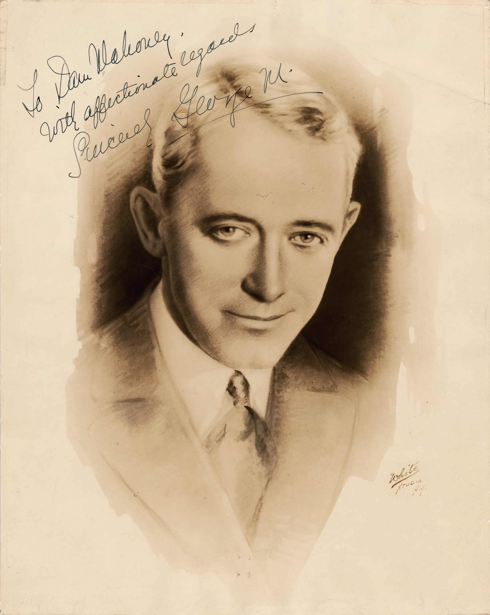 American playwright, songwriter, and actor (1878-1942), widely regarded as the father of American musical comedy, who takes a place among the most beloved entertainers of his era. Among his scores of hits are such standards as 'You're a Grand Old Flag,' 'Give My Regards to Broadway,' and 'Over There.' Vintage glossy 11 x 14 photo of an artist's portrait of Cohan, signed and inscribed in fountain pen, "To Dan Mahoney, with affectionate regards, Sincerely, George M.” In very good condition, with some tape to the upper edges, overall creasing, and a heavier crease to the upper right corner.