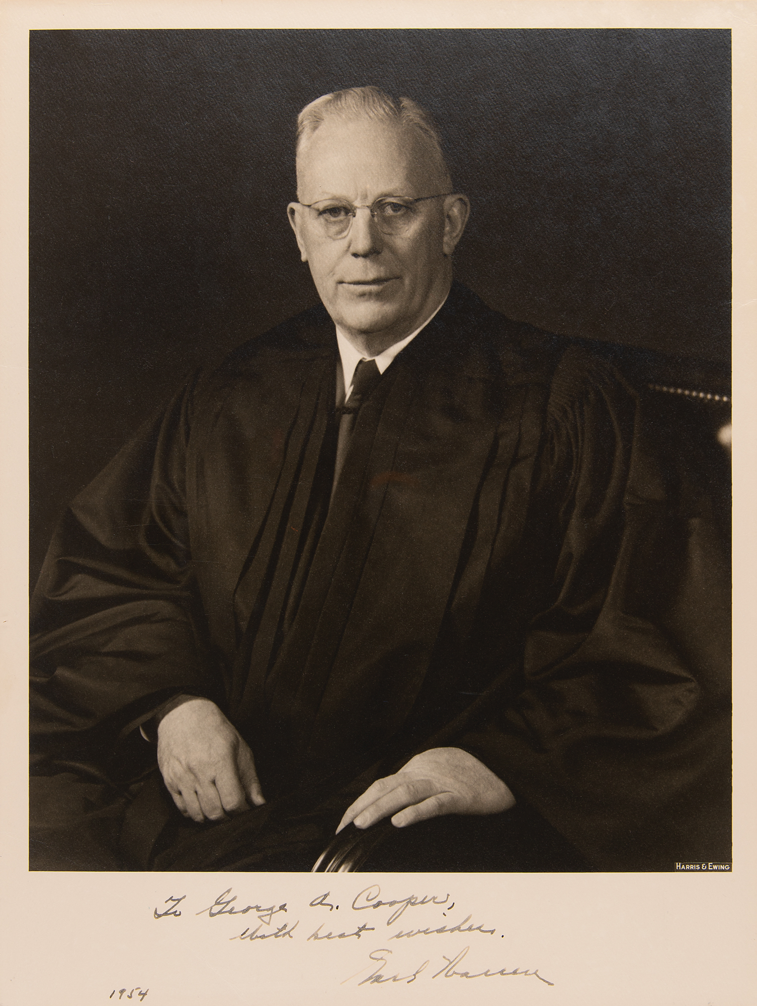 Vintage matte-finish 10.25 x 13.75 Harris & Ewing portrait of Justice Warren, signed and inscribed in the lower border in fountain pen, "To George A. Cooper, With best wishes, Earl Warren, 1954." In fine condition, with faint silvering to the dark background.
