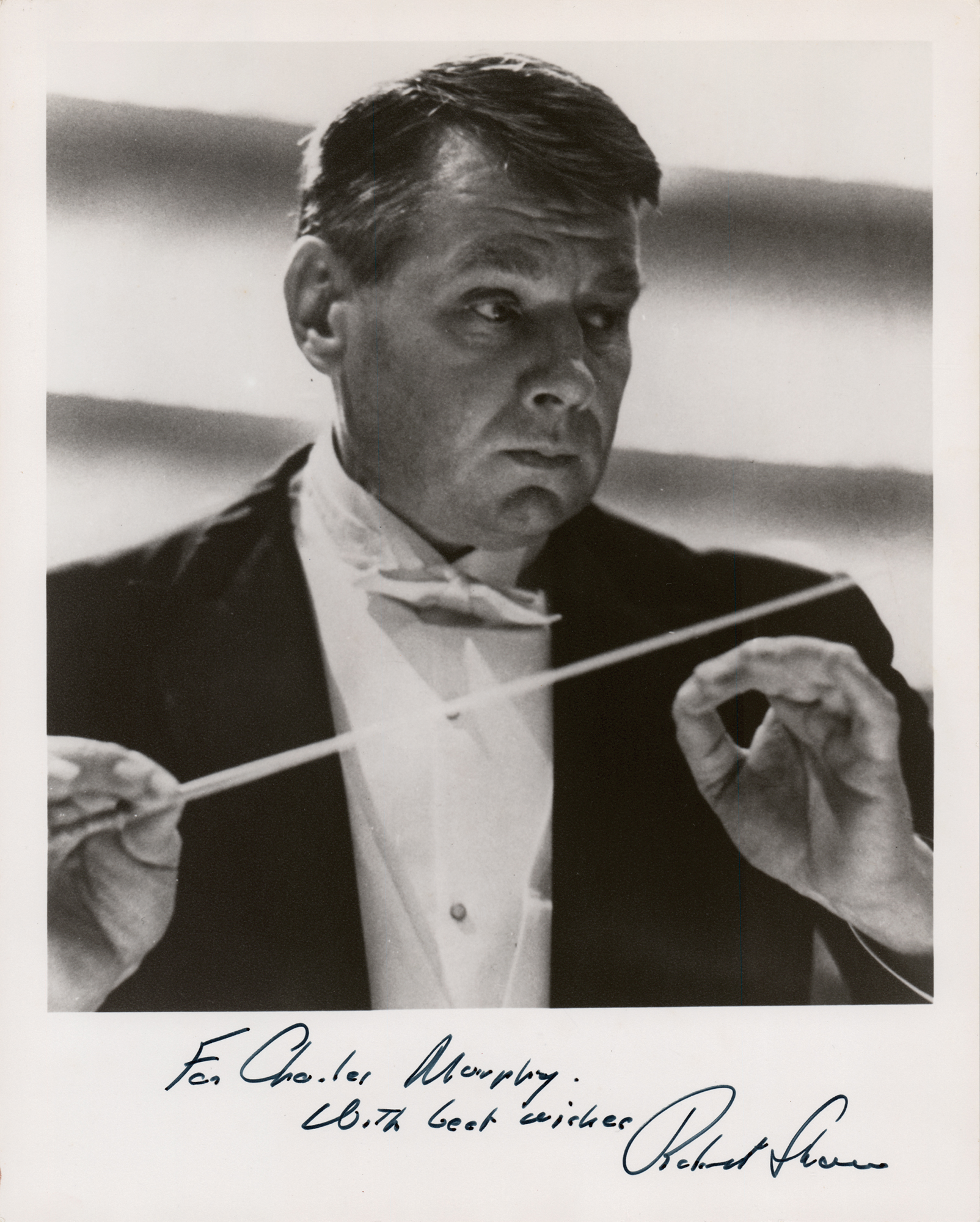 Influential American conductor (1916–1999) most famous for his work with his namesake Chorale, with the Cleveland Orchestra and Chorus, and the Atlanta Symphony Orchestra and Chorus. Matte-finish 8 x 10 photo of the famous conductor, signed and inscribed in the lower border in black felt tip, "For Charles Murphy, With best wishes, Robert Shaw.” In fine condition.