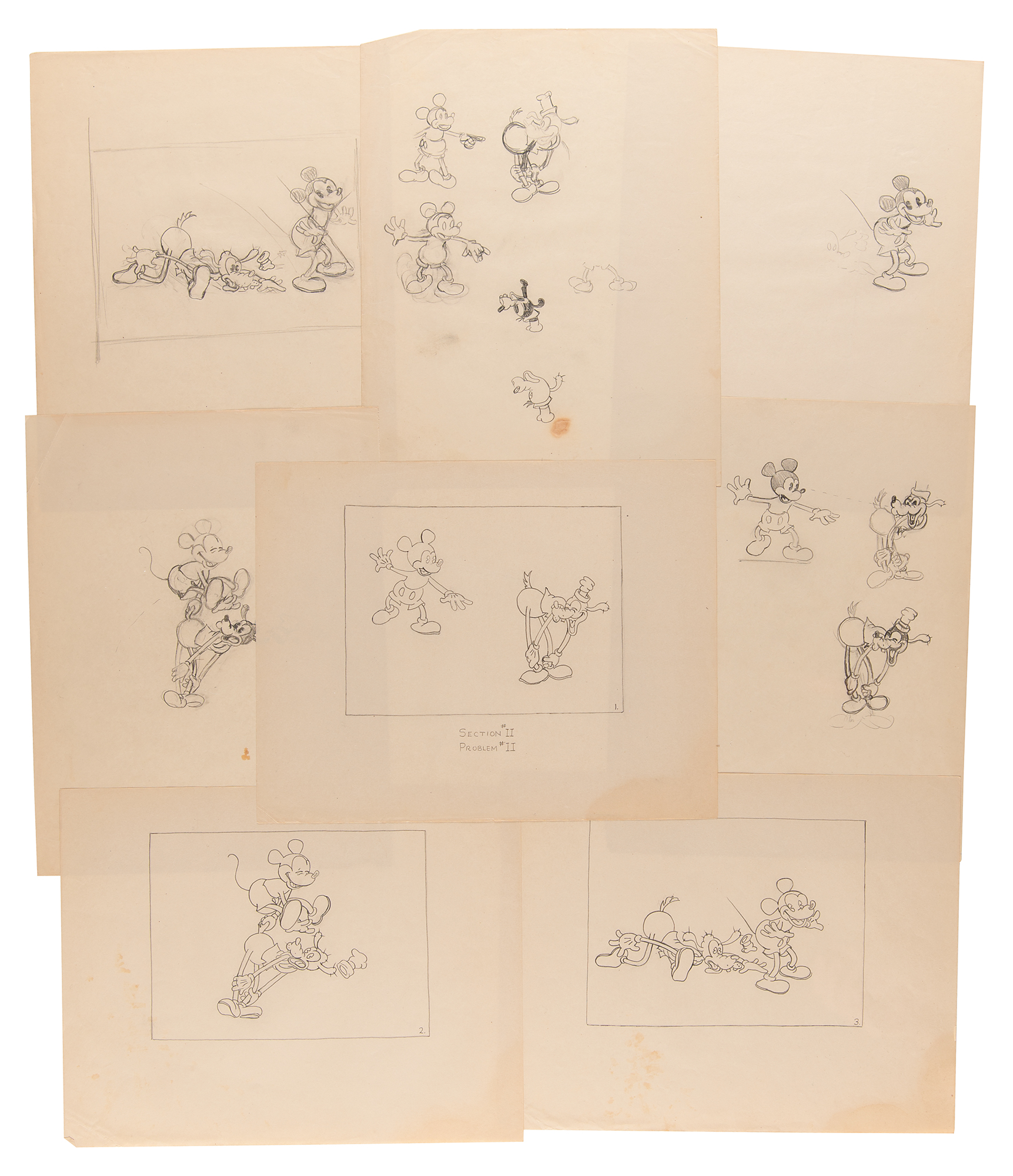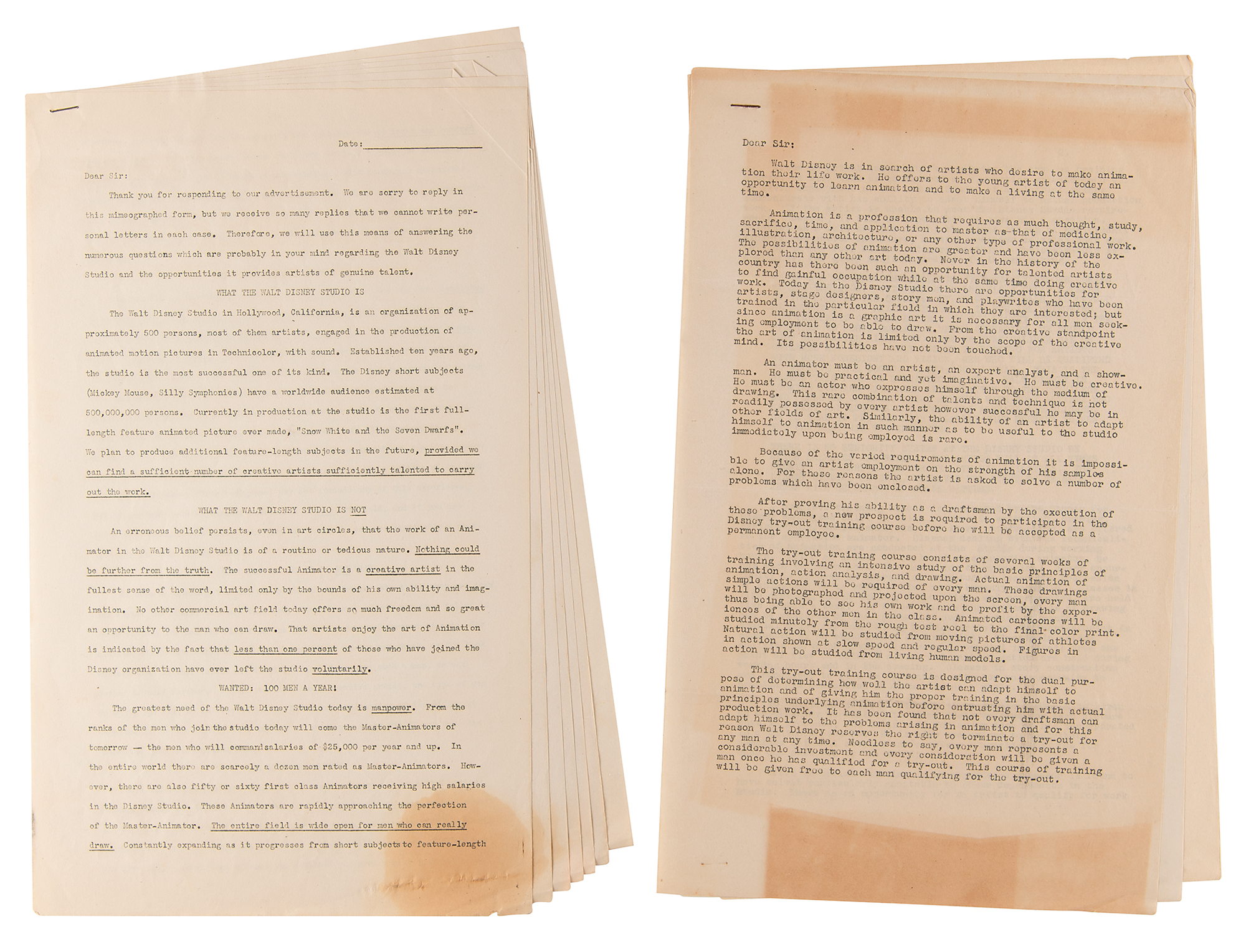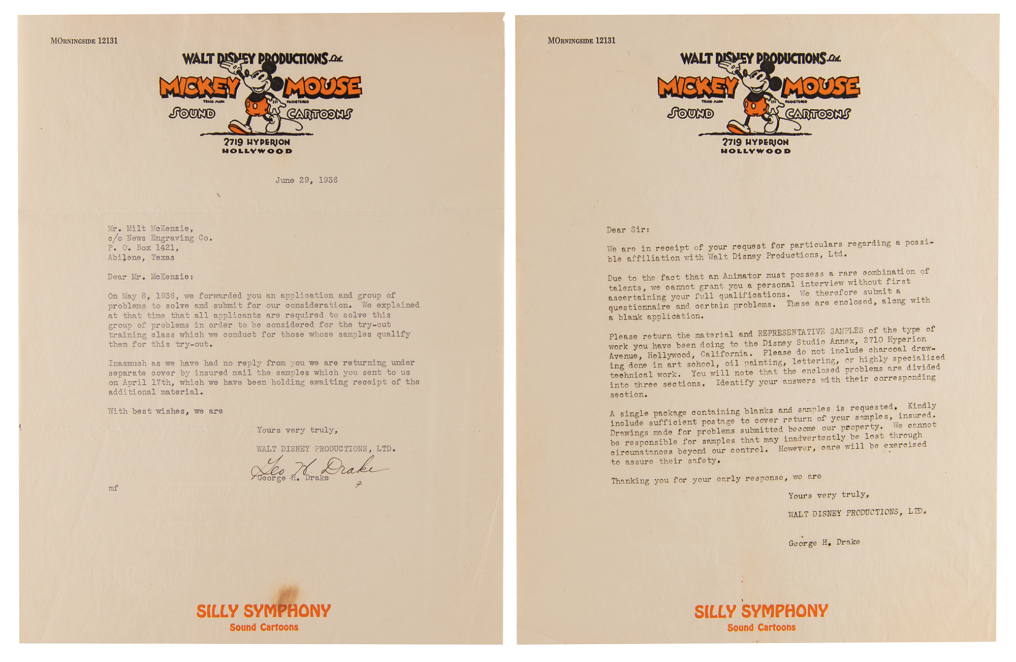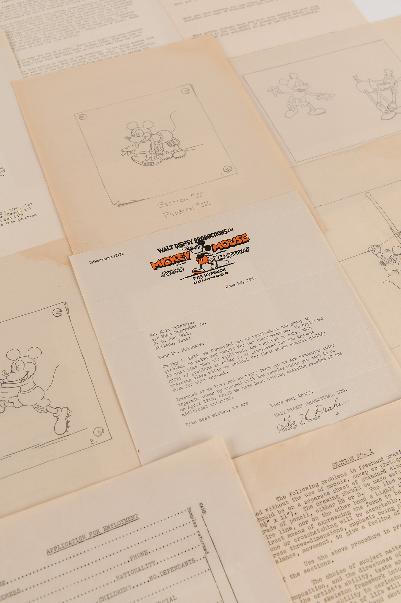 Original unused Walt Disney Productions (WDP) job application package from 1936, issued by veteran studio animator George Drake, who supervised Disney’s training program and recruitment efforts and, according to Walt Disney biographer, Neil Gabler, was ‘the most hated man at Disney.’ Drake mailed the package to Milt McKenzie, an aspiring animator from Texas who ultimately never filled out the included paperwork, which includes: two blank “Application for Employment” sheets; a 7-page form letter from WDP detailing the company’s various departments, roles, procedures, and ethics; a 3-page form recruitment letter from WDP for prospective studio artists; two blank artistic material submission release forms for WDP; and two matching ‘problem’ packets (3 pages and 4 pages), each with three sections requesting that the applicant draw various scenes and sequences, as well as answer questions related to the applicant’s sense of humor, writing experience, and movie preference. Although McKenzie seemingly neglected to complete the first and third sections, he did finish three of the four required drawing sequences from Section II: Mickey walking a tightrope; Mickey and Goofy playing leapfrog; and Mickey kicking a football. McKenzie’s finished drawings for these sections are included with the application, as are two typed letters from Drake, one of which is signed “Geo. H. Drake,” both one page, vintage illustrated 8.5 x 11 WDP letterhead with “Mickey Mouse Sound Cartoons” header. The signed letter, dated June 29, 1936, finds Drake returning McKenzie his drawings “as we have had no reply from you.” The second letter is a form letter sent as part of the application package that was originally sent to McKenzie on May 8, 1936. In overall fine condition, with some scattered stains and edgewear. A fascinating glimpse into Disney’s intensive hiring process dated a year before the company’s breakthrough full-length feature debut, Snow White and the Seven Dwarfs.