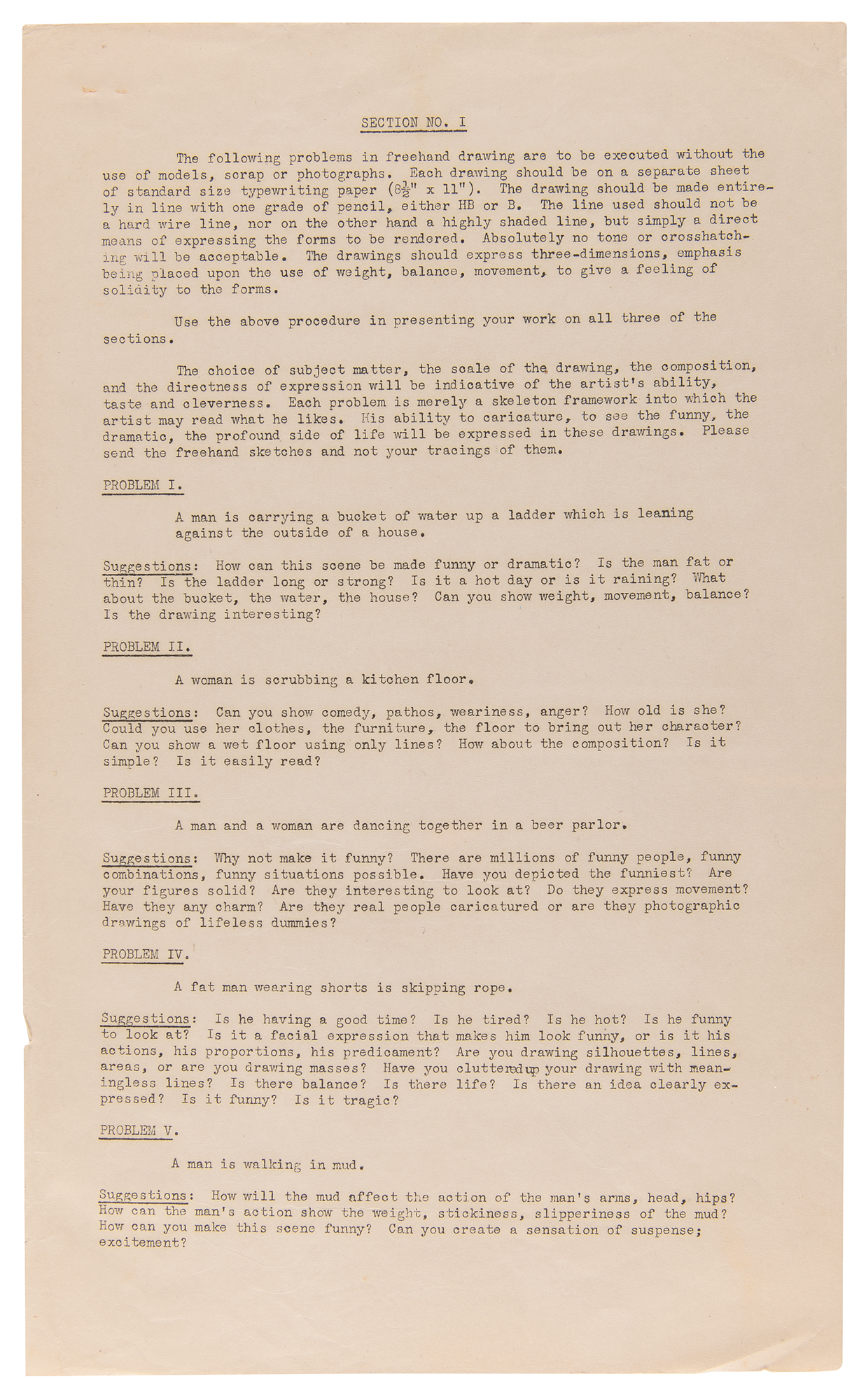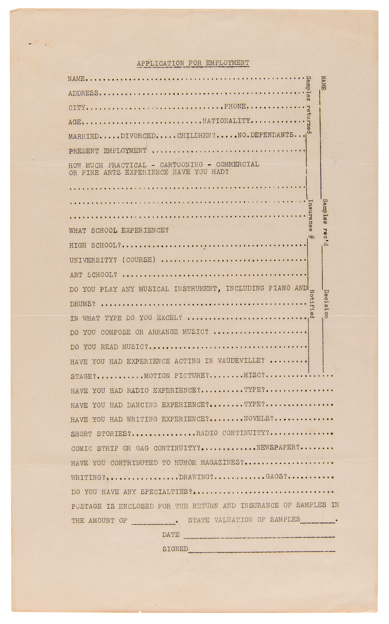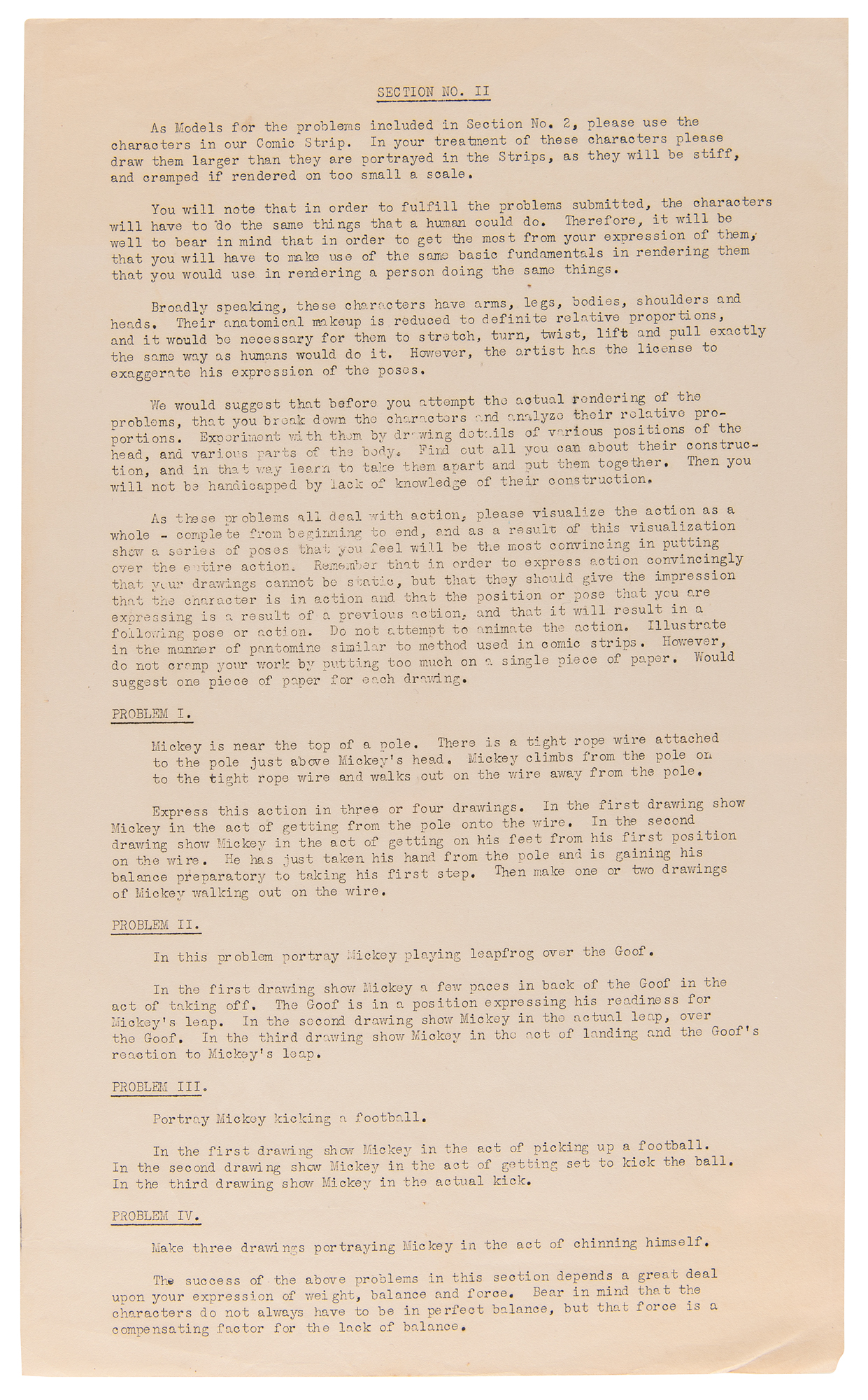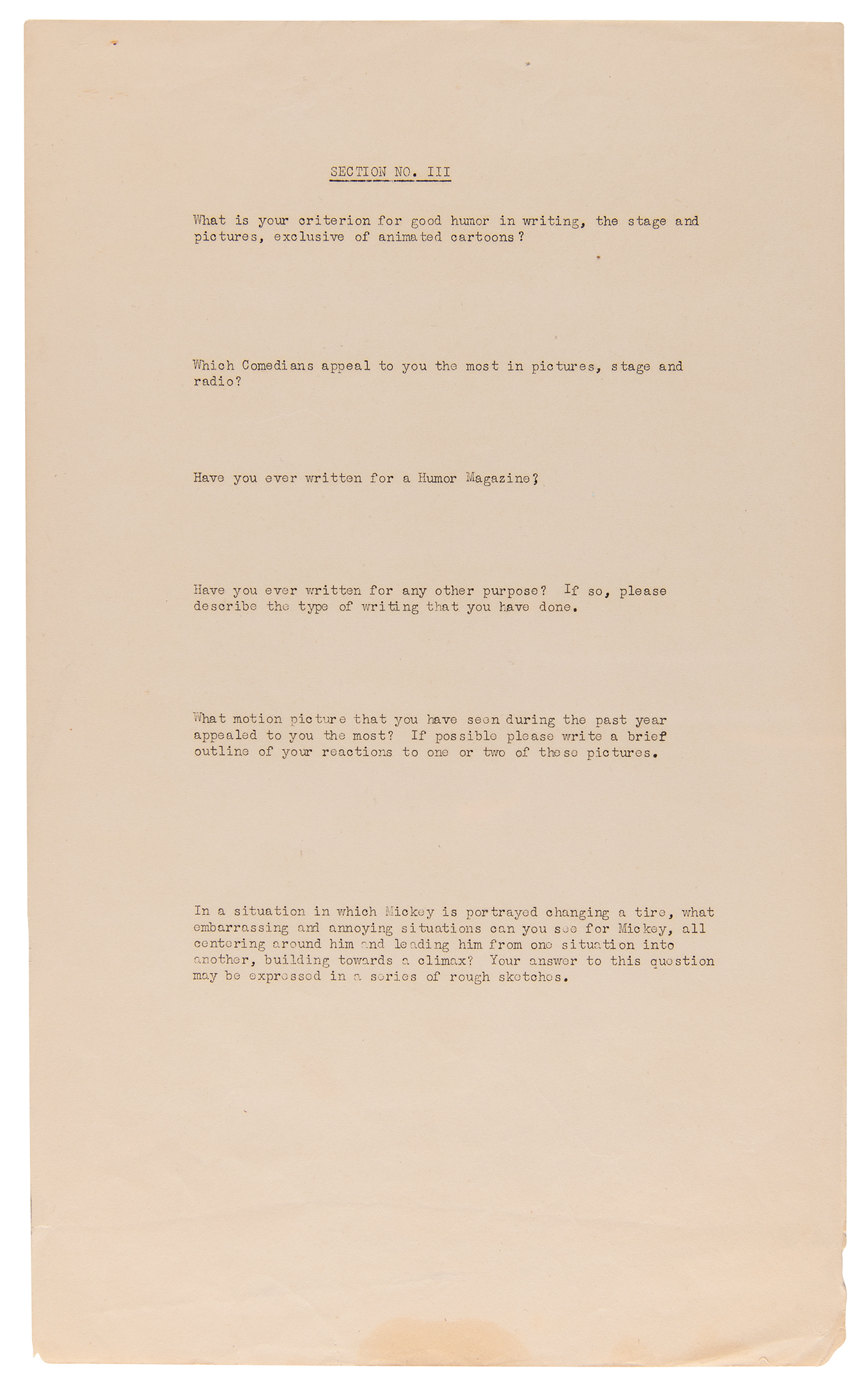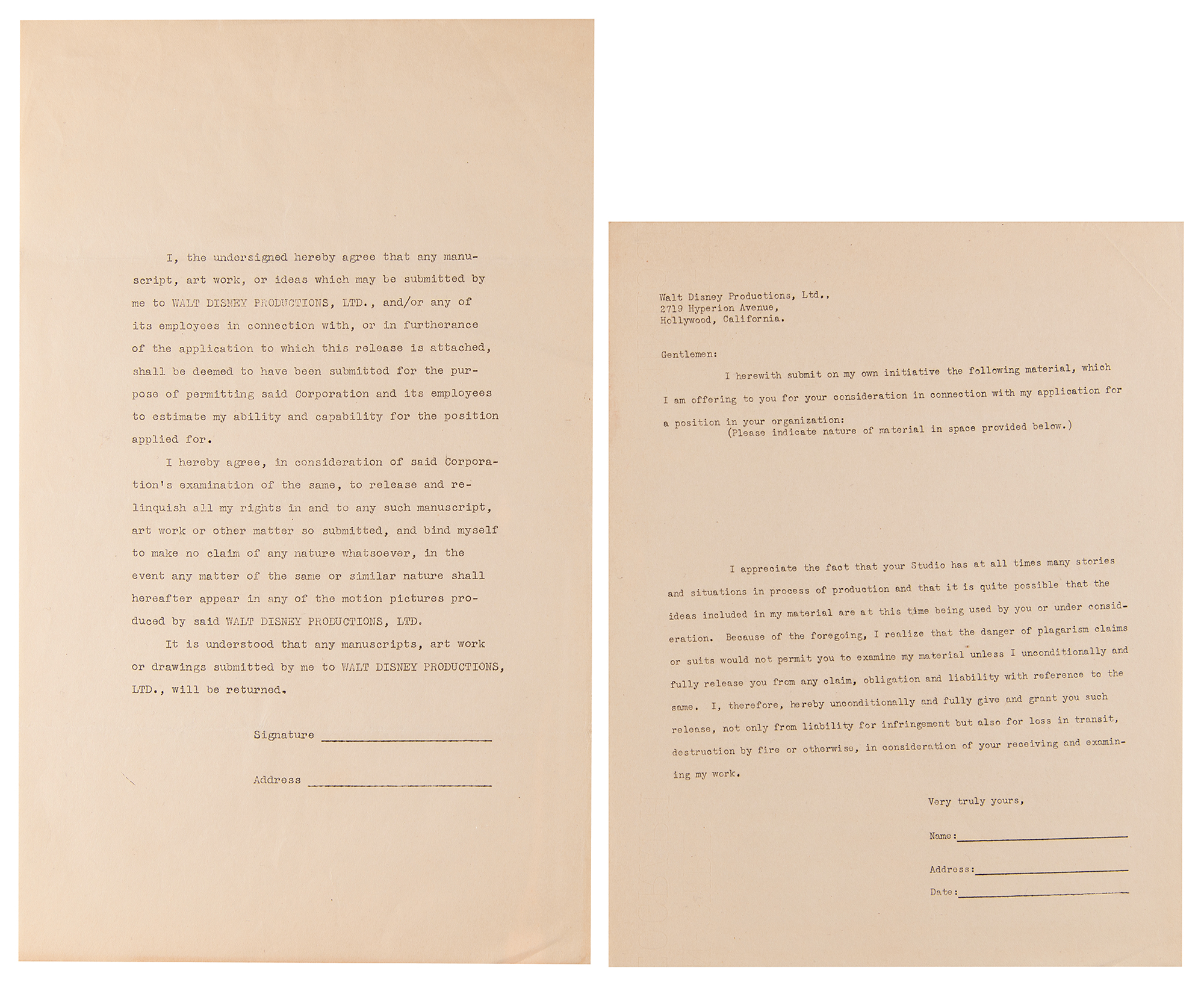 Original unused Walt Disney Productions (WDP) job application package from 1936, issued by veteran studio animator George Drake, who supervised Disney’s training program and recruitment efforts and, according to Walt Disney biographer, Neil Gabler, was ‘the most hated man at Disney.’ Drake mailed the package to Milt McKenzie, an aspiring animator from Texas who ultimately never filled out the included paperwork, which includes: two blank “Application for Employment” sheets; a 7-page form letter from WDP detailing the company’s various departments, roles, procedures, and ethics; a 3-page form recruitment letter from WDP for prospective studio artists; two blank artistic material submission release forms for WDP; and two matching ‘problem’ packets (3 pages and 4 pages), each with three sections requesting that the applicant draw various scenes and sequences, as well as answer questions related to the applicant’s sense of humor, writing experience, and movie preference. Although McKenzie seemingly neglected to complete the first and third sections, he did finish three of the four required drawing sequences from Section II: Mickey walking a tightrope; Mickey and Goofy playing leapfrog; and Mickey kicking a football. McKenzie’s finished drawings for these sections are included with the application, as are two typed letters from Drake, one of which is signed “Geo. H. Drake,” both one page, vintage illustrated 8.5 x 11 WDP letterhead with “Mickey Mouse Sound Cartoons” header. The signed letter, dated June 29, 1936, finds Drake returning McKenzie his drawings “as we have had no reply from you.” The second letter is a form letter sent as part of the application package that was originally sent to McKenzie on May 8, 1936. In overall fine condition, with some scattered stains and edgewear. A fascinating glimpse into Disney’s intensive hiring process dated a year before the company’s breakthrough full-length feature debut, Snow White and the Seven Dwarfs.