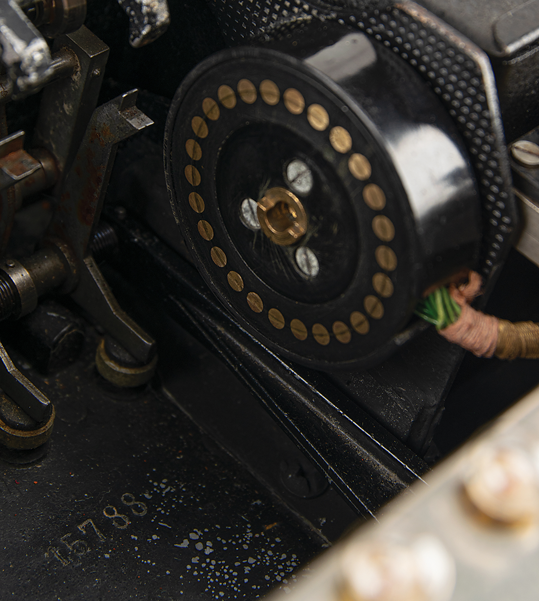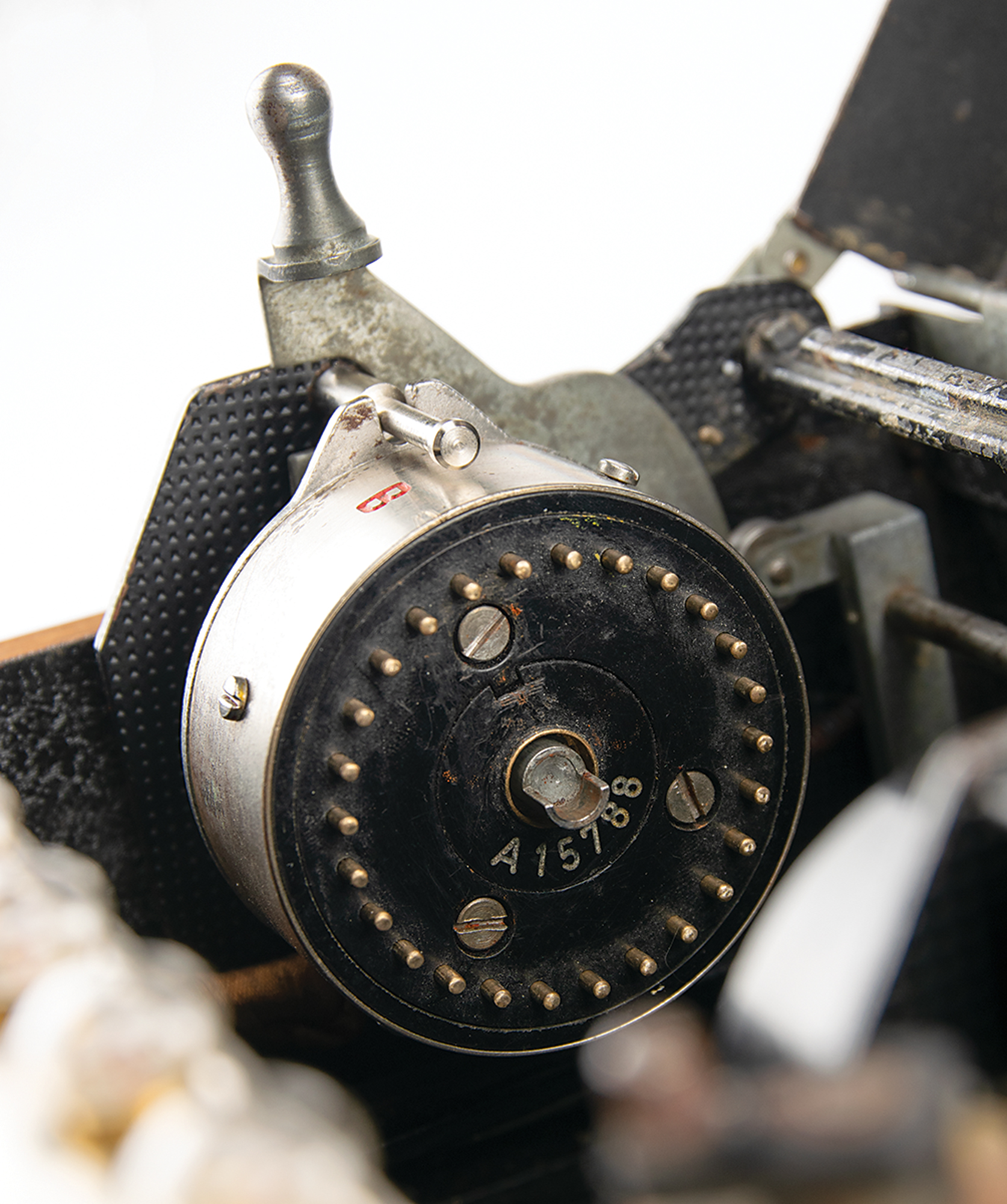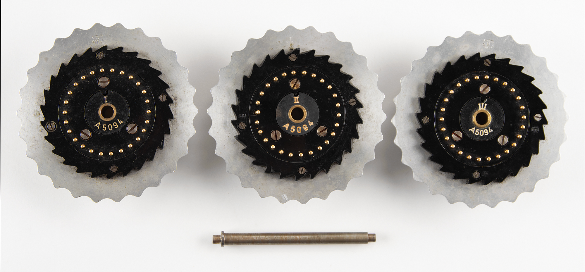 The three included rotors—marked as "I," "II," and "III"—match each other with serial no. "A5094," indicating that they were manufactured in Berlin in 1938. Though the serial numbers of the Enigma machines and their rotors matched when issued, mismatches are typical of field-used machines. Rotors were often swapped out at German communication outposts as they were interchangeable and not dedicated to specific machines. Rotor I appears to be in original condition. Rotors II and III contain original Enigma rotor parts and appear to have been refurbished.