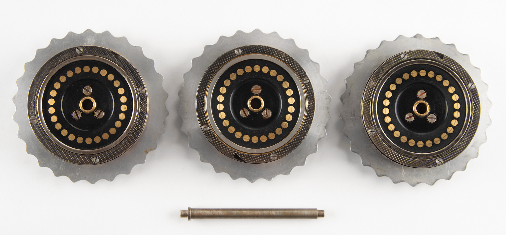 The present rotors demonstrate a progression in design, which evolved as resources became scarce over the course of the war. The earliest rotors featured an all-metal construction, while later examples had Bakelite thumbwheels and ratchet wheels. With aluminum thumbwheels and Bakelite ratchet wheels, these rotors represent an in-between step in this progression. Each rotor can display one of its 26 numerals through the three windows in the machine's cover. They have spring-loaded brass contacts on the sides corresponding to each of the 26 numbers, and they may be arranged in any order on the internal shaft. The specific settings of the rotors and plugboard were determined on a daily basis via a secret codebook that allowed the German forces to synchronize their Enigma machines.