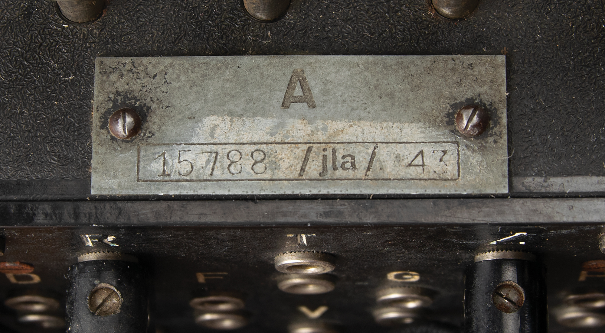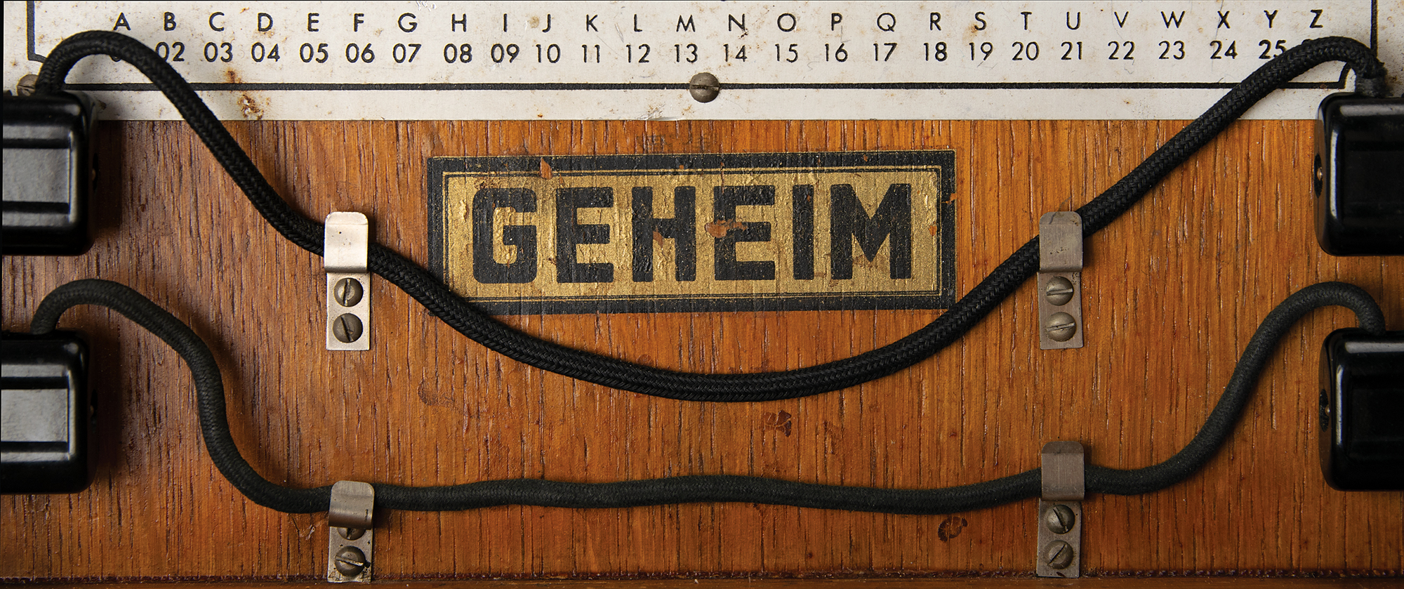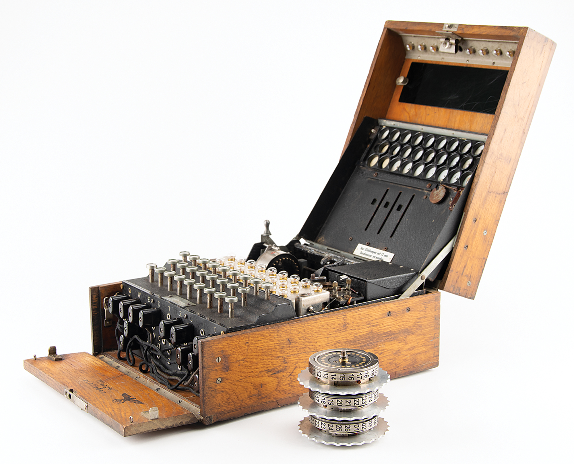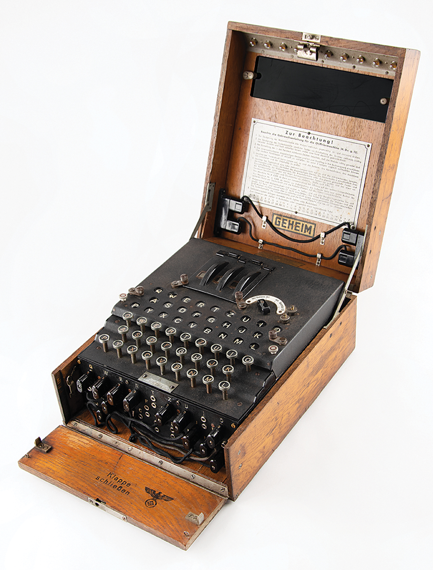 The Enigma machine is housed in its original oak case with hinged lid and hinged front panel, with serial number plate "A15788/jla/43" on the keyboard. Stored inside the lid are two spare Stecker cables, nine spare light bulbs, a replica contrast screen, "Geheim [Secret!]" label, and original "Zur Beachtung" instructions for cleaning, use, and troubleshooting. The lid also retains its uncommon metal-clip message holder at the top. The inner front panel is stamped "Klappe Schliessen [Keep Closed]" and boasts a rare Reichsadler military eagle stamp, rarely seen on surviving Enigma cases. The case also retains its fragile brown leather carrying handle on the back. The finish on the oak box has been lightly restored to stabilize the wood and a few areas of wood delamination on the box have been expertly repaired. The machine and case are in excellent condition and show wear characteristic of use during the war.