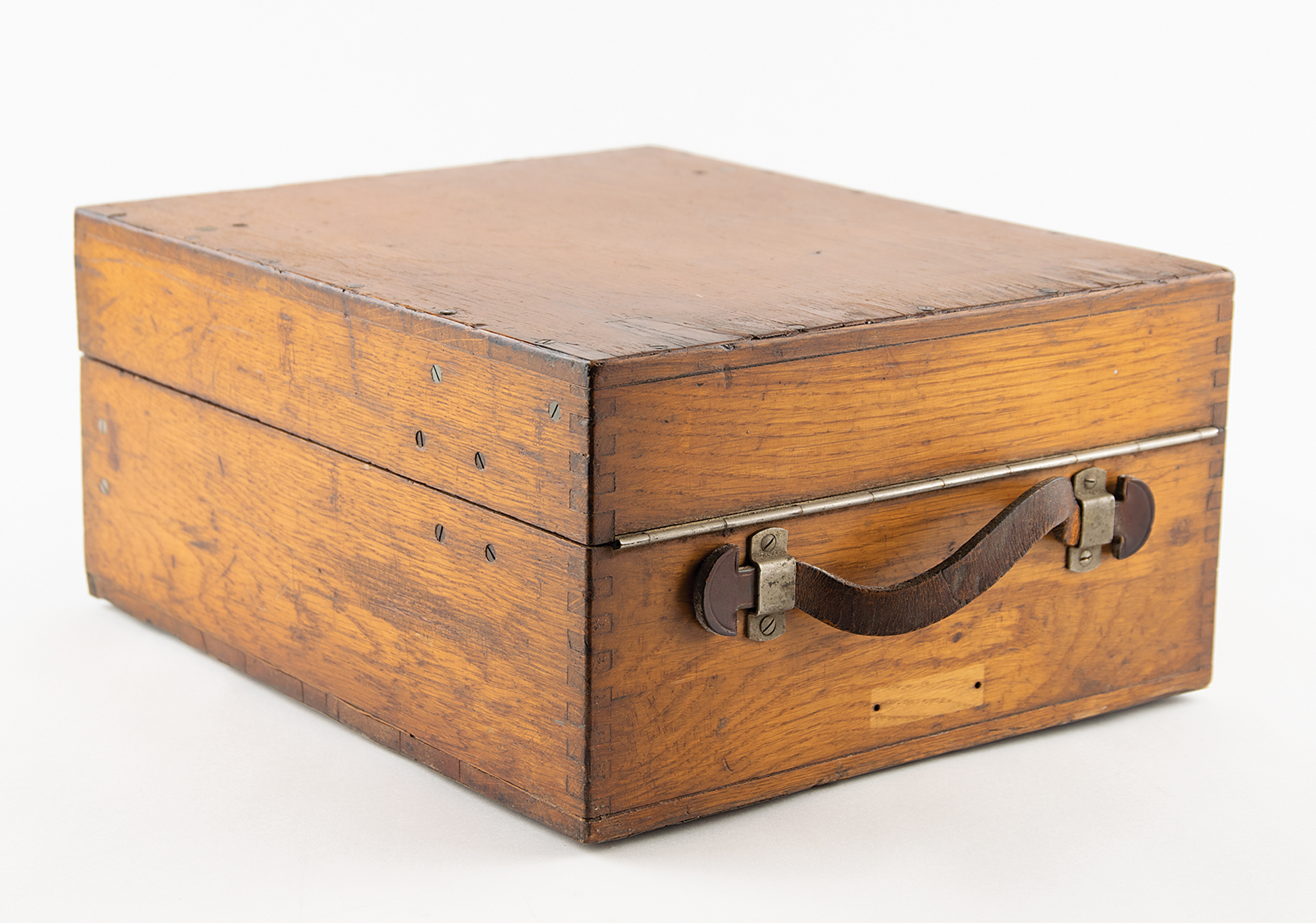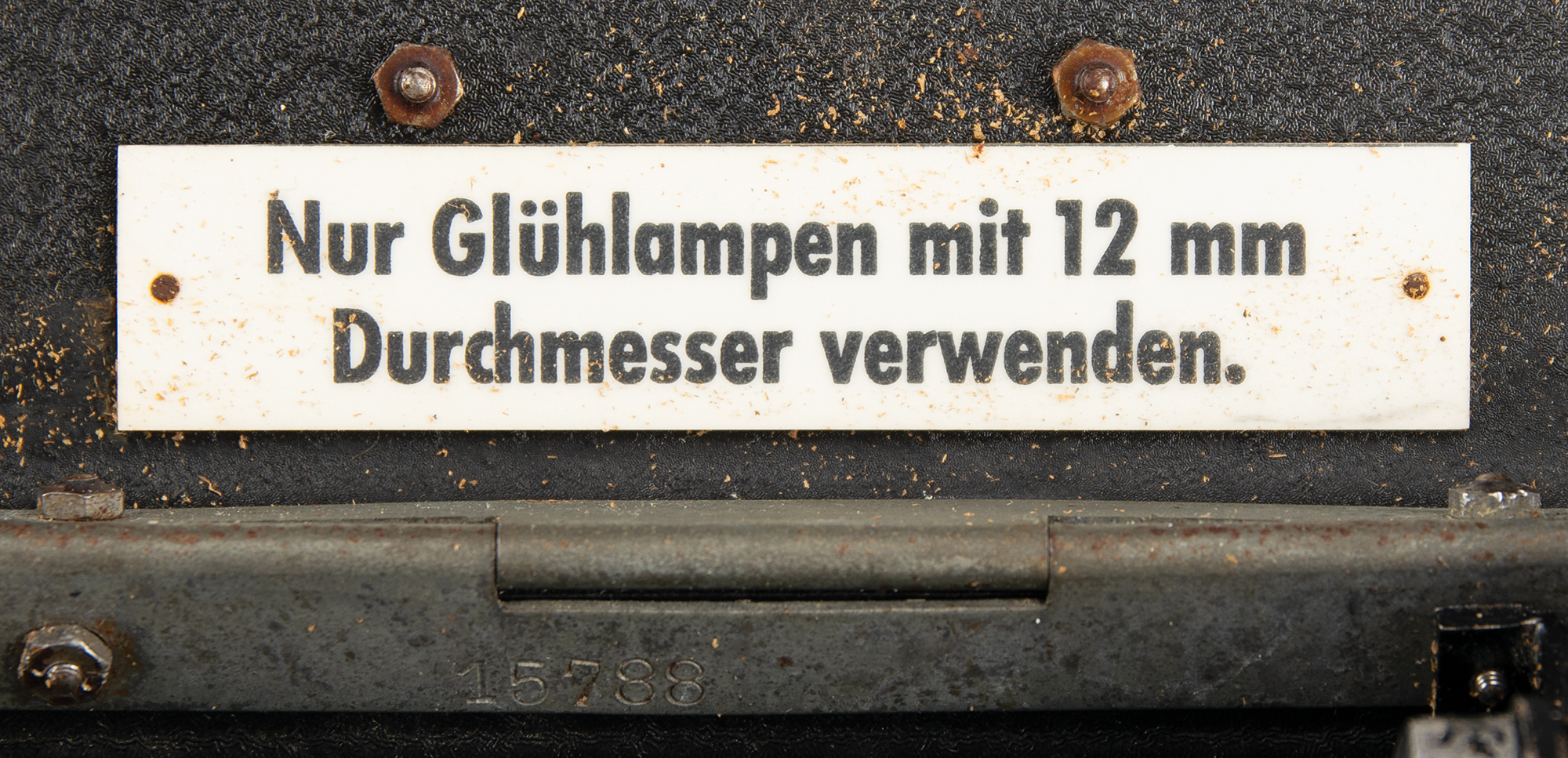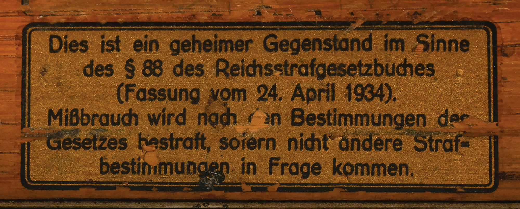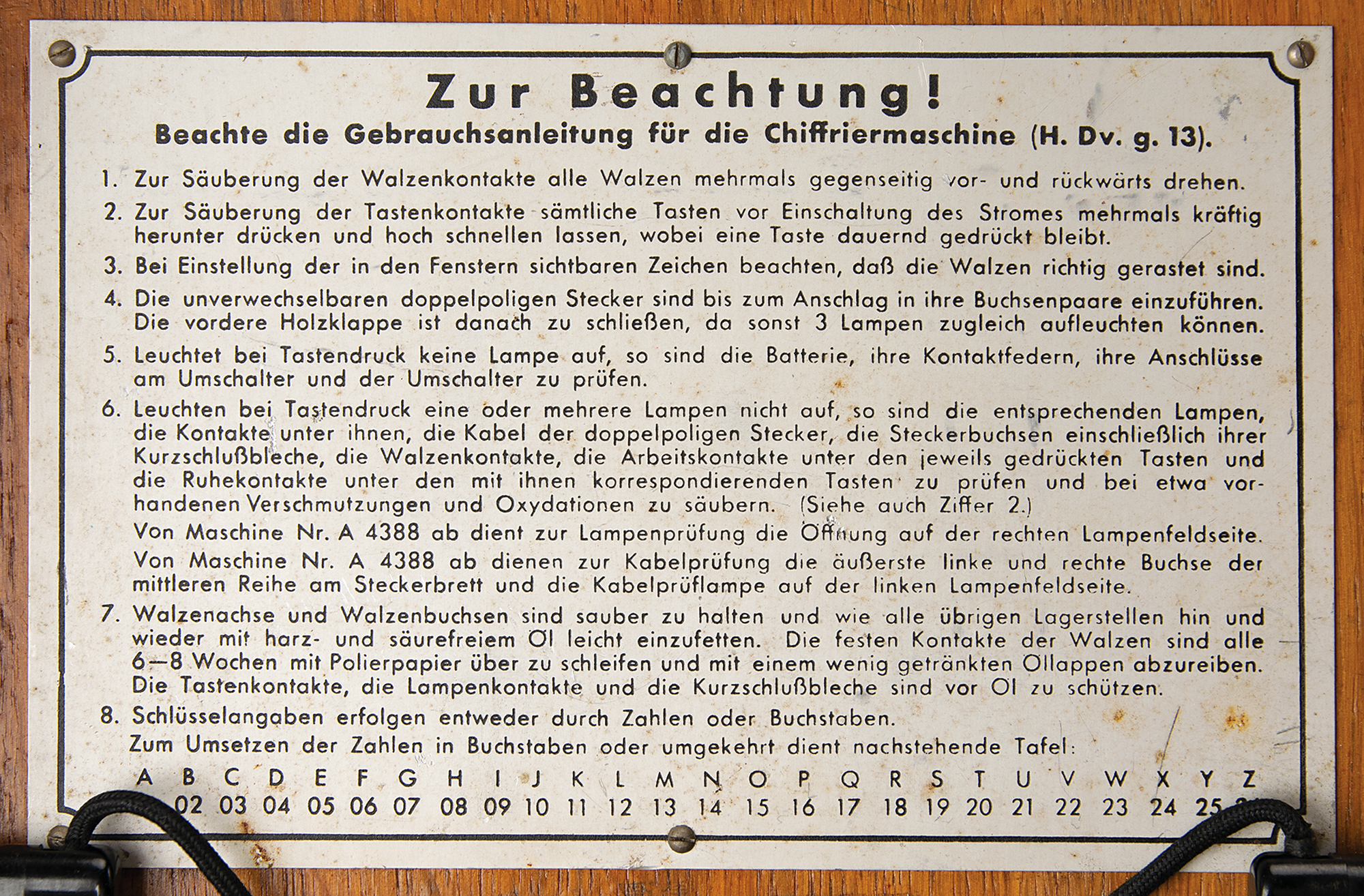 The Enigma machine is housed in its original oak case with hinged lid and hinged front panel, with serial number plate "A15788/jla/43" on the keyboard. Stored inside the lid are two spare Stecker cables, nine spare light bulbs, a replica contrast screen, "Geheim [Secret!]" label, and original "Zur Beachtung" instructions for cleaning, use, and troubleshooting. The lid also retains its uncommon metal-clip message holder at the top. The inner front panel is stamped "Klappe Schliessen [Keep Closed]" and boasts a rare Reichsadler military eagle stamp, rarely seen on surviving Enigma cases. The case also retains its fragile brown leather carrying handle on the back. The finish on the oak box has been lightly restored to stabilize the wood and a few areas of wood delamination on the box have been expertly repaired. The machine and case are in excellent condition and show wear characteristic of use during the war.