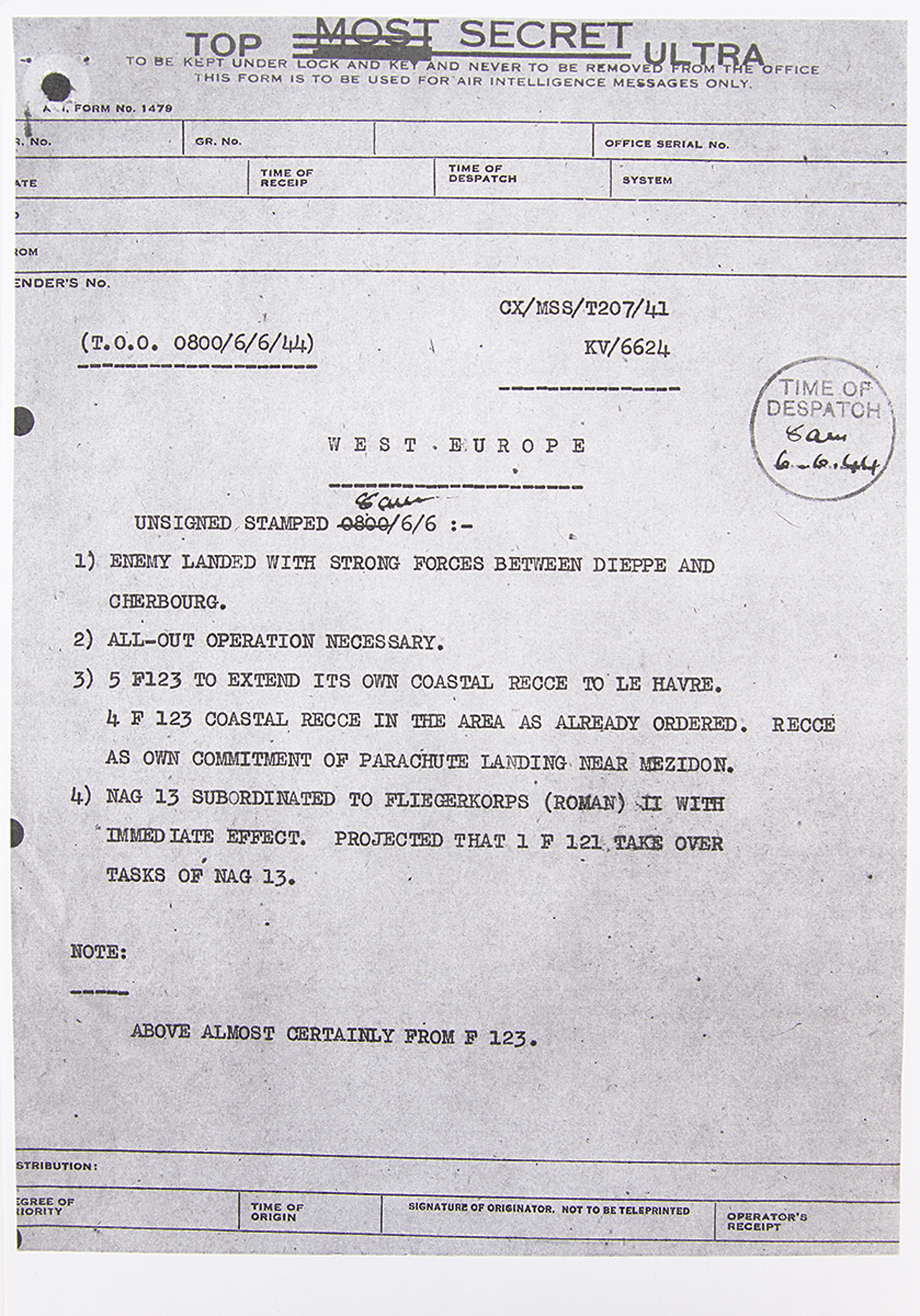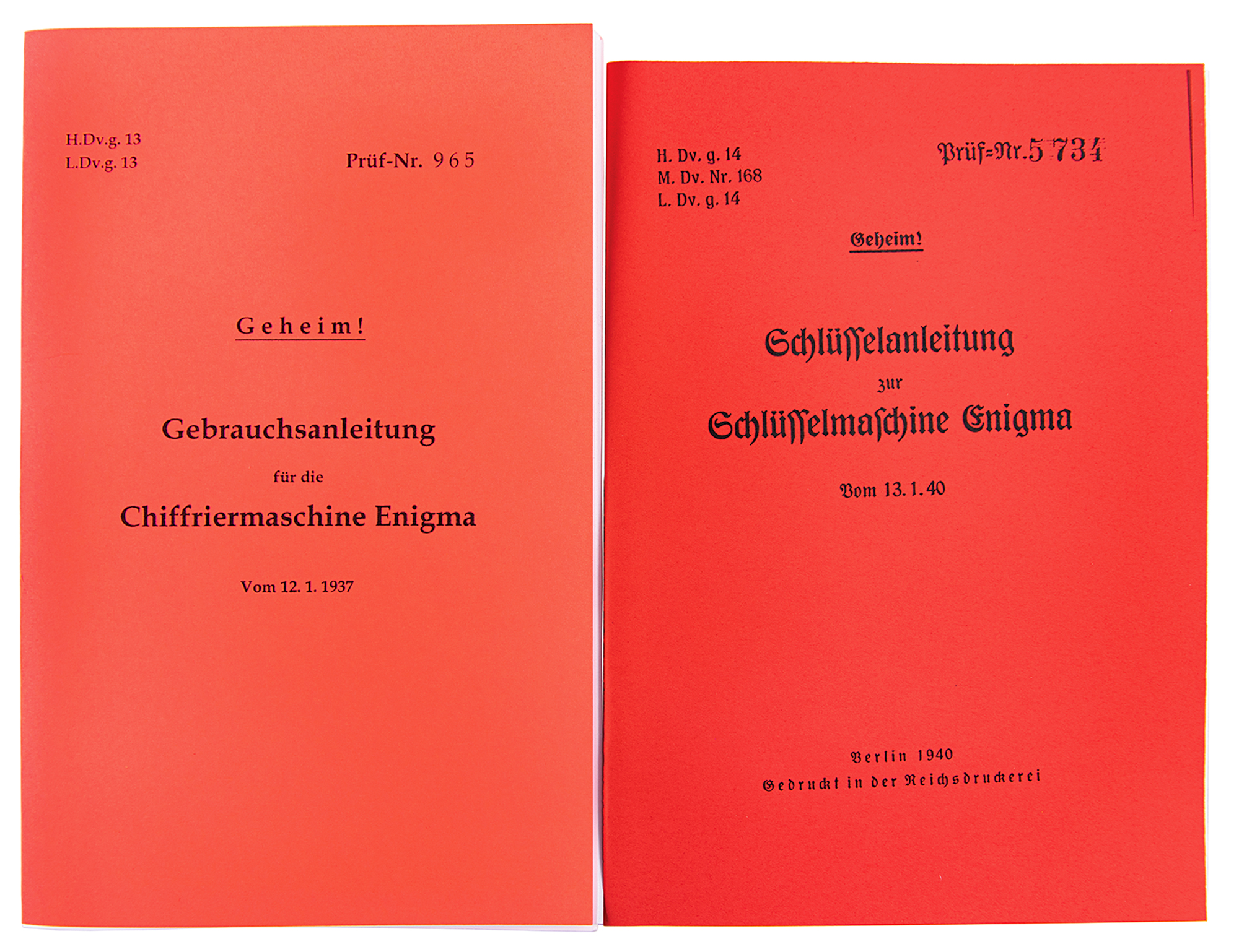 The Enigma machine has a standard German "QWERTZ" keyboard with 26 white-on-black keys, with matching "QWERTZ" lighted display. When a key is pressed, the corresponding encoded letter—as determined by the specific arrangement of the rotor wheels and plugboard—is illuminated. The rightmost rotor steps once each time a key is pressed. At an adjustable point it triggers the middle rotor to step, and so on. Through this mechanism, an easily crackable simple substitution cipher is avoided—letters are not encoded the same way twice. An encoded message would be written down and transmitted, usually via radio telegraph (a standard World War II-era German Wehrmacht Baumuster T1 telegraph key, with severed connector, is included with this machine). In order to decode a message, the Enigma machine on the receiving end would have to be set up with the plugboard and rotor wheels in the same pattern as the sending Enigma: when the encoded message was typed in, the decoded letters would light up, revealing the secret message one character at a time. Since no original batteries have survived, this machine has been modified to accept two modern C batteries. Also includes two reprints of the Enigma operator manuals, and three booklets on the history of the Enigma Machine.