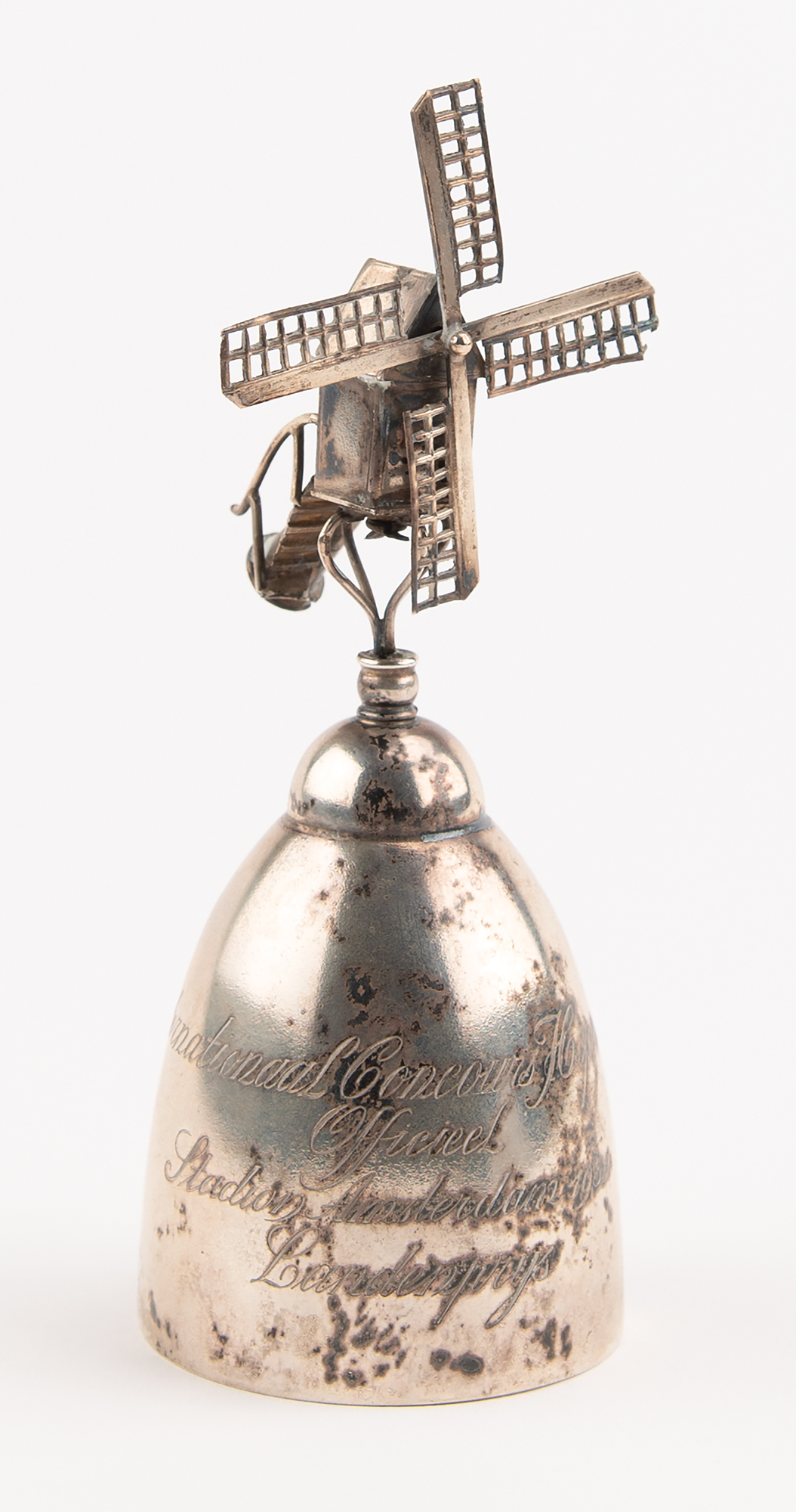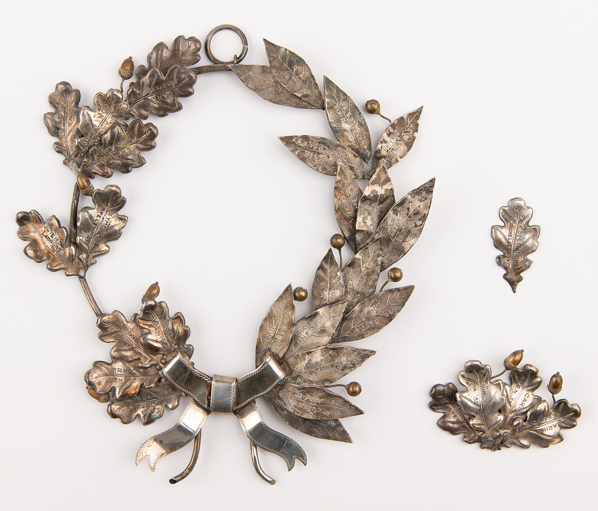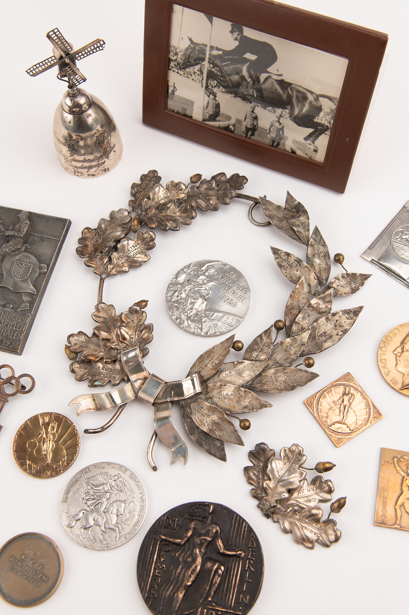 Other items include: a silver windmill "Landenpris [Country Prize]" trophy from the 1934 "Concours Hippique International [International Horse Show]" held in Amsterdam; four Dutch National Olympic Committee/Dutch Sports Federation (NOC/NSF) 'Olympic Day' medals from 1933, 1934, 1935, and 1936; a 1936 "Concours Hippique International [International Horse Show]" medal with King Leopold of Belgium on the front; a 1936 "Olympische Proef [Olympic Trial]" first-place medal from 1936, engraved with the name of his horse, "Trixie," issued by the Koninklijke Militaire Sportvereniging [Dutch Royal Military Sports Club]; a 1936 "Utrecht" medal plaque from an equestrian contest in the Netherlands; a zinc plaque portraying a rider in medieval armor, dedicated by the Aachen-Laurensberger Racing Club to the riders at the 1936 Olympic Games in Berlin and at the international equestrian tournament in Bad Aachen; an attractive silver-tone metal laurel wreath sculpture, with each leaf engraved with the name of one of Greter's horses and an associated competition (with one cluster, and one single leaf detached from the wire frame); and a vintage photograph of Greter on a leaping horse, displayed in a leather frame.