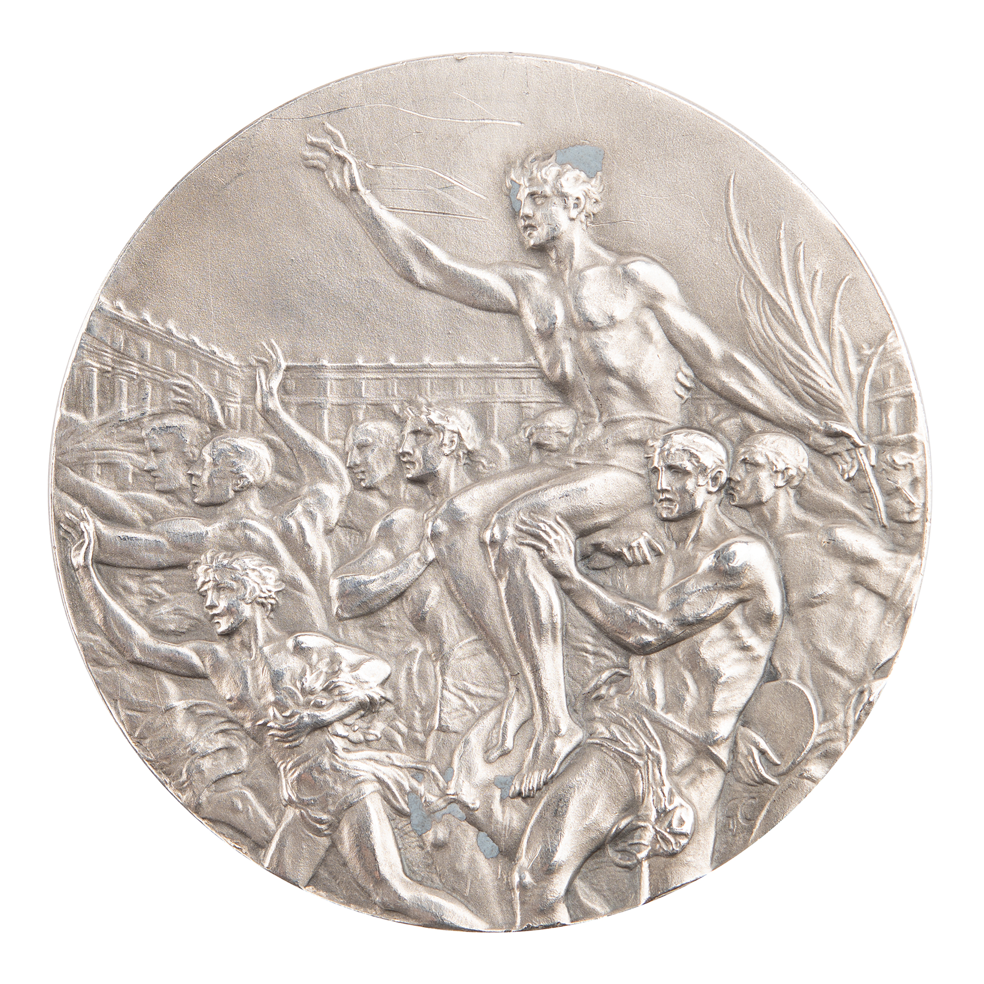 - Highly appealing winner’s medal issued for the Berlin 1936 Summer Olympics. Silver, 55 mm, 72 gm, by Giuseppe Cassioli. The front, inscribed, “XI. Olympiade, Berlin, 1936,” features a ‘Seated Victory’ with the Coliseum in the background; the reverse portrays a winner carried by jubilant athletes. Stamped on the edge, "B. H. Mayer, Pforzheim, 990." Greter and his horse Ernica won this silver medal as part of the Dutch show jumping team, after finishing sixth in the individual jumping competition.