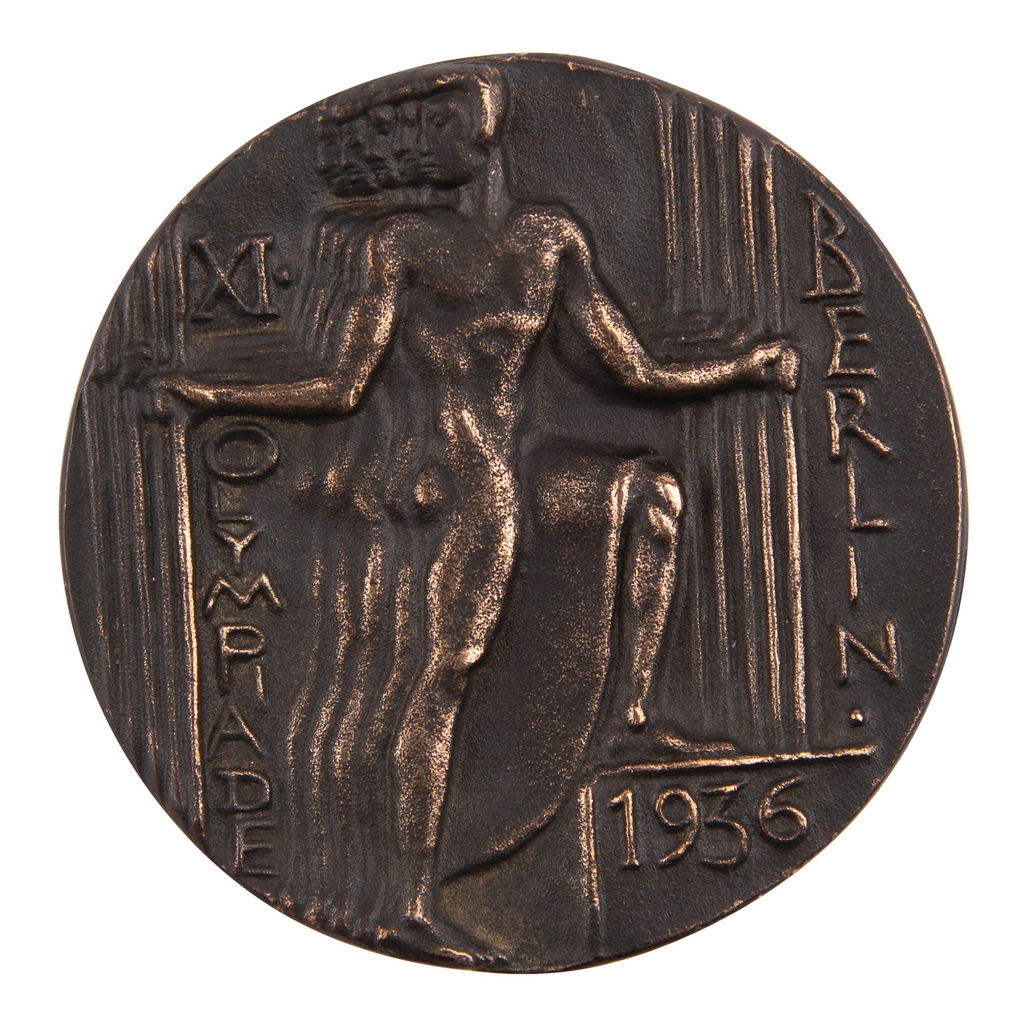 - Participation medal issued for the Berlin 1936 Summer Olympics. Brown bronze, 70 mm, 114 gm, by Otto Placzek. The front depicts five athletes, representing the five continents, pulling the ropes of the Olympic bell, with raised text, "XI Olympiade, Berlin, 1936"; the reverse bears the Olympic bell embossed with the German eagle gripping the Olympic rings within five concentric circles, and the name of the designer on the outer edge.