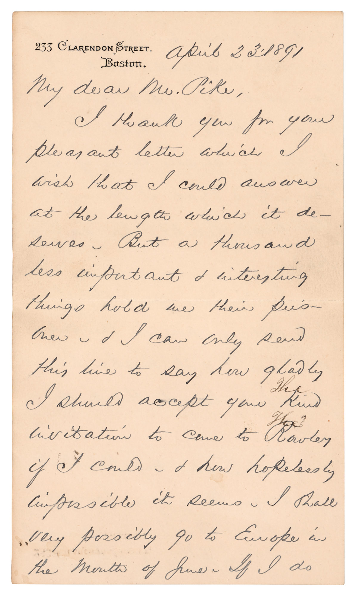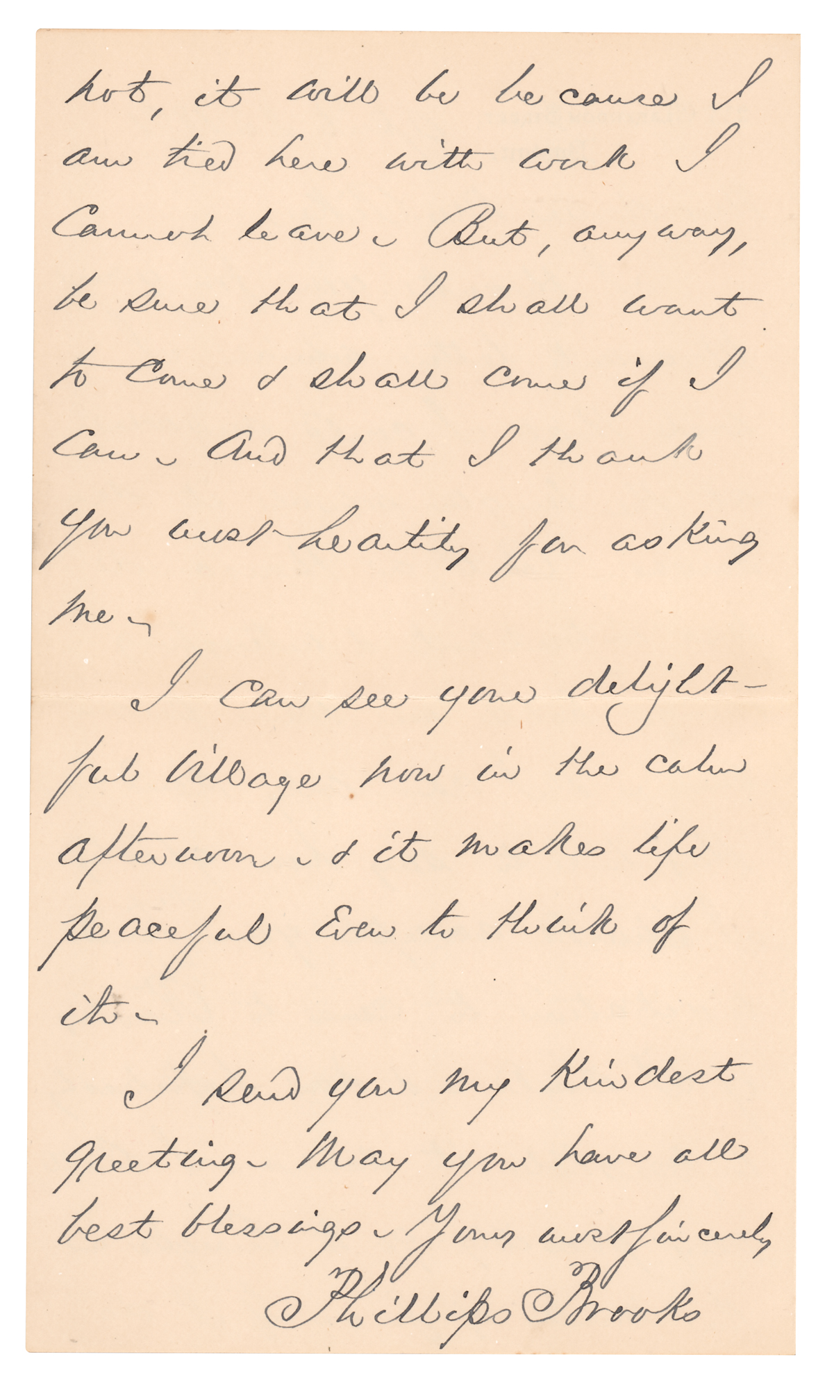 American clergyman (1835-1893) best known as the lyricist of the popular Christmas carol 'O Little Town of Bethlehem.' ALS, one page both sides, 4.5 x 8, April 23, 1891. Handwritten letter from Boston to "Mr. Pike," in part: "I thank you for your pleasant letter which I wish I could answer at the length which it deserves. But a thousand less important & interesting things hold me their prisoner & I can only send this line to say how gladly I should accept your kind invitation to come to Rowley if I could & how hopelessly impossible it seems. I shall very possibly go to Europe in the month of June. If I do not, it will be because I am tied here with work I cannot leave. But, anyway, be sure that I still want to come & shall come if I can. And that I thank you most heartily for asking me. I can see your delightful village now in the calm afternoon & it makes Life peaceful even to think of it. I send you my kindest greeting. May you have all best blessings." In fine condition.