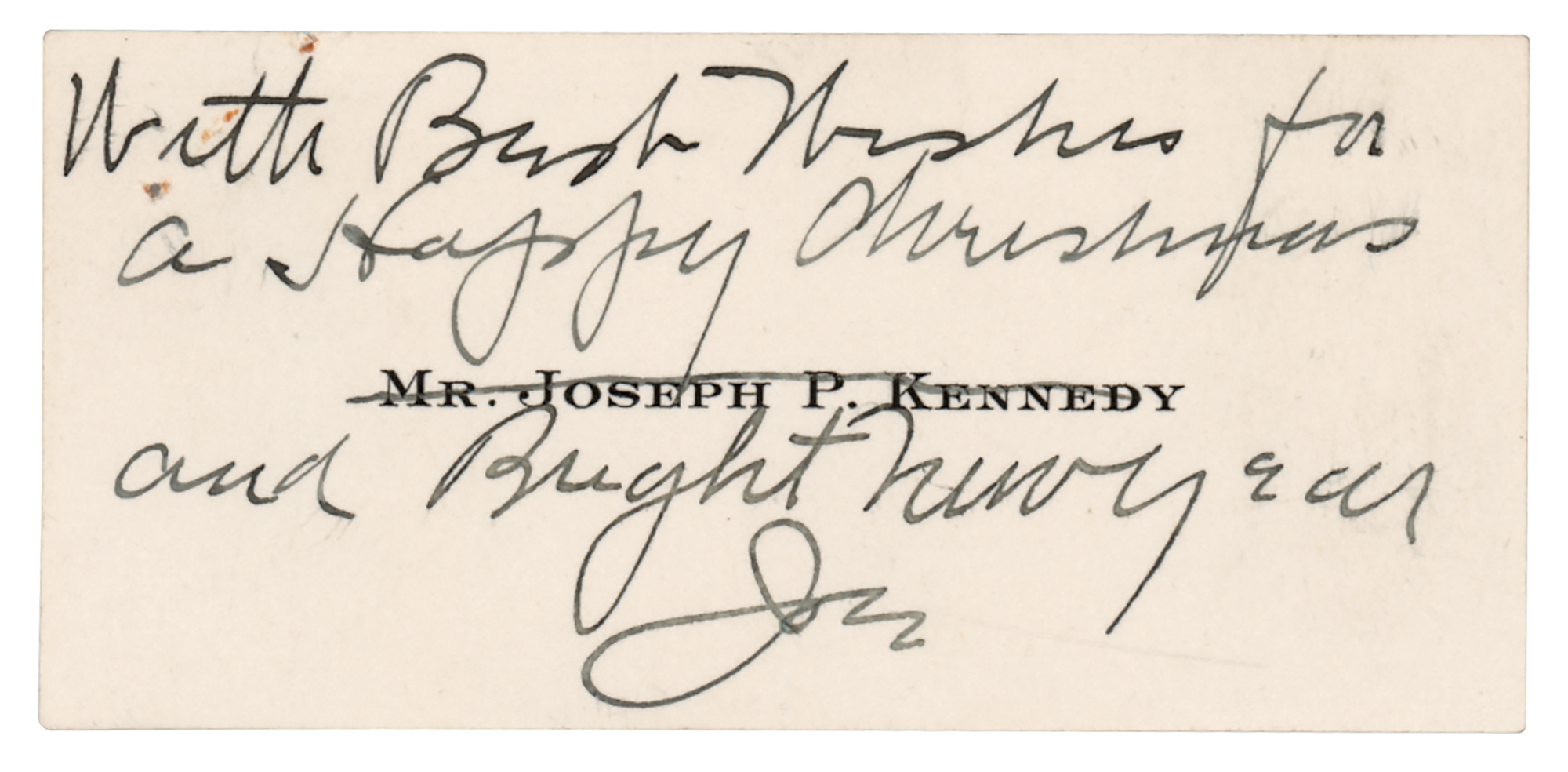 Patriarch of the fabled family of American politicians (1888–1969) who served as American ambassador to Great Britain from 1938 to 1940. One of the Kennedy patriarch’s scarce personal calling cards, 3 x 1.5, signed in black ink, “With best wishes for a Happy Christmas & Bright New Year,” with Kennedy crossing out his printed first name, and signing underneath, “Joe.” In fine condition, with two small staple holes at the top left. Of particular interest to the advanced Kennedy collector, as this format is exceedingly uncommon.