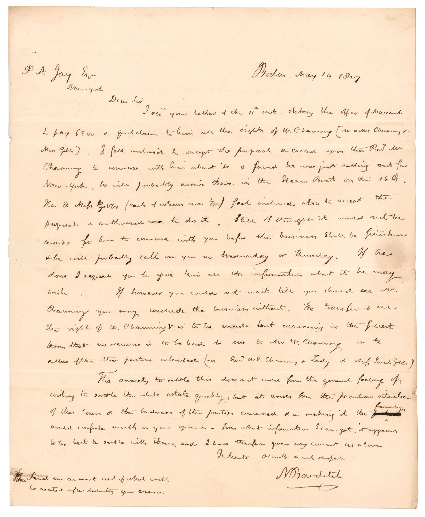 American mathematician remembered as the founder of modern maritime navigation (1773–1838); his influential encyclopedia, The American Practical Navigator, became a standard handbook on oceanography and meteorology. ALS signed “N. Bowditch,” one page, 8 x 9.75, May 14, 1807. Handwritten letter to Peter Augustus Jay, son of statesman John Jay, regarding the settlement of a matter involving the family of noted reformer Rev. William E. Channing. In part: "I received your letter…stating the offer of Macomb to pay 6,500 & quit claim to him all the rights of W. Channing (Mr. & Mrs. Channing, & Miss. Gibbs)…I called upon the Rev. Mr. Channing to converse with him about it…He & Miss Gibbs (each of whom own ¼) feel inclined also to accept the proposal & authorize me to do it. Still I thought it would not be amiss for him to converse with you before the business is finished…If you could not wait till you should see Mr. Channing you may conclude the business without. The transfer of all the right of W. Channing & is to be made but expressing in the fullest terms that no recourse is to be had to me, to Mr. W. Channing or to [any] of the other parties interested (viz Rev. W. E. Channing & Lady, & Miss Sarah Gibbs). The anxiety to settle this does not come from the general feeling of wishing to settle the whole estate quickly, but it comes from the peculiar situation of this loan & the sadness of the parties concerned & in making it the family would confide much in your opinion." In fine condition. Accompanied by an engraved portrait of Bowditch.