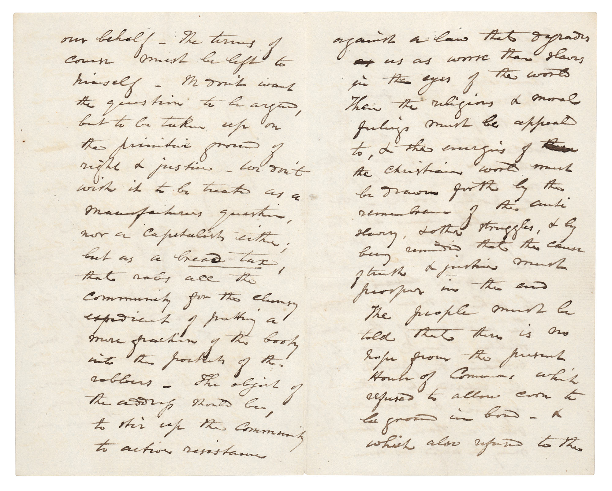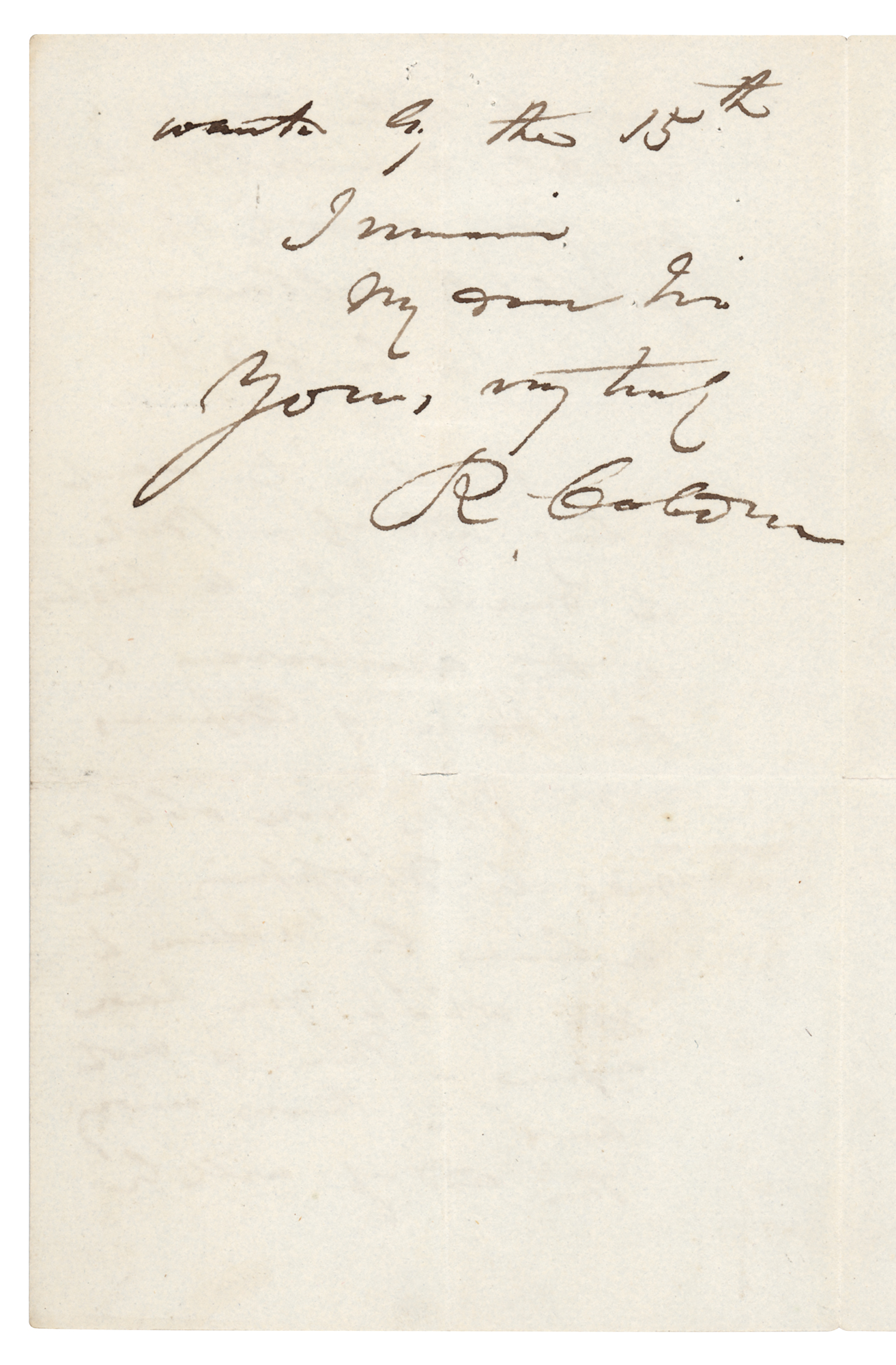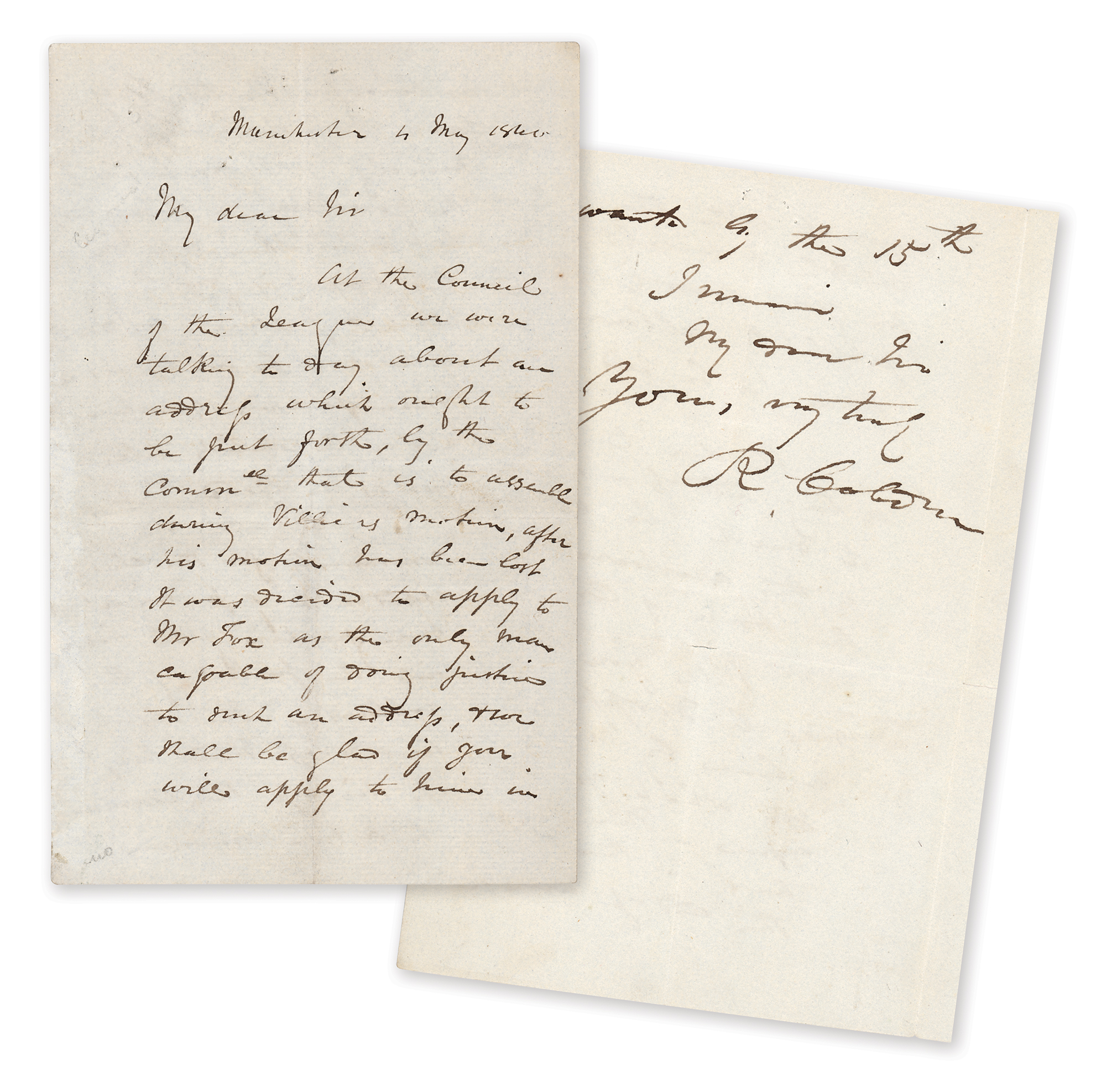 Influential British statesman (1804-1865) associated with John Bright in the formation of the Anti-Corn Law League; an immensely important figure in classical-liberal thought in economics and international affairs. ALS signed “R. Cobden,” six pages two sets of adjoining sheets, 4.5 x 7.25, May 4, 1860. Handwritten letter to a gentleman, with excellent content. In part: "At the Council of the [Anti-Corn] League…it was decided to apply to Mr. Fox as the only man capable of doing justice to such an address…We don’t want the question to be argued, but to be taken up on the primitive ground of right & justice…that robs all the community for the clumsy expedient of putting a mere fraction of the booty into the pockets of the robbers. The object of the address should be, to stir up the community to active resistance against a law that degrades us as worse than slaves in the eyes of the world. Then the religious & moral feelings…of the Christians worth much to be drawn forth by the remembrance of the anti-slavery, & other struggles…the cause of truth & justice must proper in the end. The people must be told that there is no hope from the present House of Commons, which refused to allow corn to be grown…& refused to allow the Irish to import foreign flour at a time when their own flour was breeding typhus fever!…the country’s salvation must be worked out at the…polling booth. We may also glower at the despair which is seizing the minds of many…The increase of the armed military & civil forces to restrain the people might be referred to…as an argument with the middle & wealthy classes for giving content to the people by allowing them to be fed…[The address] must be blister to the aristocracy & the House of Commons." In fine condition.