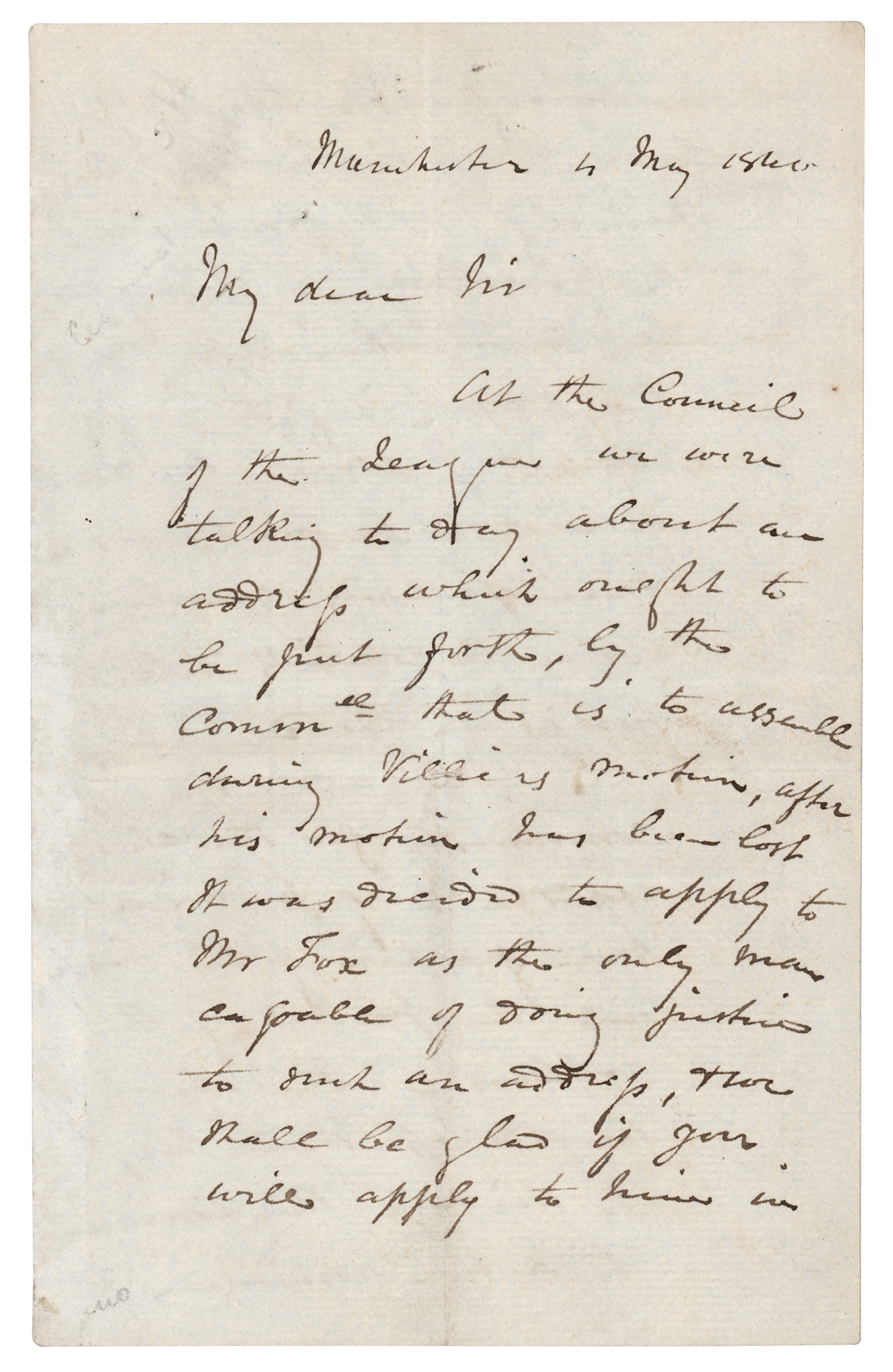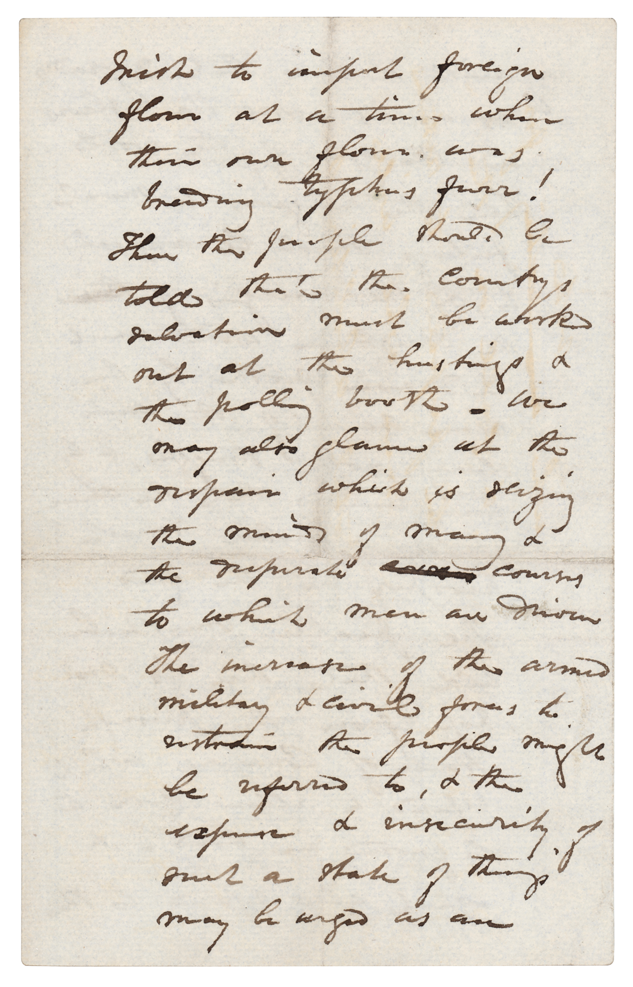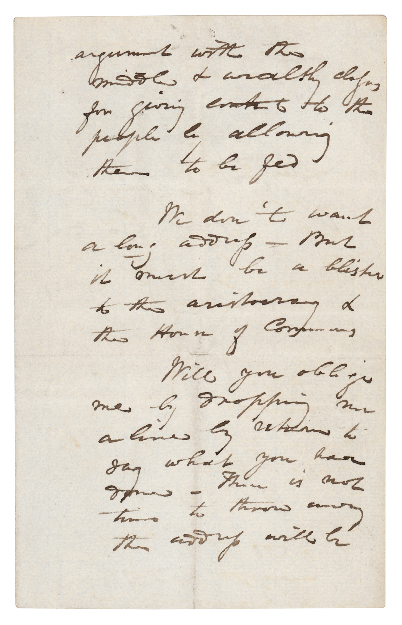 Influential British statesman (1804-1865) associated with John Bright in the formation of the Anti-Corn Law League; an immensely important figure in classical-liberal thought in economics and international affairs. ALS signed “R. Cobden,” six pages two sets of adjoining sheets, 4.5 x 7.25, May 4, 1860. Handwritten letter to a gentleman, with excellent content. In part: "At the Council of the [Anti-Corn] League…it was decided to apply to Mr. Fox as the only man capable of doing justice to such an address…We don’t want the question to be argued, but to be taken up on the primitive ground of right & justice…that robs all the community for the clumsy expedient of putting a mere fraction of the booty into the pockets of the robbers. The object of the address should be, to stir up the community to active resistance against a law that degrades us as worse than slaves in the eyes of the world. Then the religious & moral feelings…of the Christians worth much to be drawn forth by the remembrance of the anti-slavery, & other struggles…the cause of truth & justice must proper in the end. The people must be told that there is no hope from the present House of Commons, which refused to allow corn to be grown…& refused to allow the Irish to import foreign flour at a time when their own flour was breeding typhus fever!…the country’s salvation must be worked out at the…polling booth. We may also glower at the despair which is seizing the minds of many…The increase of the armed military & civil forces to restrain the people might be referred to…as an argument with the middle & wealthy classes for giving content to the people by allowing them to be fed…[The address] must be blister to the aristocracy & the House of Commons." In fine condition.