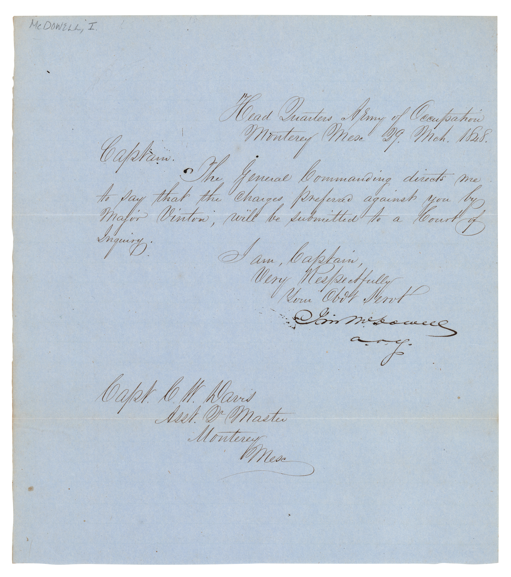 Union general (1818-1885) best remembered for leading the losing Union forces in the First Battle of Bull Run; later he was in charge of the army which defended Washington. LS signed “Irvin McDowell, A.A.G.,” one page, 7.75 x 8.75, March 29, 1848. Letter from "Head Quarters, Army of Occupation, Monterey, Mex.," to Capt. C. W. Davis. In full: "The General Commanding directs me to say that the charges preferred against you by Major Vinton, will be submitted to a Court of Inquiry." In fine condition.