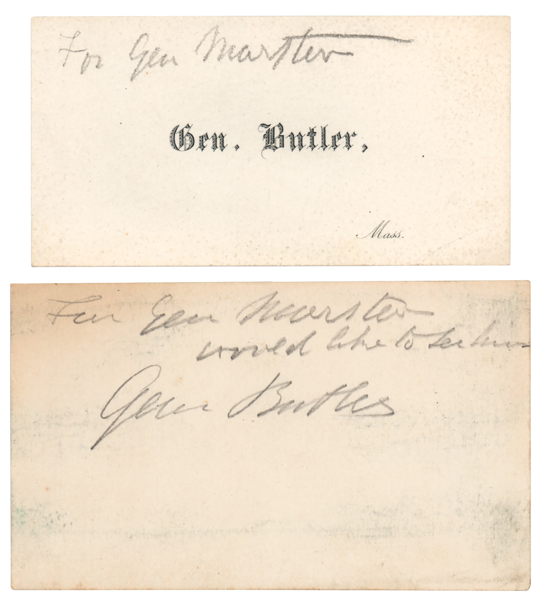 Two items: a pencil signature and inscription, "For Gen. Marston, would like to see him, Gen. Butler," on an off-white 3.75 x 2.25 slip; and one of Butler's personal visiting cards imprinted "Gen. Butler, Mass.," 3.5 x 1.75, annotated in pencil in his own hand, "For Gen. Marsten." In overall fine condition.
