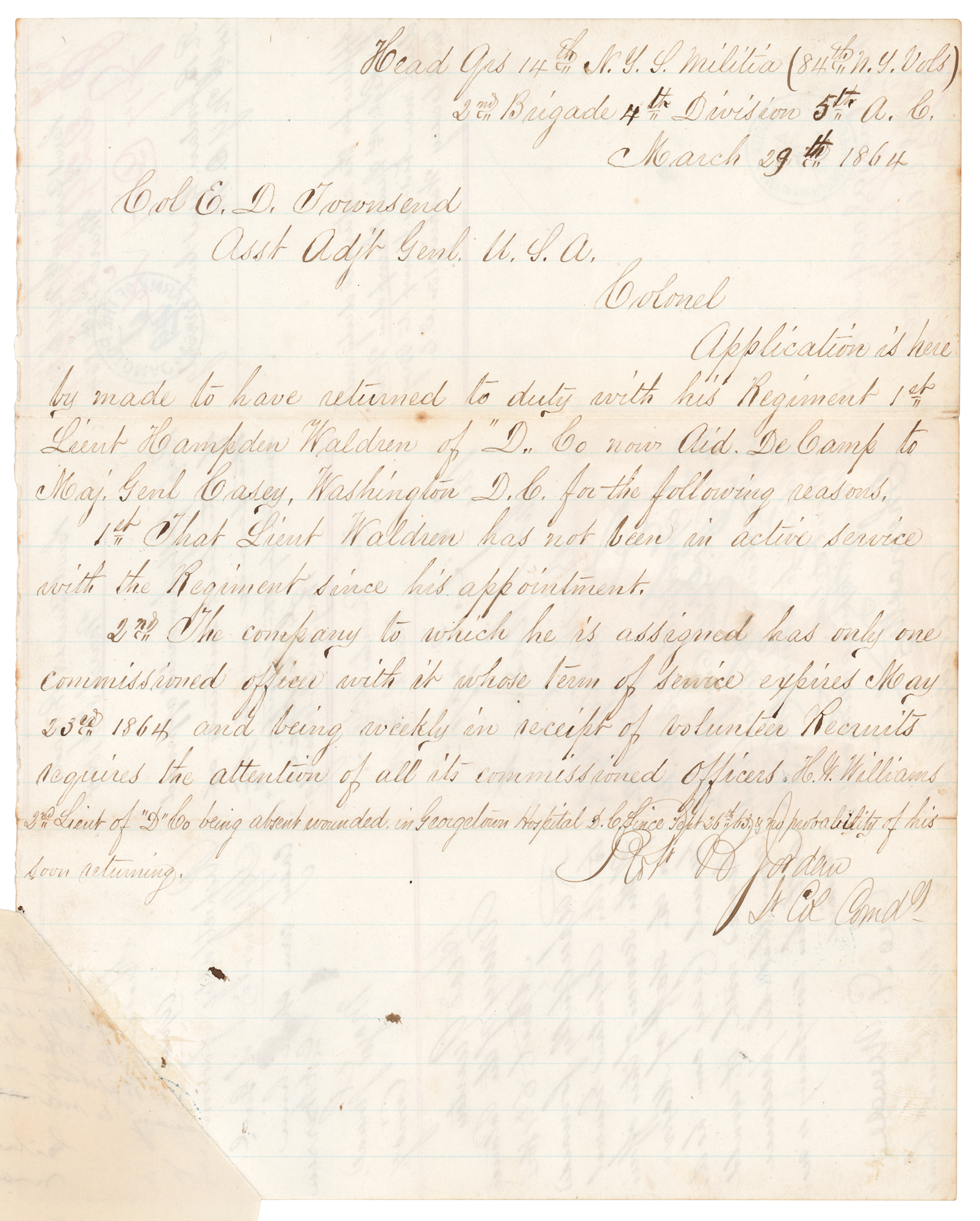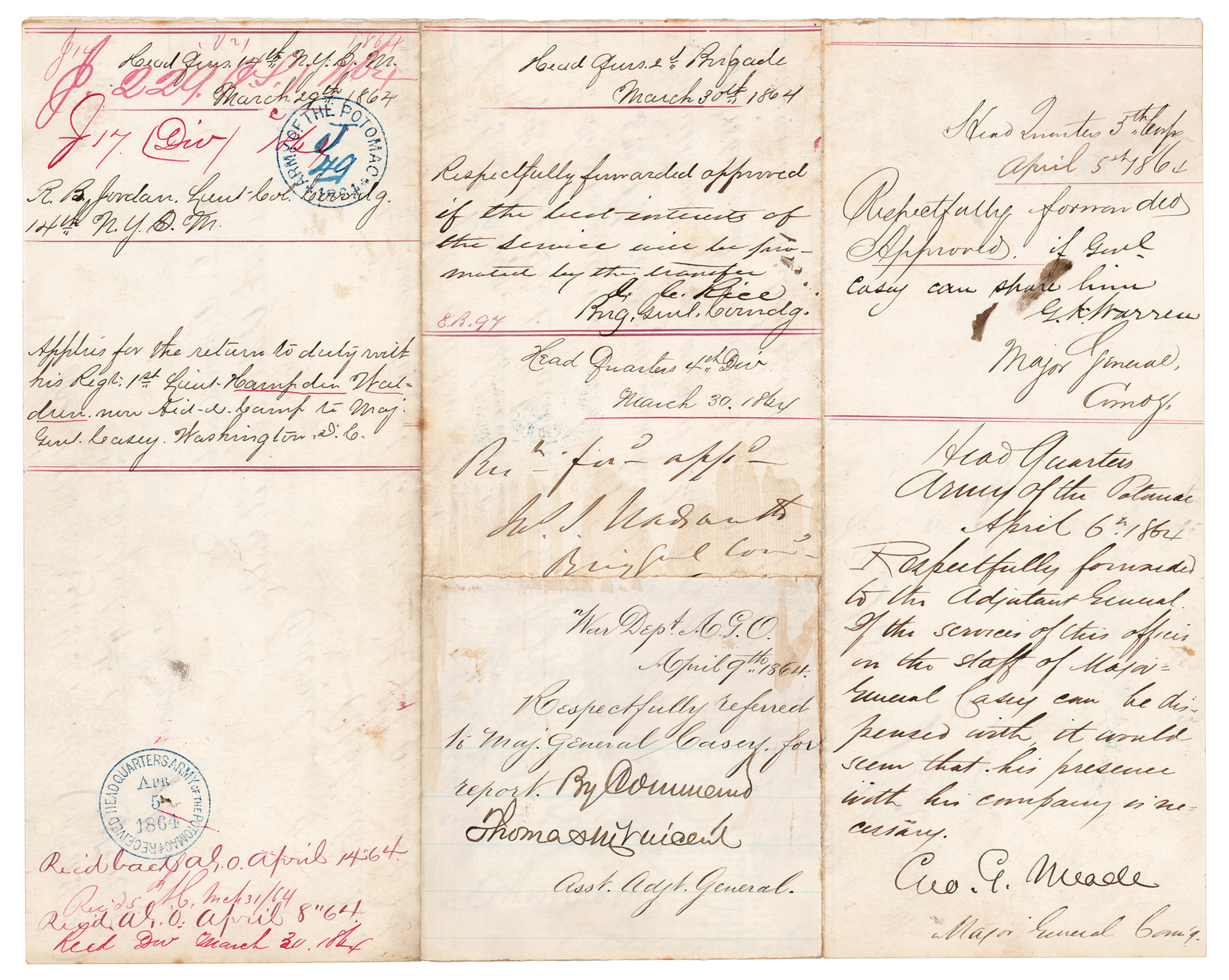 Civil War–dated endorsement signatures by six Union generals—George G. Meade, Gouverneur K. Warren, James S. Wadsworth, James C. Rice, Silas Casey, and Thomas M. Vincent—on the reverse of a letter to Col. E. D. Townsend by Lt. Col. Robert B. Jordan of the Brooklyn Zouaves, two pages, 9.75 x 7.75, March 29, 1864. Jordan's letter requests that Lt. Hampden Waldron, at the time serving on the staff of General Silas Casey, be assigned to active duty with the Brooklyn Zouaves. On the reverse, a series of five Union generals sign endorsements forwarding and approving the request: James C. Rice ("If the best interests of the service will be promoted by the transfer"), James S. Wadsworth, G. K. Warren ("If Gen'l Casey can spare him"), George G. Meade ("If the services of this officer on the staff of Major General Casey can be dispensed with"), and Thomas M. Vincent ("Respectfully referred to Maj. General Casey"). On an attached sheet, Gen. Casey declines the request, signing below a statement that "the services of Lieut. Waldron are very necessary to me." Thomas M. Vincent also endorses the second sheet, returning the request to Gen. Meade and citing that "Lieut. Waldron is the only officer of his rank on duty with Genl. Casey, and will not at present be relieved." In fine condition.