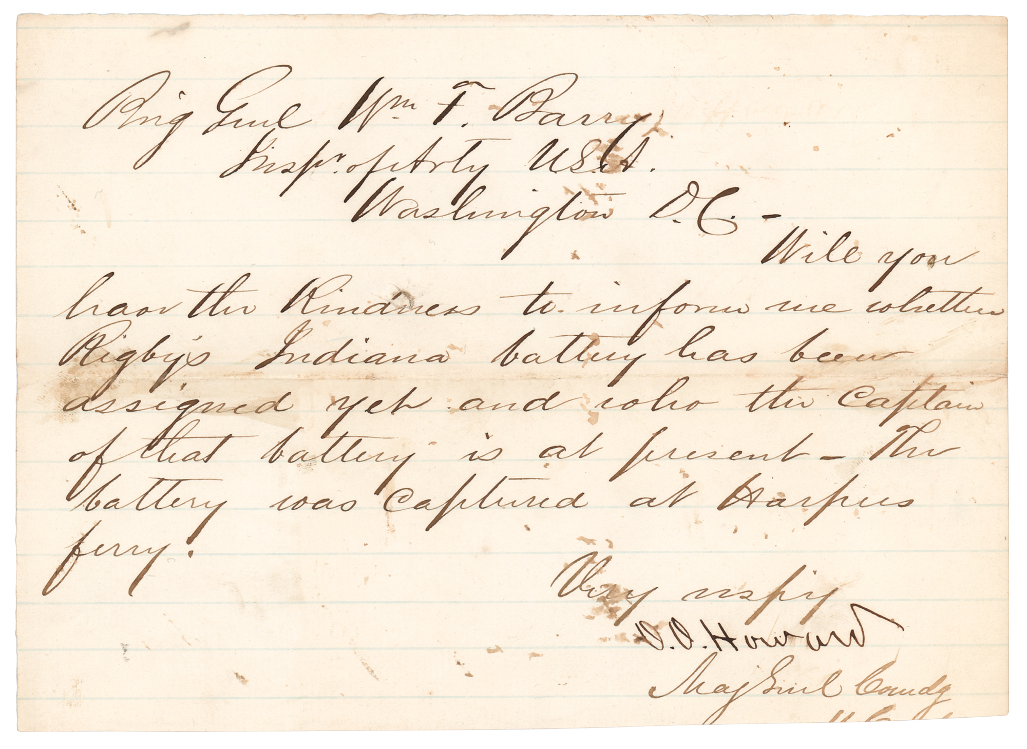 Union general (1830–1909) who participated at Gettysburg and commanded the Army of Tennessee during Sherman’s March to the Sea. Civil War–era LS, one page, 7.75 x 5.5, no date. Letter to Brig. Gen. William T. Barry, in part: "Will you have the kindness to inform me whether Rigby's Indiana battery has been assigned yet and who the captain of that battery is at present—the battery was captured at Harpers Ferry." In fine condition, with scattered small stains.