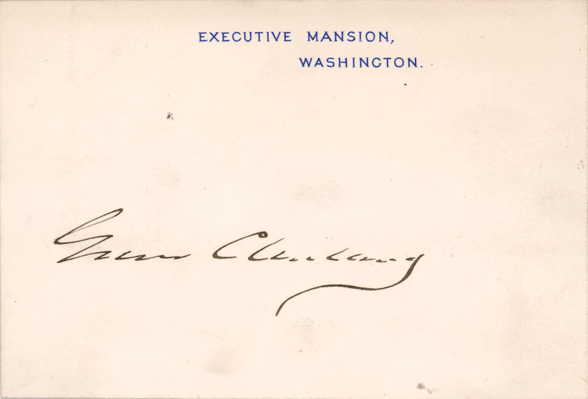 Executive Mansion card, 4 x 2.75 signed in bold ink, "Grover Cleveland." In fine condition, with small mounting remnants on the back.