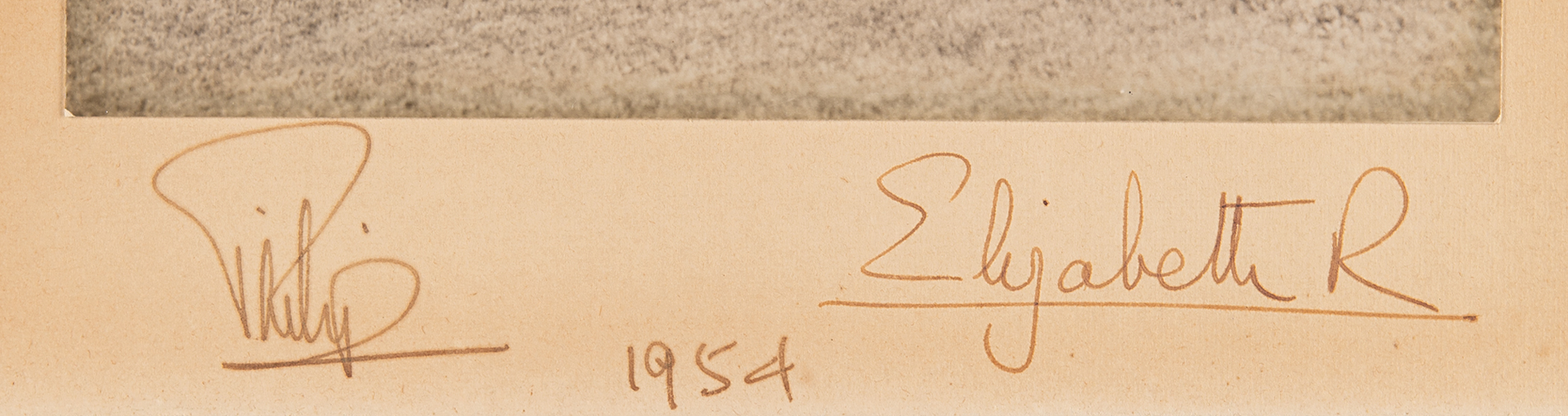 Scarce vintage matte-finish 6 x 8 photo of Queen Elizabeth II and Prince Philip posing outdoors with their two young children, affixed to the original 7.5 x 10 mount, which is signed in fountain pen, "Philip" and "Elizabeth R., 1954.” In fine condition.