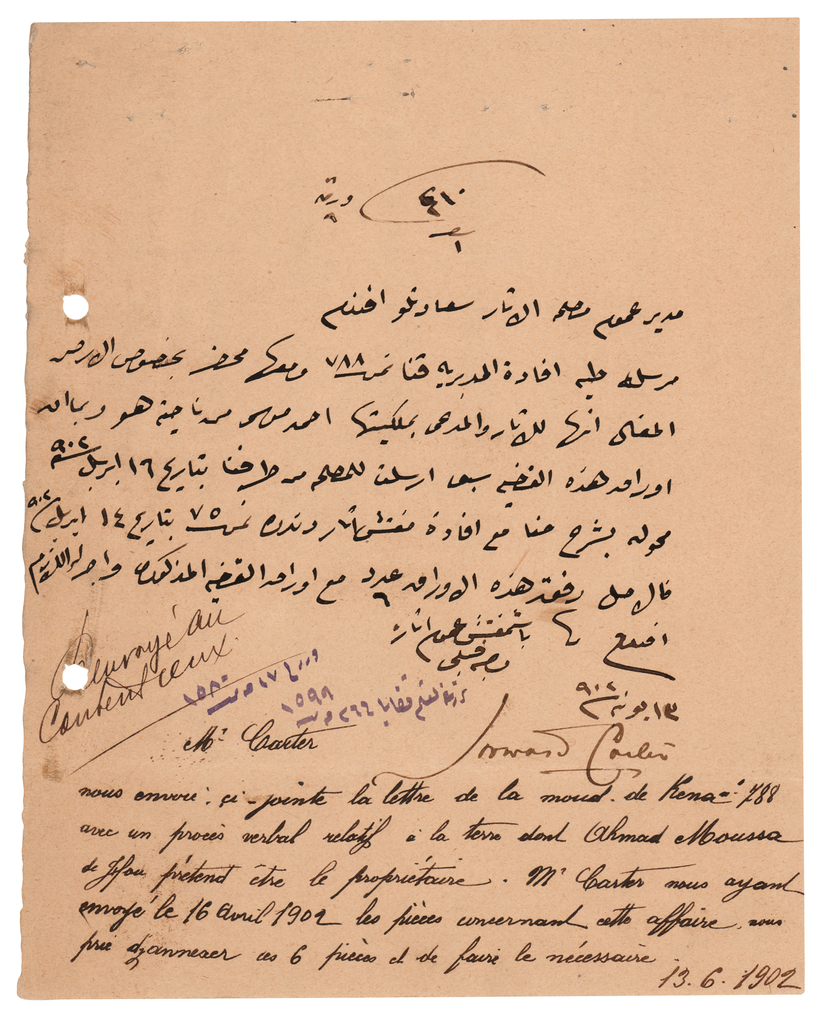 British archaeologist and Egyptologist (1874-1939) whose discovery of the tomb of Tutankhamun in Egypt's 'Valley of the Kings' proved to be one of the signal events in the history of archaeology. LS in Arabic, one page, 6.5 x 8.25, June 13, 1902. Letter to the managing administrator of the Archeology Department, in part (translated): "Attached for the benefit of the department, Qena 788, and with it the land registry concerning the land. Enclosed here for archeological purposes and for the proprietor of the land, Ahmad Moussa, along with the papers of this cast, which were sent by us on the 16th April 1902." In fine condition, with two file holes to the left edge. It was during this year that Carter, while supervising excavations in the Valley of the Tombs of the Kings, discovered the tombs of Hatshepsut and Thutmose IV.