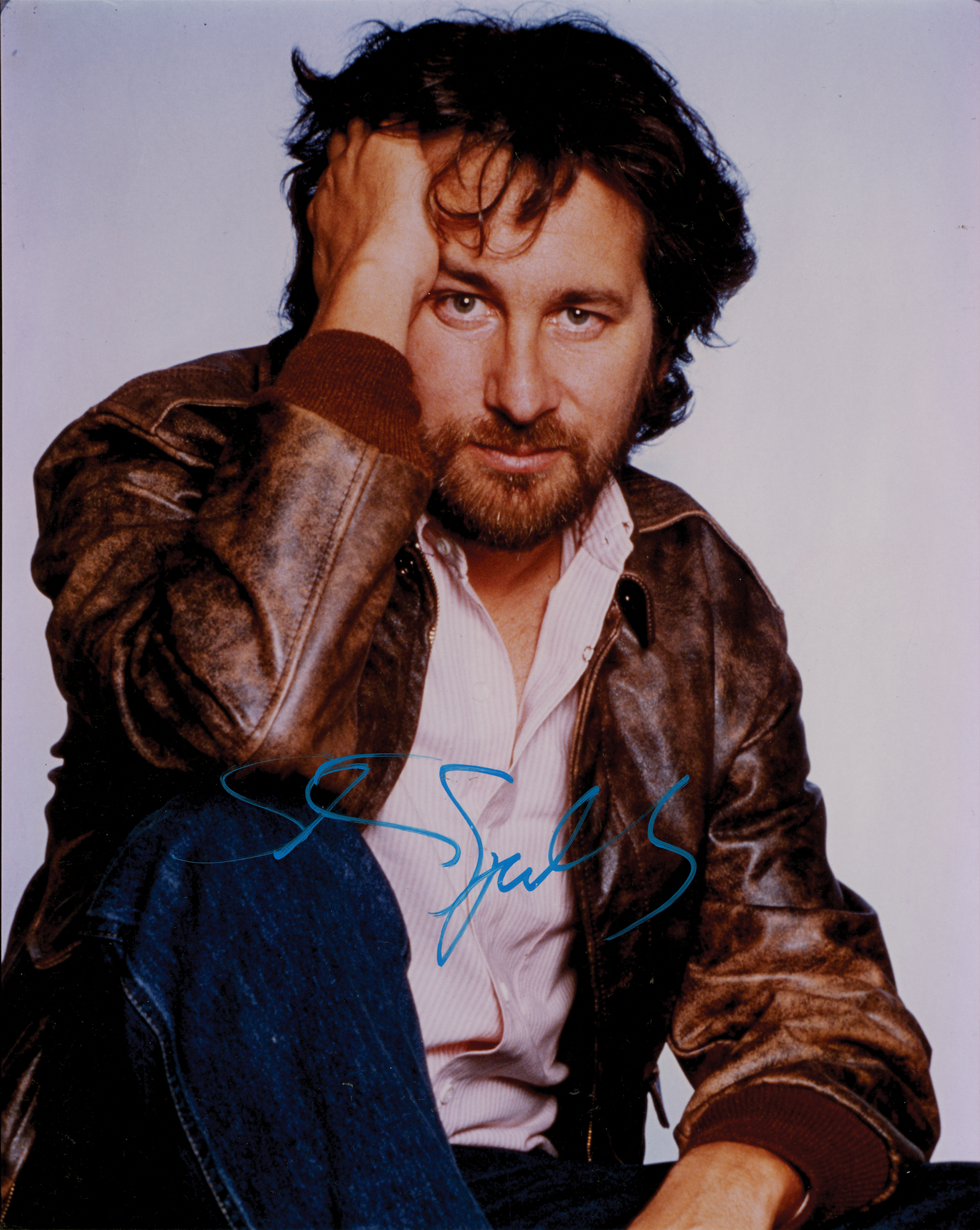 Color satin-finish 8 x 10 photo of the Oscar-winning director in a leather jacket running his hand through his hair, signed in blue paint pen by Steven Spielberg. In fine condition.