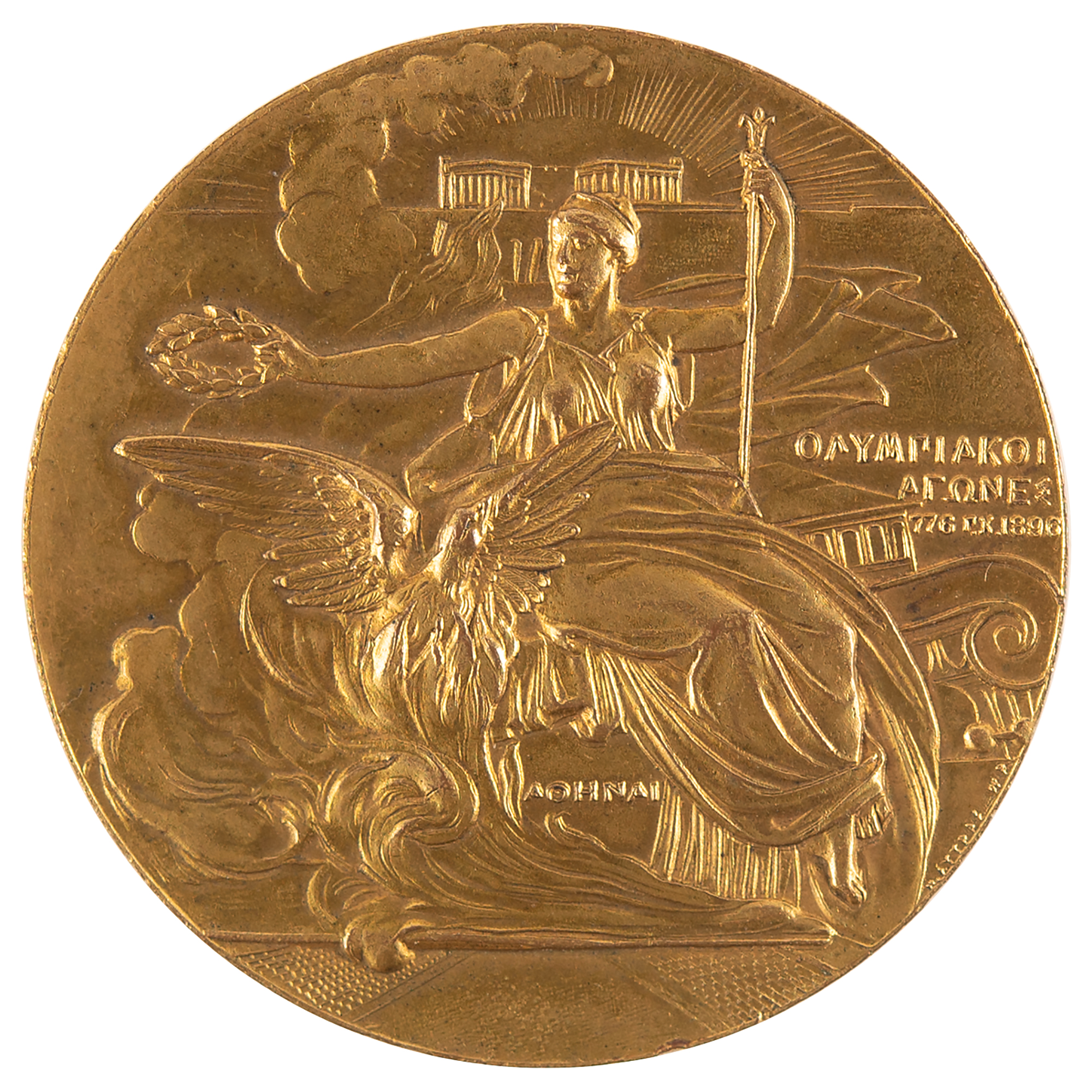 Participation medal issued for the Athens 1906 Intercalated Olympics. Gilt bronze, 50 mm, 59 gm, by Nikephoros Lytras. The front shows a seated Nike holding a laurel crown above a phoenix rising from flames, with the Acropolis in the background; the reverse bears an inscribed Greek legend within a laurel wreath, with the mint along the bottom rim, "W. Pittner, Wien." The 1906 Athens participation medal was manufactured from the unused inventory of the 1896 Athens participation medals; the only difference being that a 1906 plaque has been soldered over the original 1896 date.
