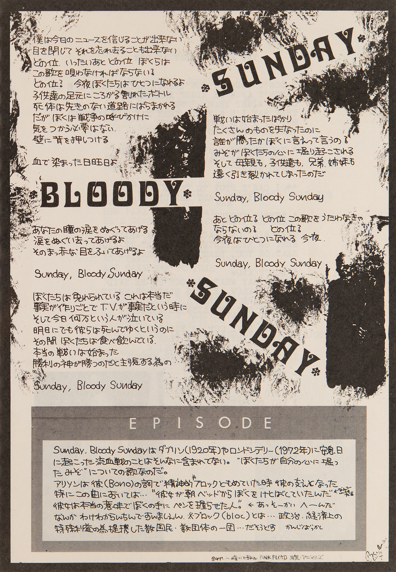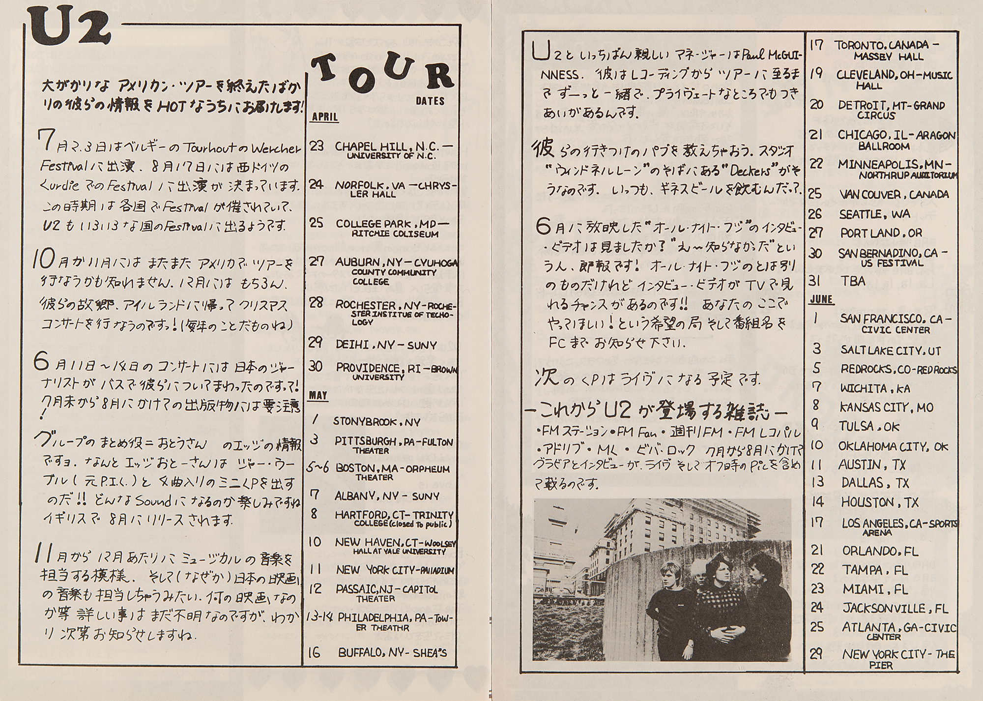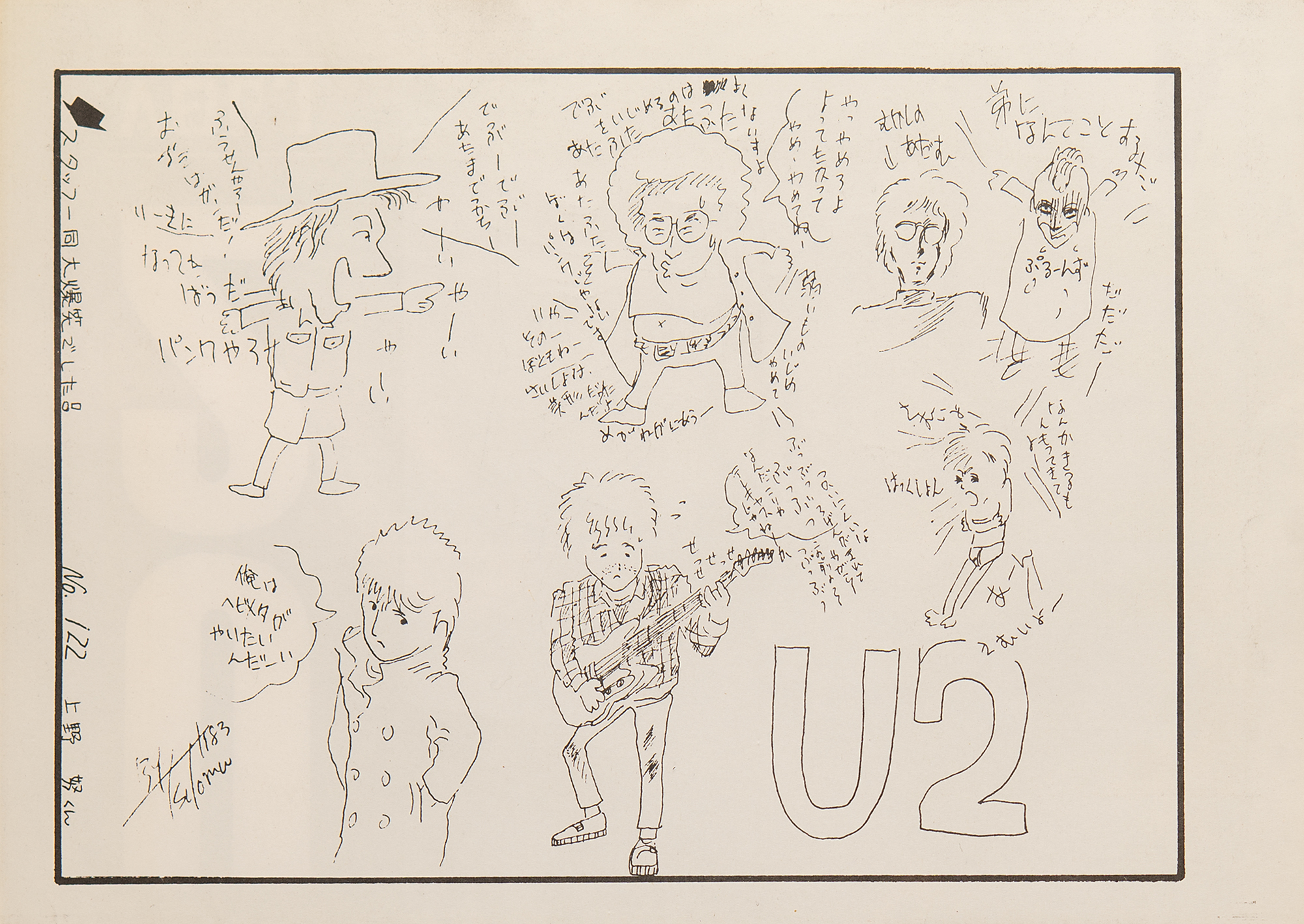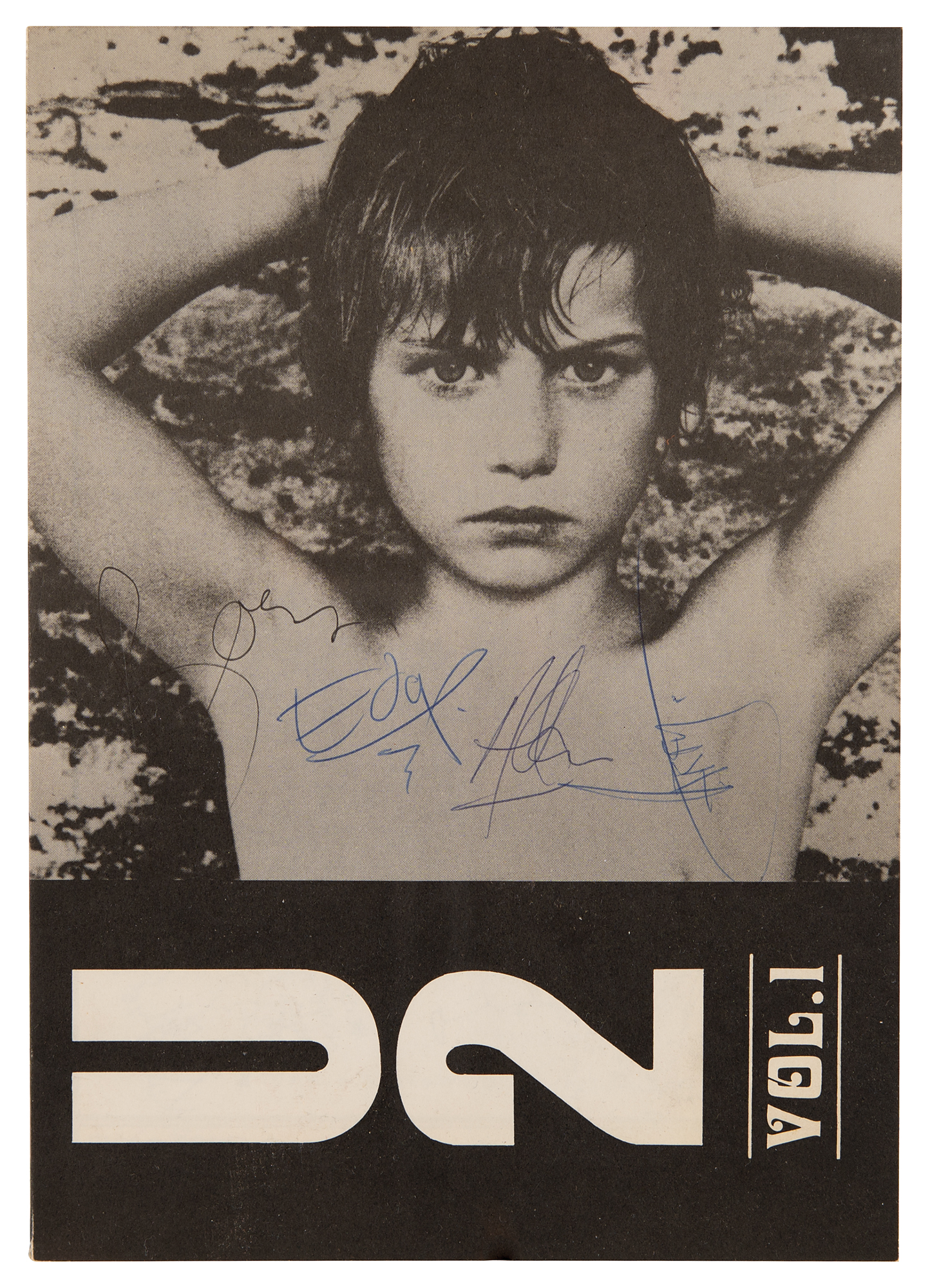 Scarce original bilingual U2 Japanese Fan Club magazine dating to summer 1983, 18 pages, 7.25 x 10, signed on the front cover in black ink by Bono, and in blue ballpoint by Edge, Adam Clayton, and Larry Mullen, Jr. The magazine, which features an image similar to the cover of the band’s War album, contains various amusing drawings, tour dates, song lyrics, a discography, and more. Includes a Japanese ‘United Express’ mail order sheet from August 6, 1983, which pictures Edge during a concert. In fine condition.