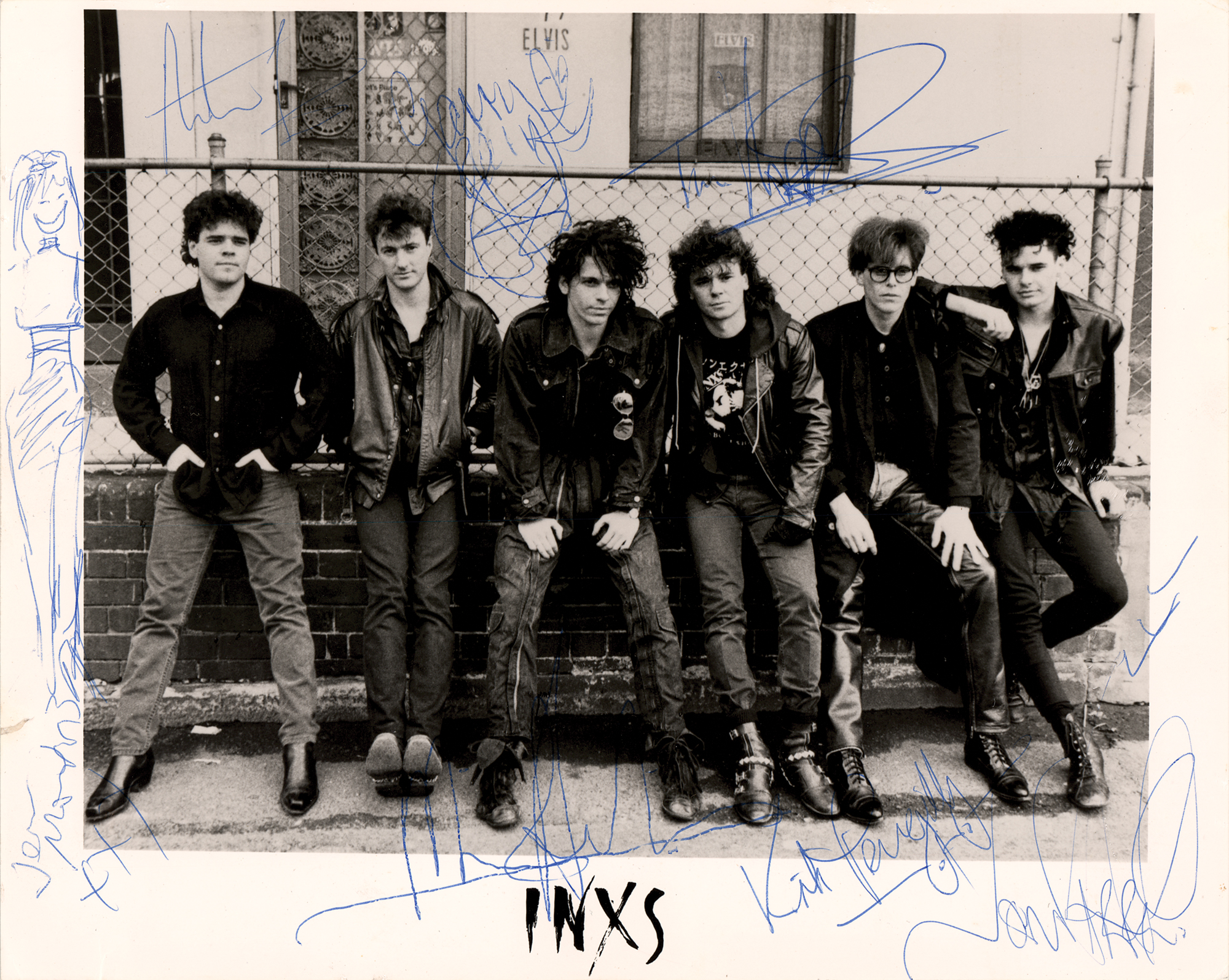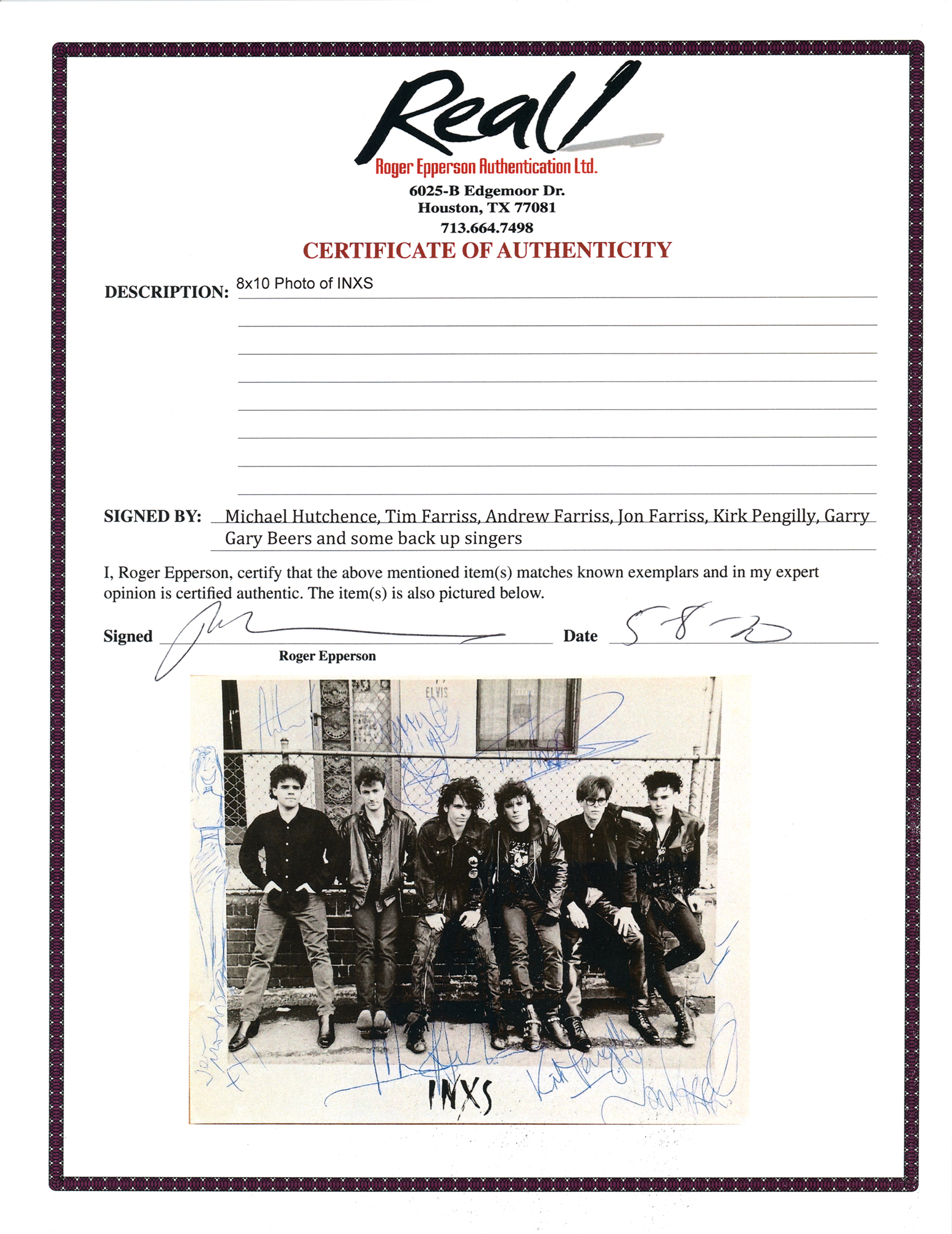 Glossy 10 x 8 promotional photo of INXS resting against a fence, signed in blue ballpoint by Michael Hutchence, Tim Farriss, Garry Gary Beers, Jon Farriss, Kirk Pengilly who adds a sketch of glasses, Andrew Farriss, and one of their back-up singers who adds a full-length sketch. In fine condition. Accompanied by a full letter of authenticity from REAL.