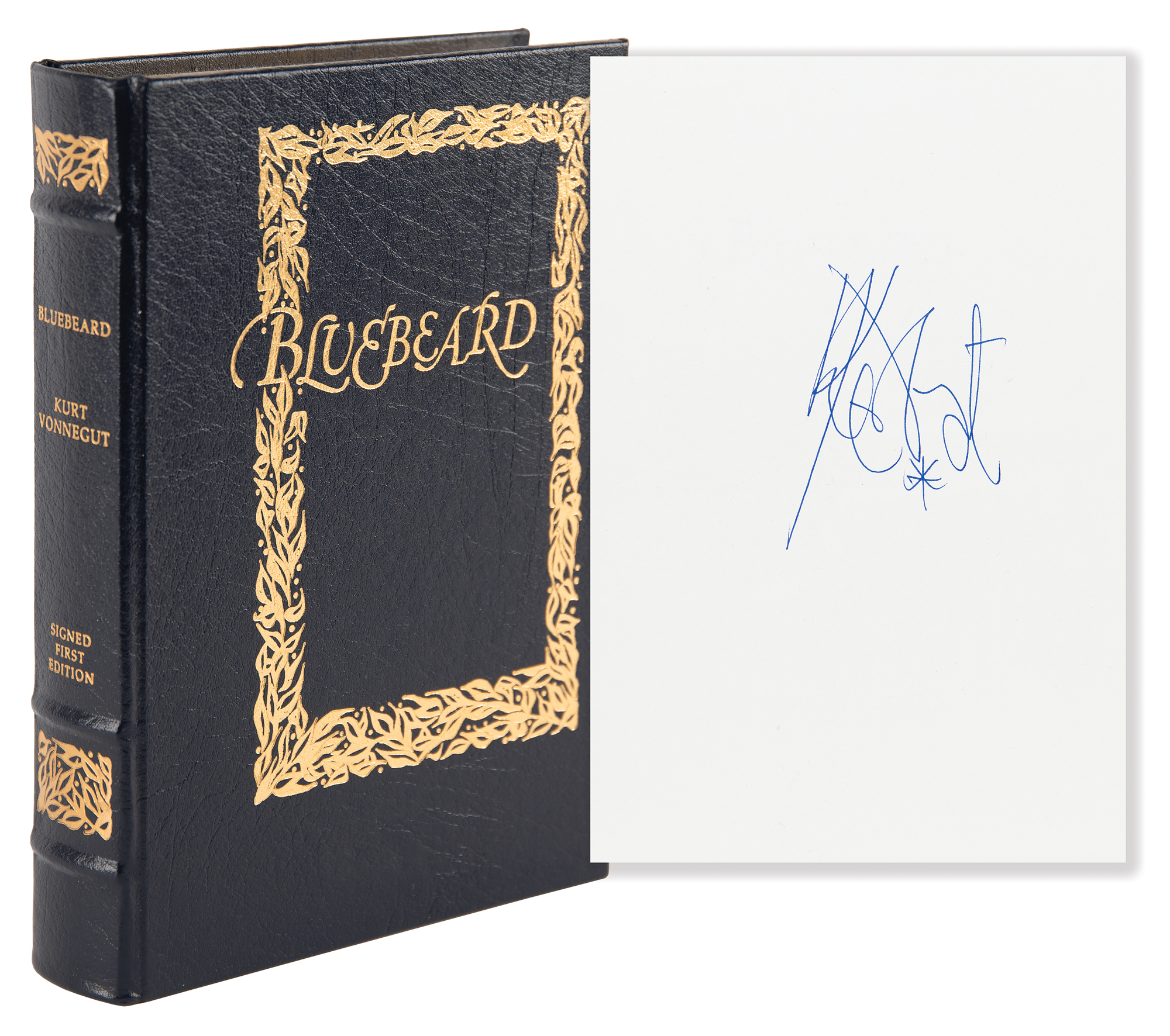 Signed book: Bluebeard. Limited first edition. Franklin Center, PA: Franklin Library, 1987. Leatherbound hardcover, 6 x 8.25, 300 pages. Signed on the first free end page in blue felt tip by Kurt Vonnegut. In very fine condition.