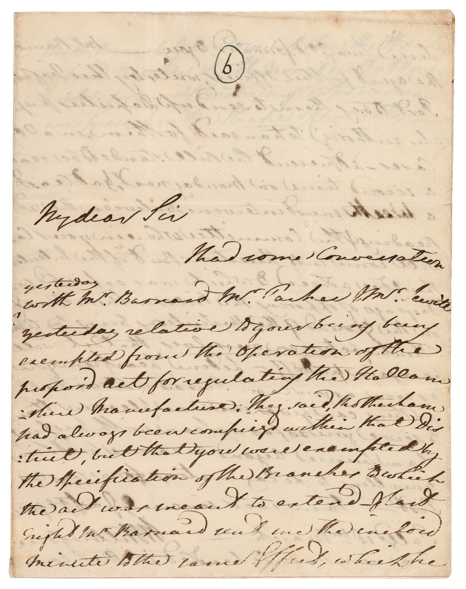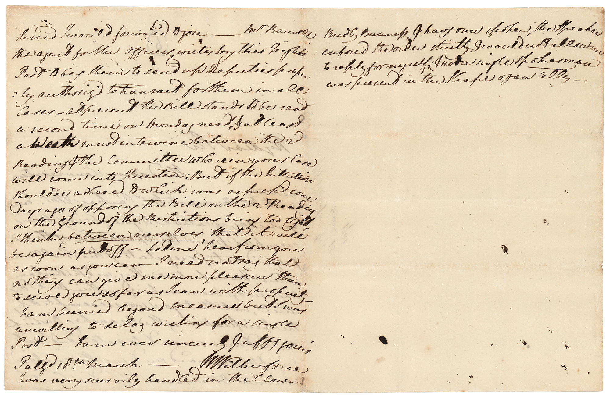 British politician, evangelist, and philanthropist (1759-1833) who played an important role in the movement to abolish slavery. ALS signed “W. Wilberforce,” three pages on two adjoining sheets, 7.75 x 10, March 18, 1791. Handwritten letter to an unknown recipient, in part: “I had some conversation yesterday with Mr. Barnard, Mr. Parker and Mr. Seville yesterday relative your being exempted from the operation of the proposed act for regulating the Hollam in their manufacture. They said Rotherham had always been comprised within that district, but that you were exempted by the specification of the branches to which the act was meant to extend — & last night Mr. Barnard sent me the enclosed minutes to the same effect, which he desired I would forward you — Mr. Banwell the agent for the officers writes by the night's post to beg them to send up Deputies properly authorized to transact for them in all cases. At present the bill stands to be read a second time on Monday next and at least a week must intervene between the second reading of the committee who (in your case) will come into question. But if the intention should be adhered to which was expected some days ago of opposing the bill on the second reading on the grounds of restrictions being too light I think between ourselves that it will be again put off. Let me hear from you as soon as you can. I need not say that nothing can give me more pleasure than to serve you so far as I can with propriety. I am hurried beyond measure but I was unwilling to delay in writing for single post. I am ever sincerely and affectionately yours.” Wilberforce adds a postscript: “I was very scurvily handled…business I have once spoke, the speaker enforced the order strictly. I would not allow me to reply for myself, and not a single spokesman was present in the shape of an ally.” In fine condition.