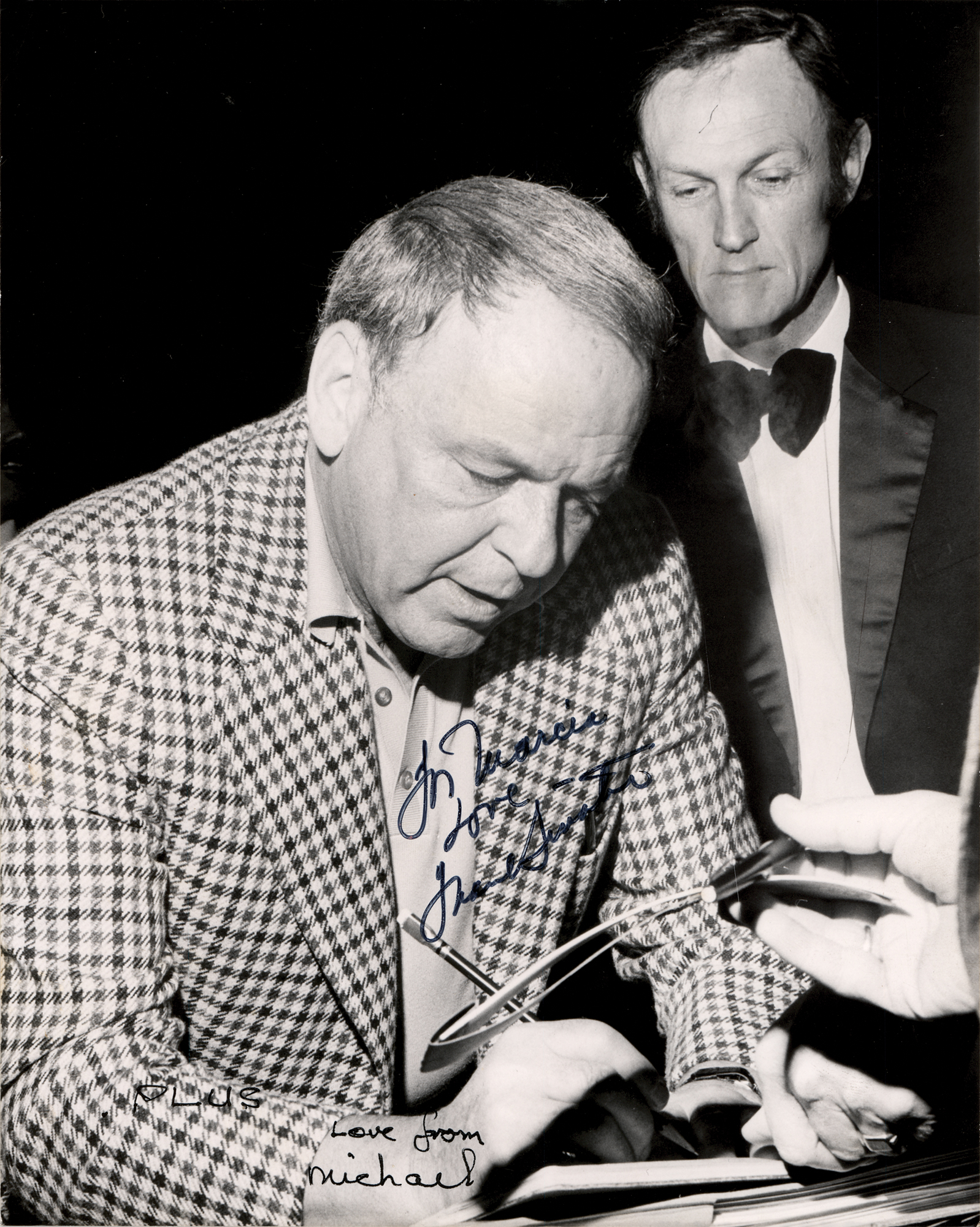 Glossy 8 x 10 photo of Sinatra signing autographs, signed and inscribed in black felt tip, "For Francis, Love—Frank Sinatra.” Also inscribed in another hand, "Plus love from Michael." In fine condition.