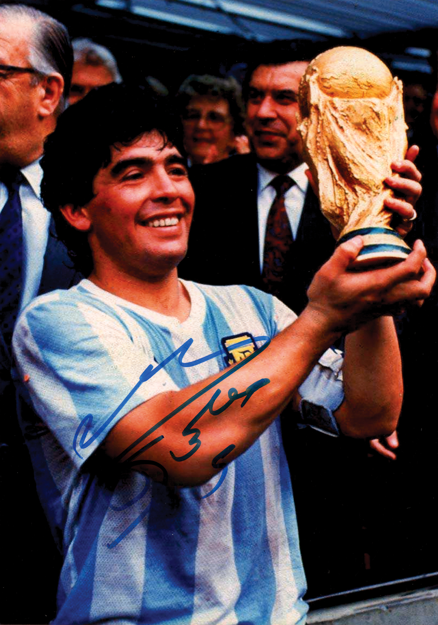 Color glossy 6 x 8.5 photo of Diego Maradona holding the FIFA World Cup trophy, signed in blue felt tip. In very fine condition. Consignor notes that he obtained the autograph in person in Monaco on August 26, 2003.