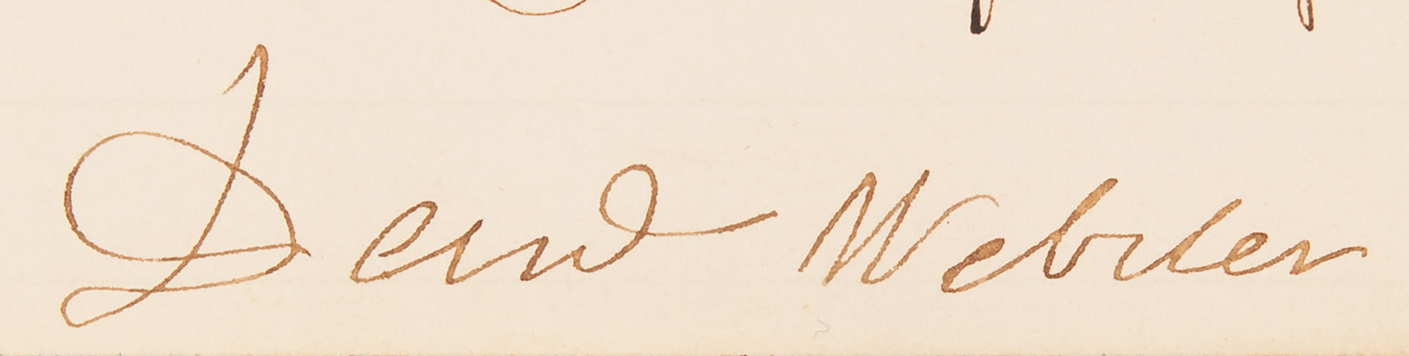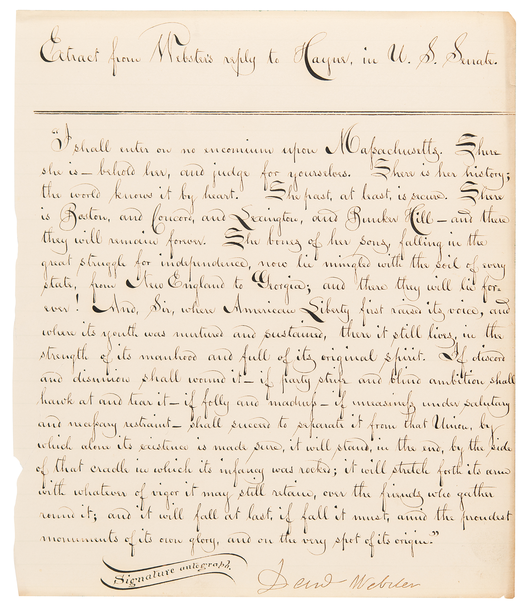Ornately penned manuscript souvenir quotation from "Webster's reply to Hayne, in U.S. Senate," one page, 7.5 x 8.75, signed at the conclusion in ink, "Dan'l Webster." The quote, originating from the most famous speech ever given in the United States Senate, reads, in full: "I shall enter on no encomium upon Massachusetts; she needs none. There she is. Behold her, and judge for yourselves. There is her history; the world knows it by heart. The past, at least, is secure. There is Boston, and Concord, and Lexington, and Bunker Hill; and there they will remain for ever. The bones of her sons, falling in the great struggle for Independence, now lie mingled with the soil of every State from New England to Georgia; and there they will lie for ever. And Sir, where American Liberty raised its first voice, and where its youth was nurtured and sustained, there it still lives, in the strength of its manhood, and full of its original spirit. If discord and disunion shall wound it, if party strife and blind ambition shall hawk at and tear it, if folly and madness, if uneasiness under salutary and necessary restraint, shall succeed in separating it from that Union, by which alone its existence is made sure, it will stand, in the end, by the side of that cradle in which its infancy was rocked; over the friends who gather round it; and it will fall at last, if fall it must, amidst the proudest monuments of its own glory, and on the very spot of its origin." In fine condition.
