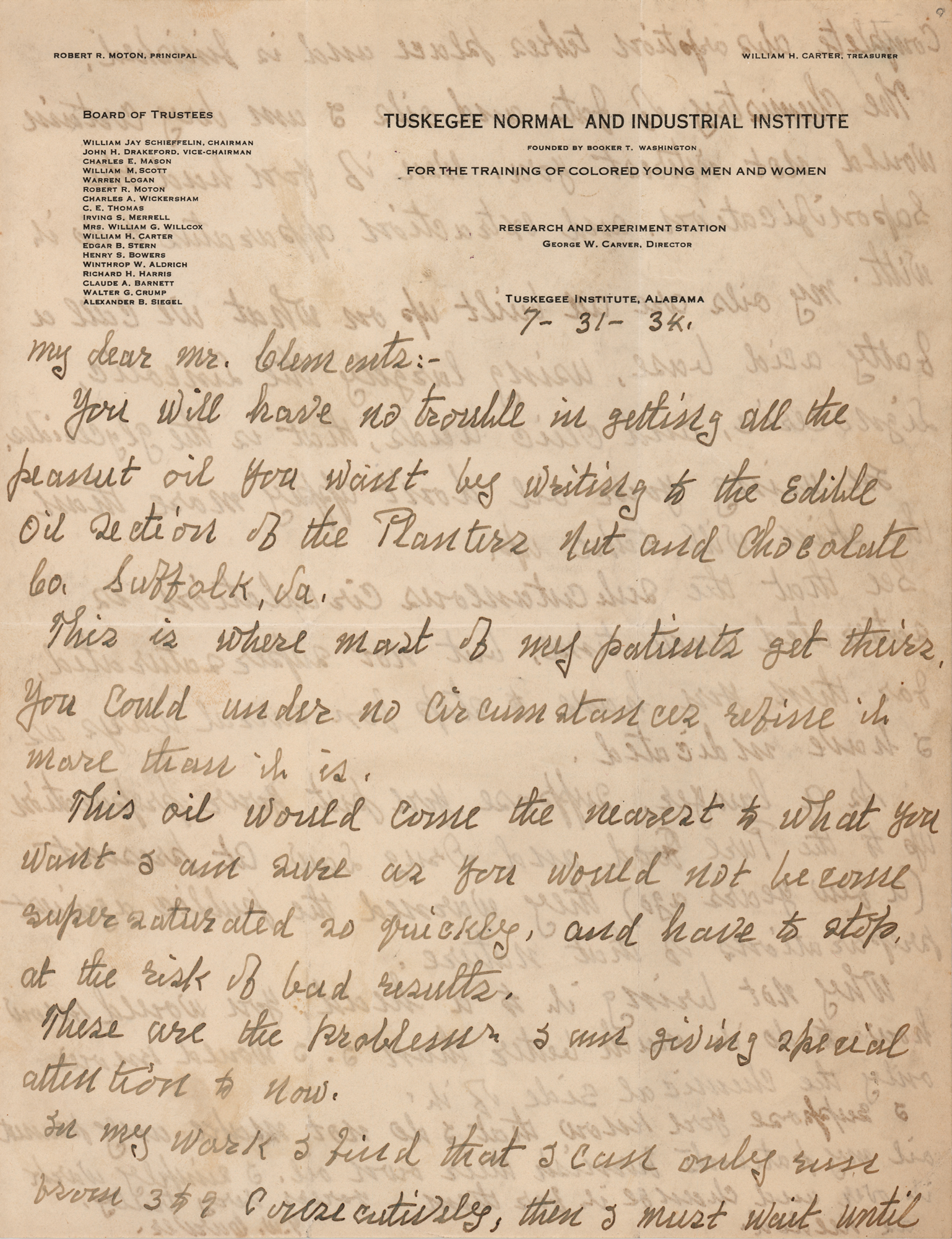 ALS signed “G. W. Carver,” one page both sides, 8.5 x 11, Tuskegee Normal and Industrial Institute letterhead, July 31, 1934. Handwritten letter to "Mr. Clements," in part: "You will have no trouble in getting all the peanut oil you want by writing to the Edible Oil Section of the Planters Nut and Chocolate Co., Suffolk, Va. This is where most of my patients get theirs. You could under no circumstance refine it more than it is. This oil would come the nearest to what you want I am sure as you would not become supersaturated so quickly, and have to stop at the risk of bad results…The chemistry of fats and oils I am very certain would not interest you. Even if you had the saponification, and extraction, apparatus to do it with. My oils are all built up on what we call a fatty acid base, using largely the lineolic, lignoceric, and oleic acids, that is the glycerides. In using your oil don't apply more than the skin will take up." In fine condition.