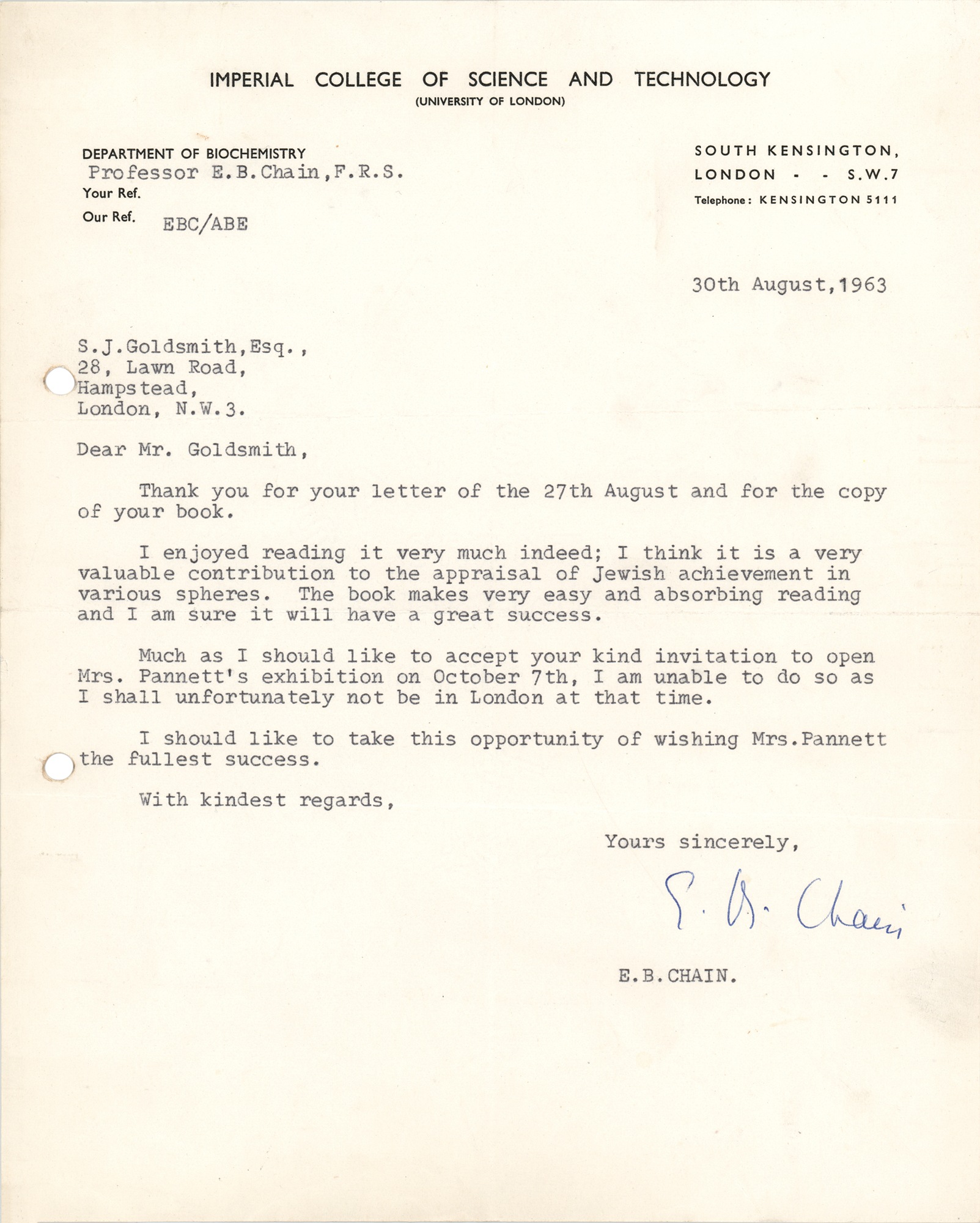 German-British biochemist (1906–1979) best known for being a co-recipient of the Nobel Prize in Physiology or Medicine for his work on penicillin. TLS signed “E. B. Chain,” one page, 8 x 10, Imperial College of Science and Technology letterhead, August 30, 1963. Letter to journalist and author S. J. Goldsmith, in part: "Thank you for your letter of the 27th August and for the copy of your book. I enjoyed reading it very much indeed; I think it is a very valuable contribution to the appraisal of Jewish achievement in various spheres. The book makes very easy and absorbing reading and I am sure it will have a great success." In fine condition, with two file holes to the left edge.