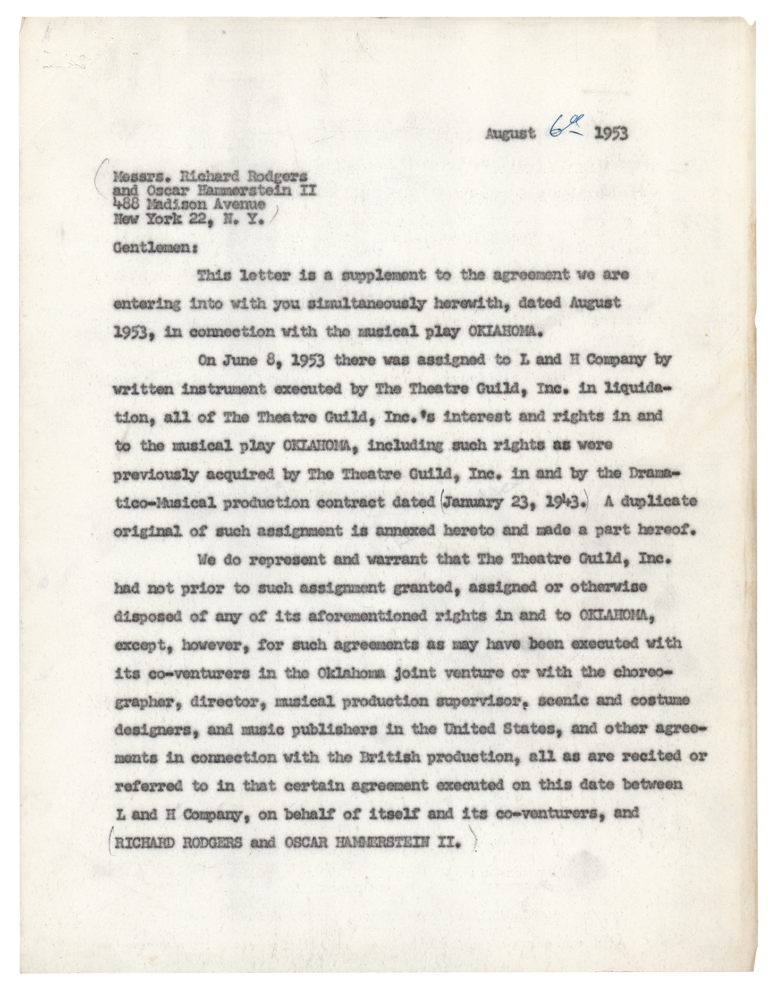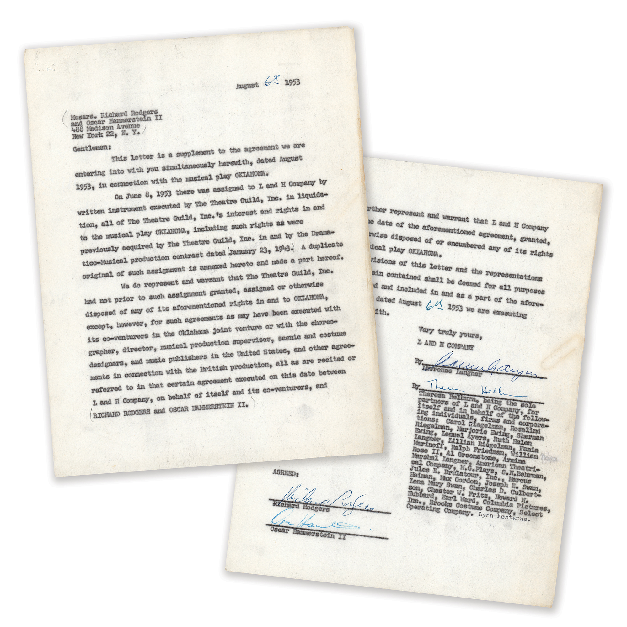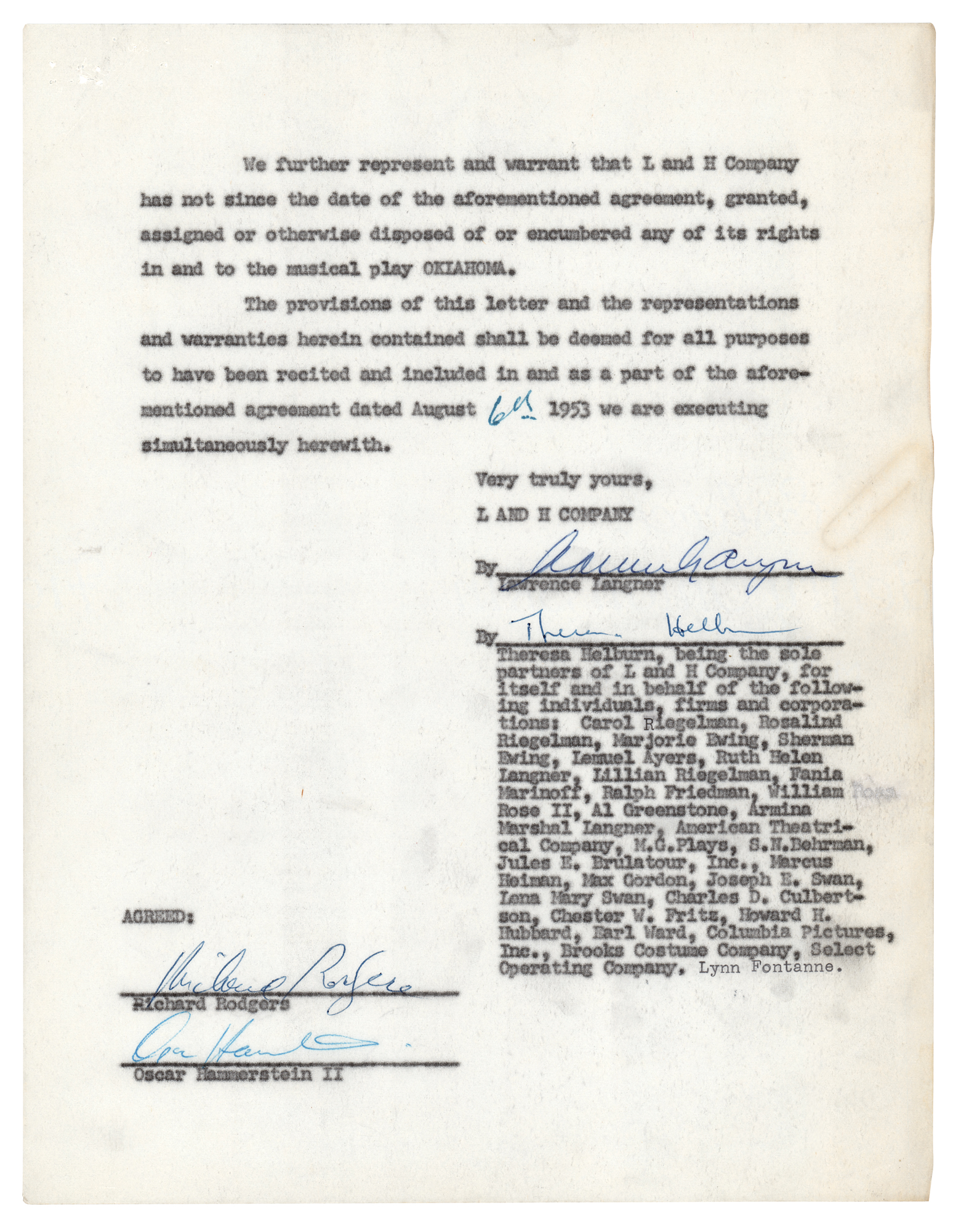 DS, signed "Richard Rodgers" and "Oscar Hammerstein," two pages, 8.75 x 11.25, August 6, 1953. Document from L and H Company, supplementing an existing agreement with Rodgers and Hammerstein "in connection with the musical play Oklahoma." In part: "On June 8, 1953 there was assigned to L and H Company by written instrument executed by The Theatre Guild, Inc. in liquidation, all of The Theatre Guild, Inc.'s interest and rights in and to the musical play Oklahoma, including such rights as were previously acquired by The Theatre Guild, Inc. in and by the Dramatico-Musical production contract dated January 23, 1943." Signed at the conclusion in blue ballpoint by Rodgers and Hammerstein, and countersigned by theatrical producers Lawrence Langner and Theresa Helburn. In fine condition.