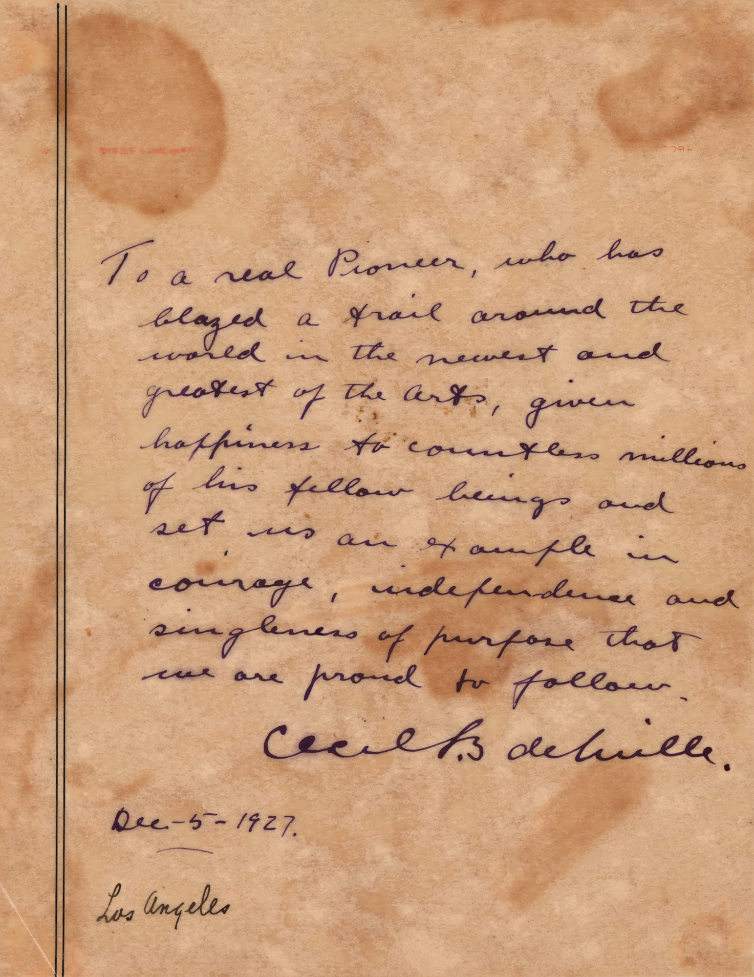 AMS signed "Cecil B. deMille," one vellum page, 7 x 9, December 5, 1927. DeMille praises the efforts of Universal Pictures co-founder Carl Laemmle, in full: "To a real Pioneer, who has blazed a trail around the world in the newest and greatest of the Arts, given happiness to countless millions of his fellow beings and set us an example in courage, independence and singleness of purpose that we are proud to follow." The place, "Los Angeles," has been added in another hand. In very good to fine condition, with staining affecting only appearance. A significant note of appreciation from one pioneer of early film to another.
