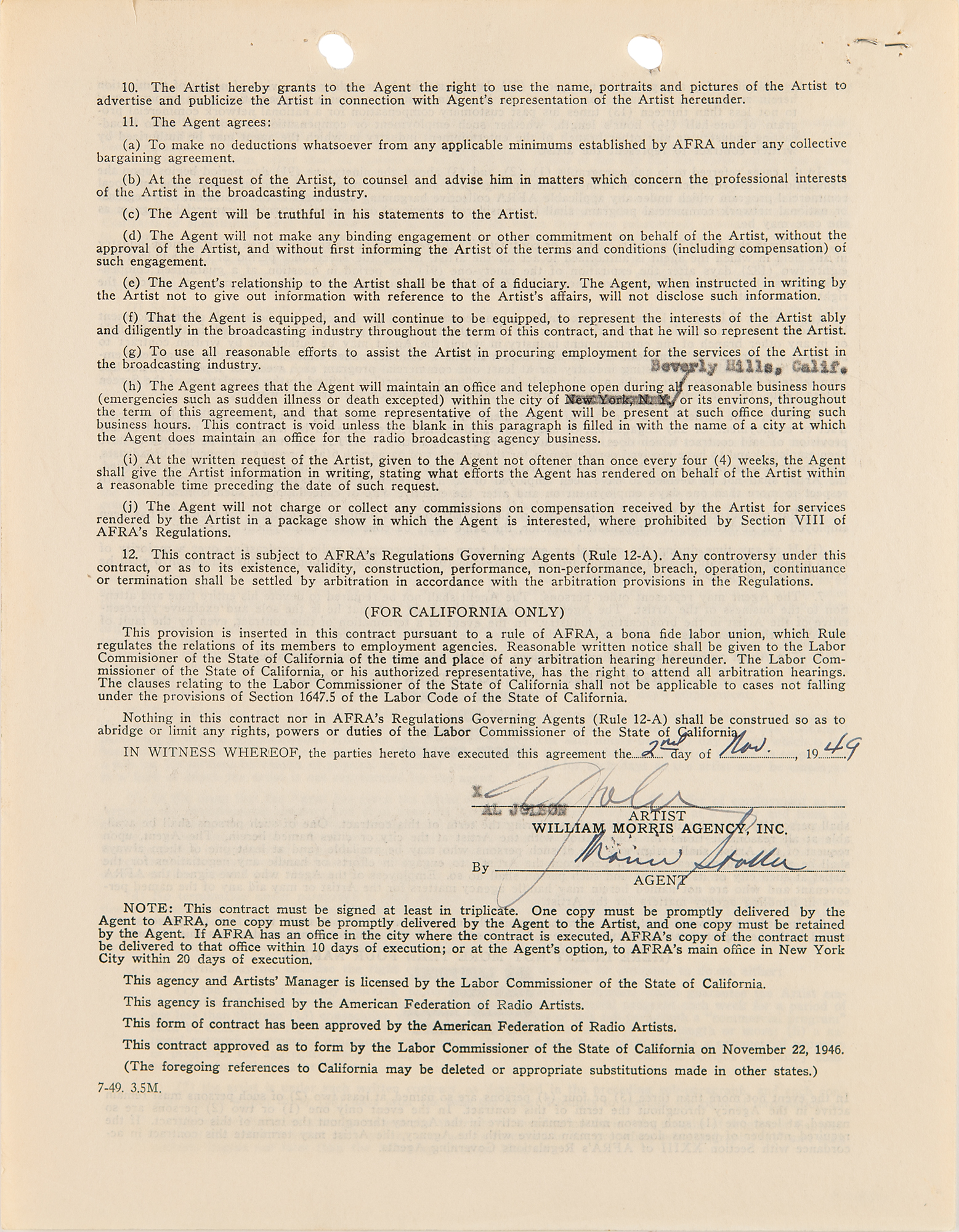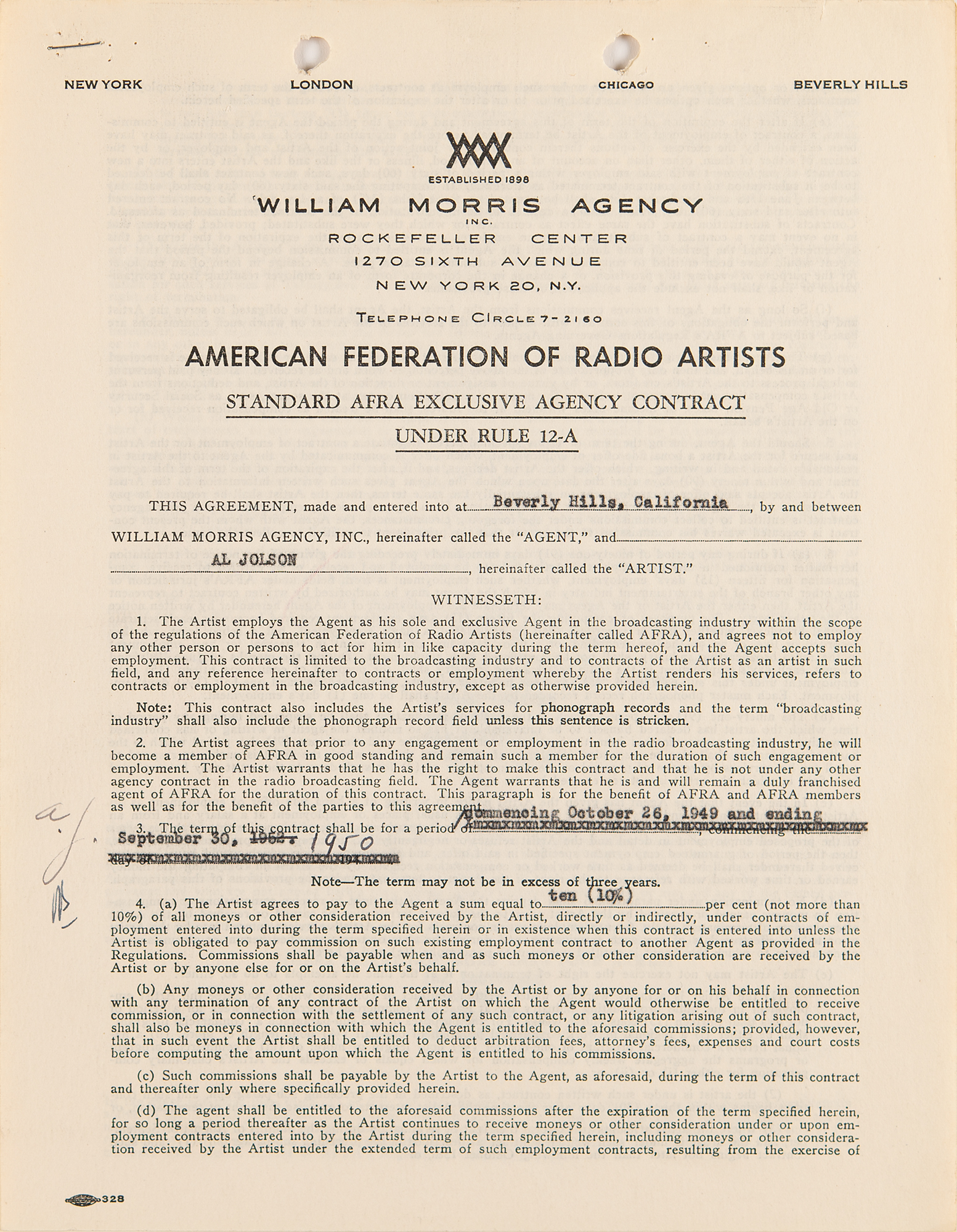 DS, two pages both sides, 8.5 x 11, November 2, 1949. Standard AFRA exclusive agency contract between Al Jolson and the William Morris Agency, by which the actor employs the firm as "his sole and exclusive Agent in the broadcasting industry." Signed at the conclusion in fountain pen by Al Jolson, and countersigned by an agency representative; Jolson also initials an amendment to the term of the contract. In fine condition.
