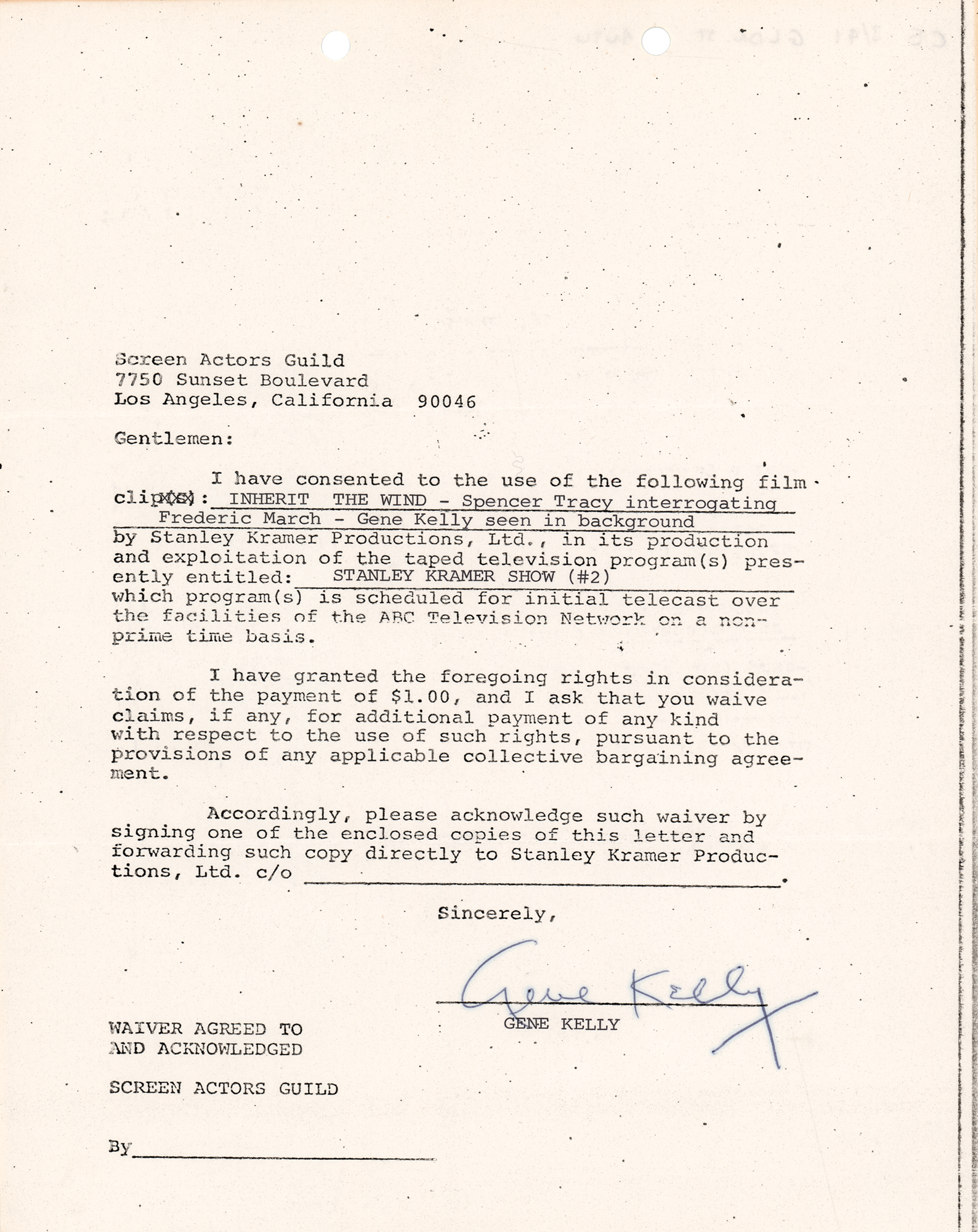 DS, one page, 8.5 x 11, no date. Kelly consents to "the use of the following film clip: Inherit the Wind - Spencer Tracy interrogating Frederic March - Gene Kelly seen in background by Stanley Kramer Productions, Ltd., in its production and exploitation of the taped television program(s) presently entitled: Stanley Kramer Show (#2)." Signed at the conclusion in ballpoint by Kelly. In fine condition.