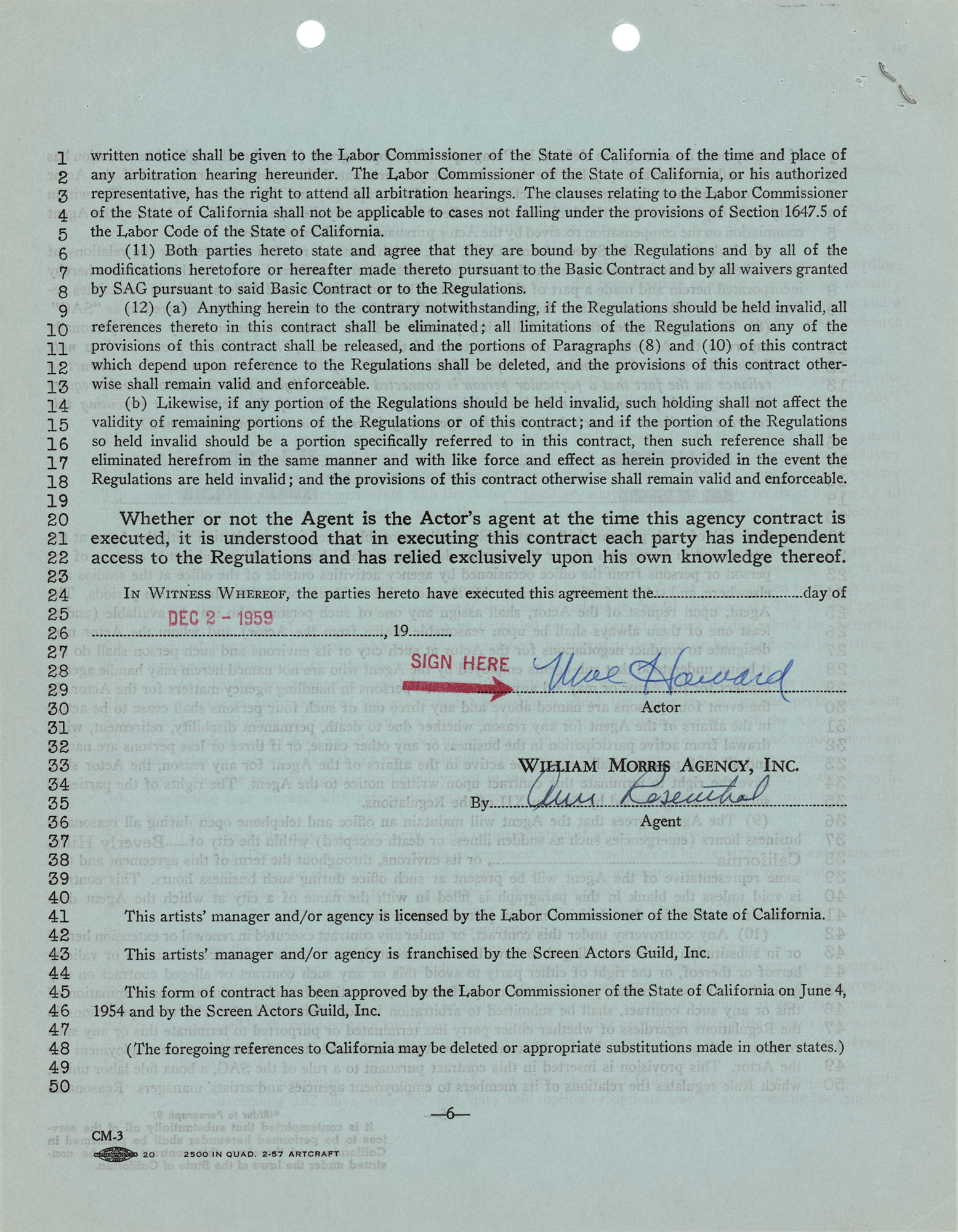 DS, signed "Moe Howard," three pages both sides, 8.5 x 11, December 2, 1959. Standard television motion picture agency contract by which Moe Howard agrees to employ the William Morris Agency as "his agent for television motion pictures" for a period of two years. Signed at the conclusion in blue ballpoint by Moe Howard and countersigned by a William Morris agent. In fine condition.