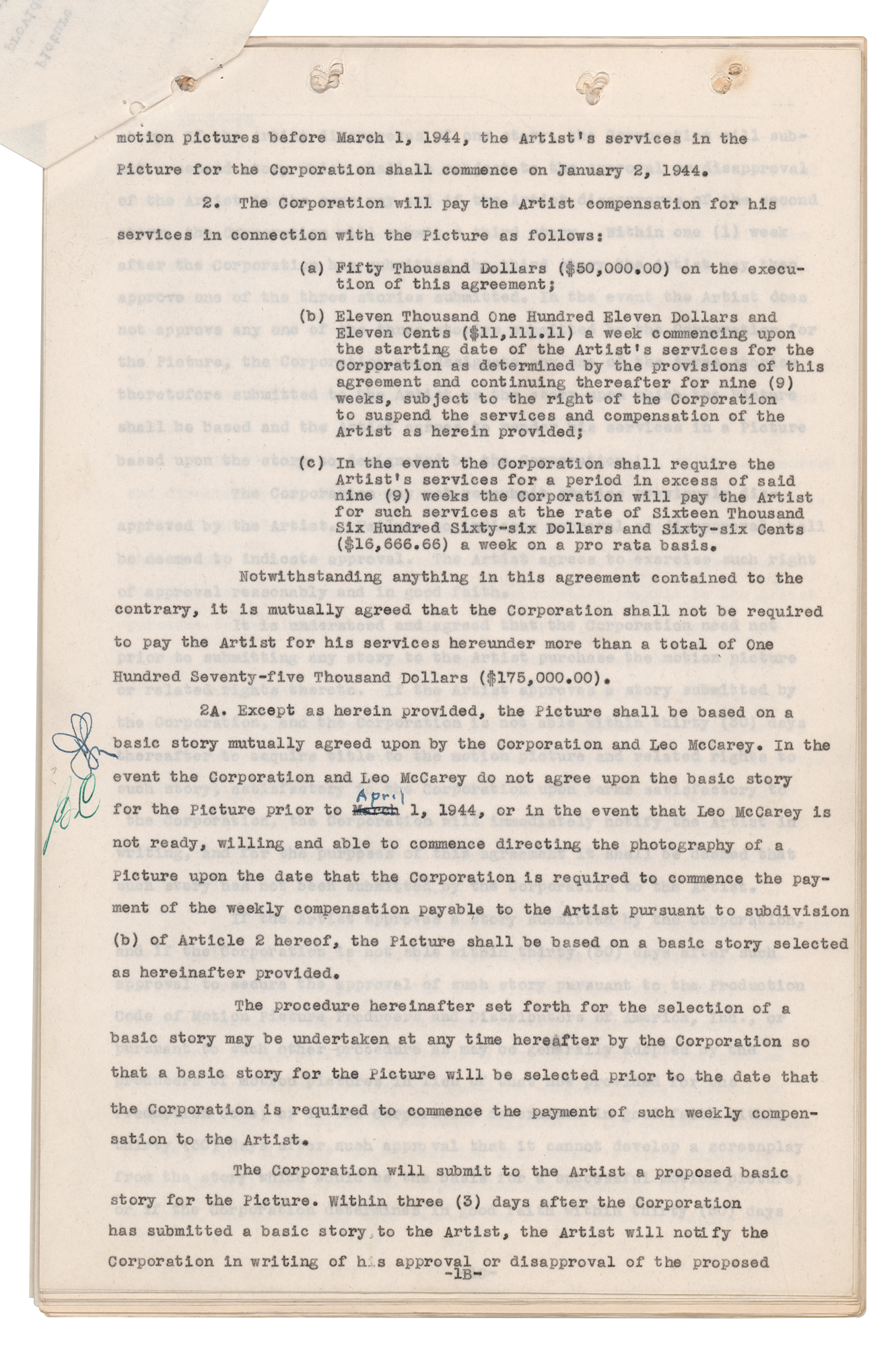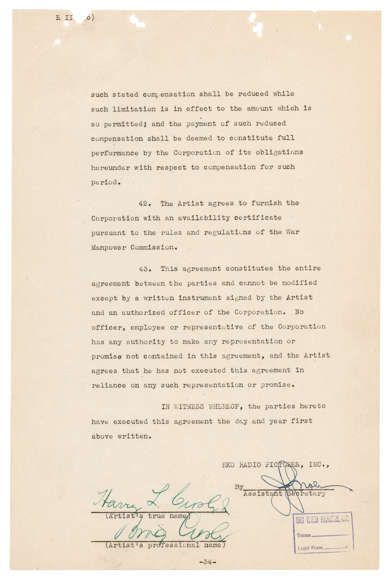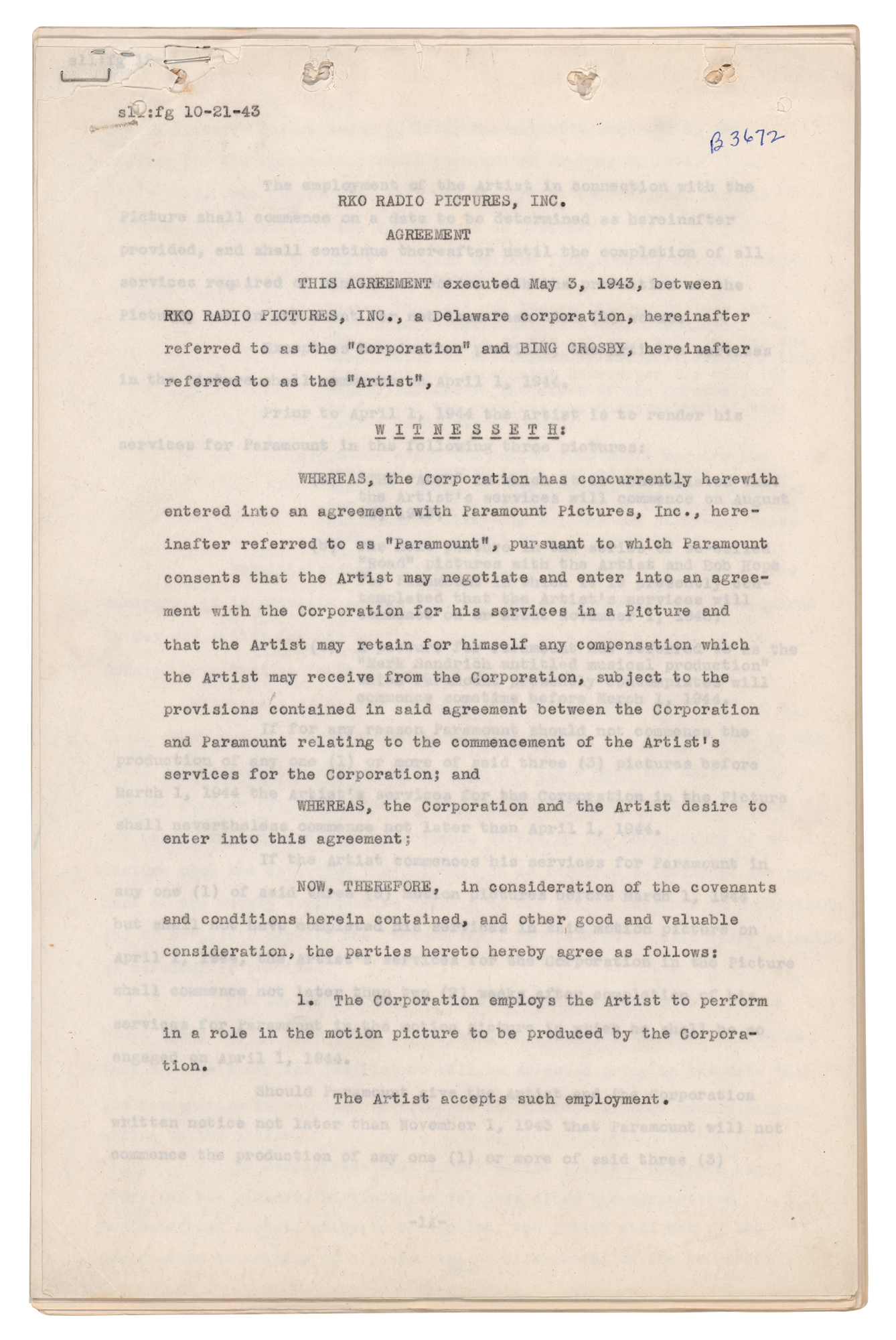 DS, signed “Harry L. Crosby, Bing Crosby,” 34 pages, 8.5 x 13, May 3, 1943. Complex agreement between Bing Crosby, RKO Radio Pictures, and Paramount Pictures by which the actor is "to render his services for Paramount in the following three pictures: (a) 'The Padre' in which it is contemplated the Artist's services will commence on August 16, 1943; (b) The next picture in the series of so-called 'Road' pictures with the Artist and Bob Hope…(c) a picture for Paramount now referred to as the 'Mark Sandrich untitled musical production.'" Signed at the conclusion in fountain pen by Bing Crosby and countersigned by an RKO secretary; Crosby also initials an amendment to a date on the third page. In fine condition, with the last few pages detached, and some losses to the top of the first page.