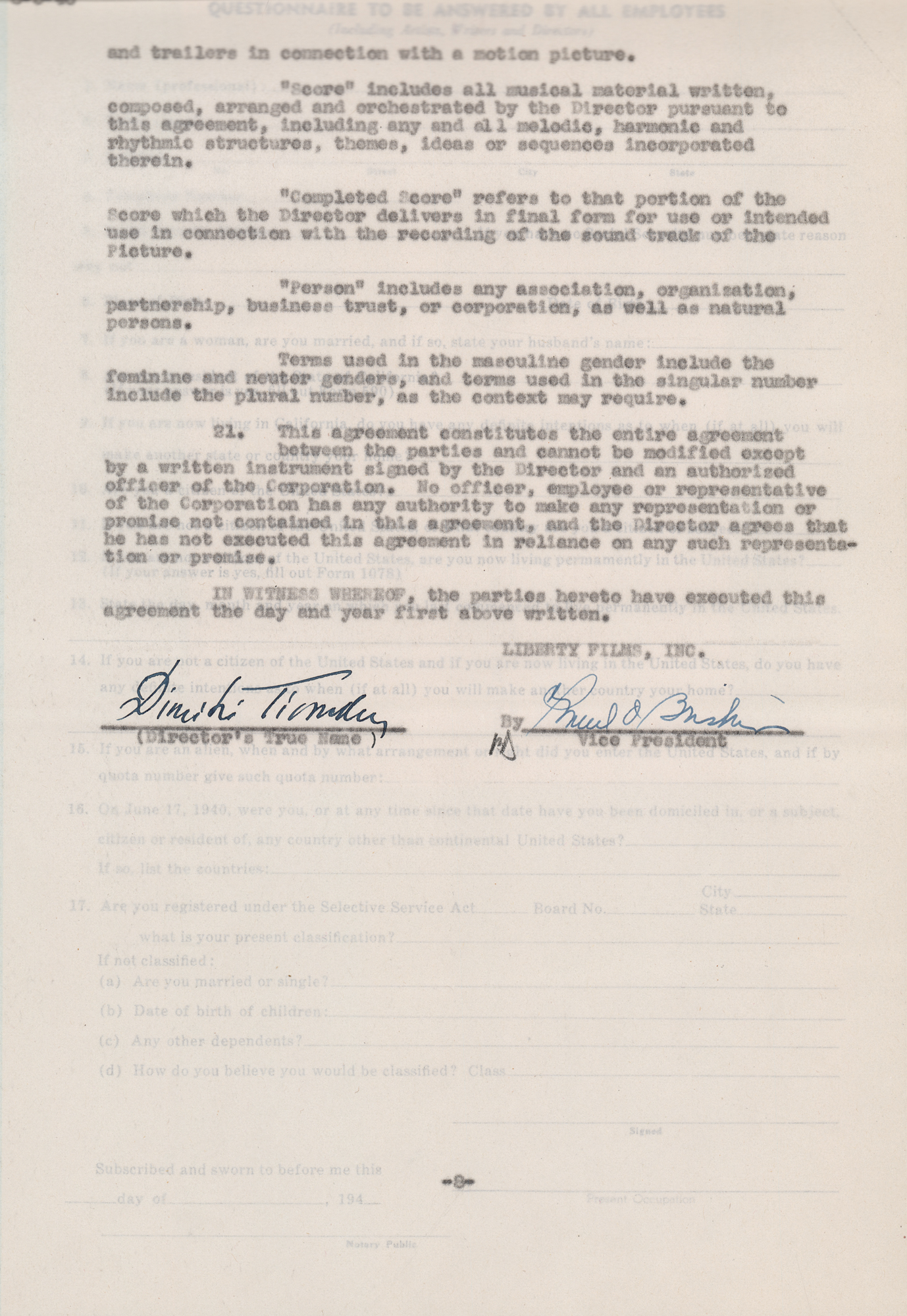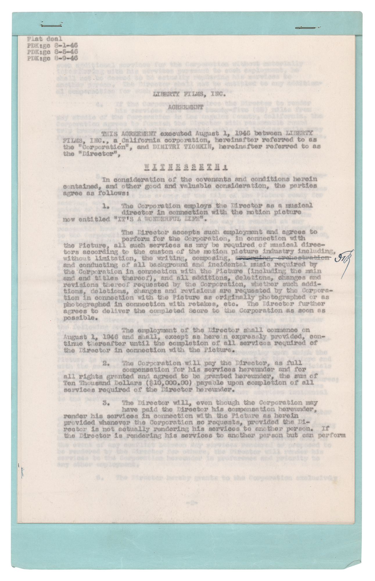 Academy Award-winning composer (1894-1979) of over 140 film scores, including High Noon, Giant, and The Old Man and the Sea Partly-printed DS, eight pages, 8.5 x 13, August 1, 1946. Agreement between Dimitri Tiomkin and Liberty Films by which the composer is employed "as a musical director in connection with the motion picture now entitled 'It's a Wonderful Life.'" Neatly signed at the conclusion in fountain pen by Tiomkin, and countersigned by a Liberty Films vice president. Stapled into its original blue folder. In fine condition. Accompanied by a salary card for his services on the film.