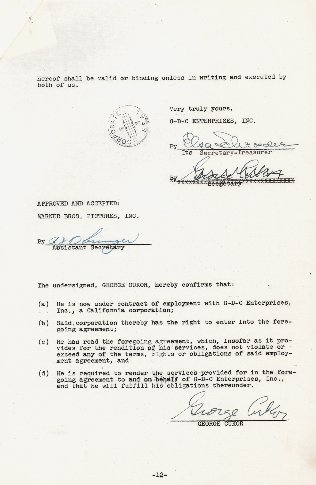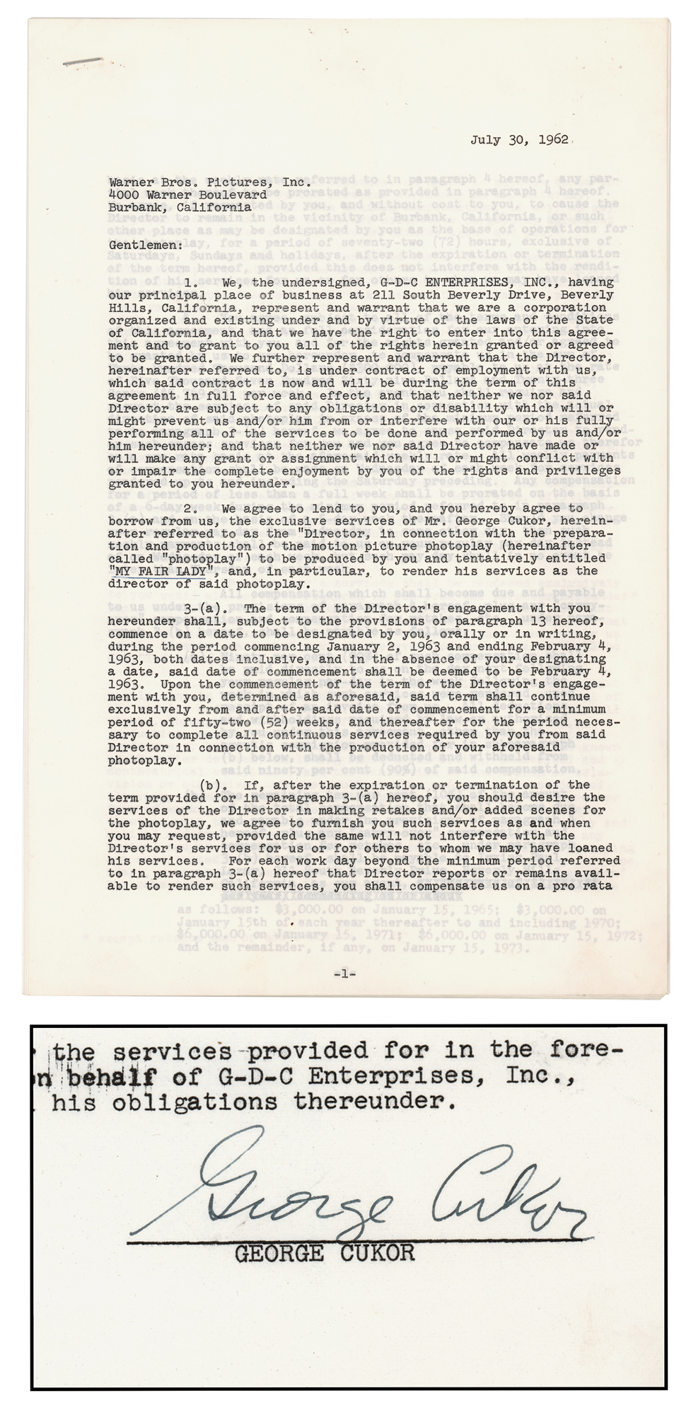 DS, twelve pages, 8.5 x 13, July 30, 1962. Contract between George Cukor, Warner Bros., and G-D-C Enterprises for Cukor's services as "Director, in connection with the preparation and production of the motion picture photoplay…tentatively entitled 'My Fair Lady.'" The contract outlines the specifics of the agreement, including its term, remuneration, rights, and responsibilities: for example, under this agreement, Cukor "shall edit the first rough cut of the photoplay." Signed twice at the conclusion in fountain pen by Cukor (one struck through), and countersigned by Elsa Schroeder of G-D-C Enterprises and A. J. Obringer of Warner Bros. In fine condition.