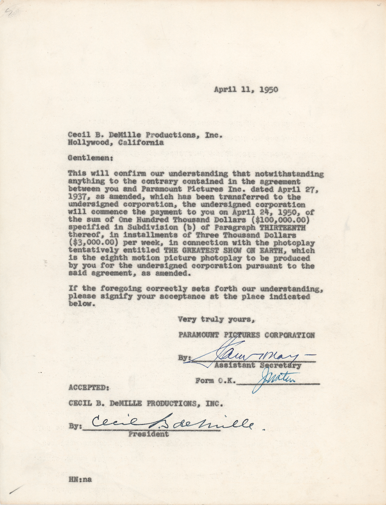 DS, one page, 8.5 x 11, April 11, 1950. Agreement between Cecil B. DeMille and Paramount Pictures amending his payment schedule "in connection with the photoplay tentatively entitled The Greatest Show on Earth." Signed at the conclusion in fountain pen by Cecil B. DeMille, and countersigned by two Paramount representatives. In fine condition.