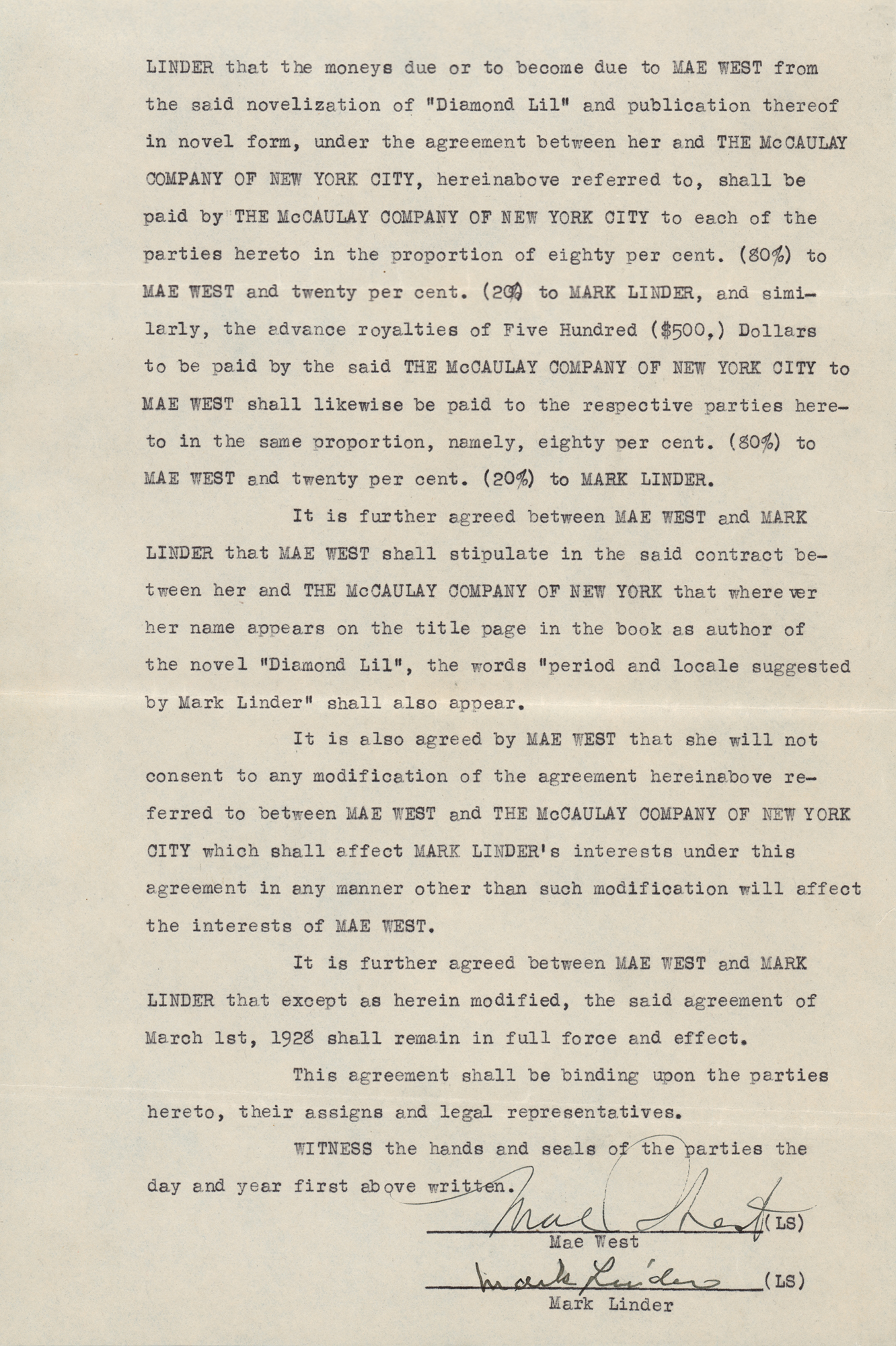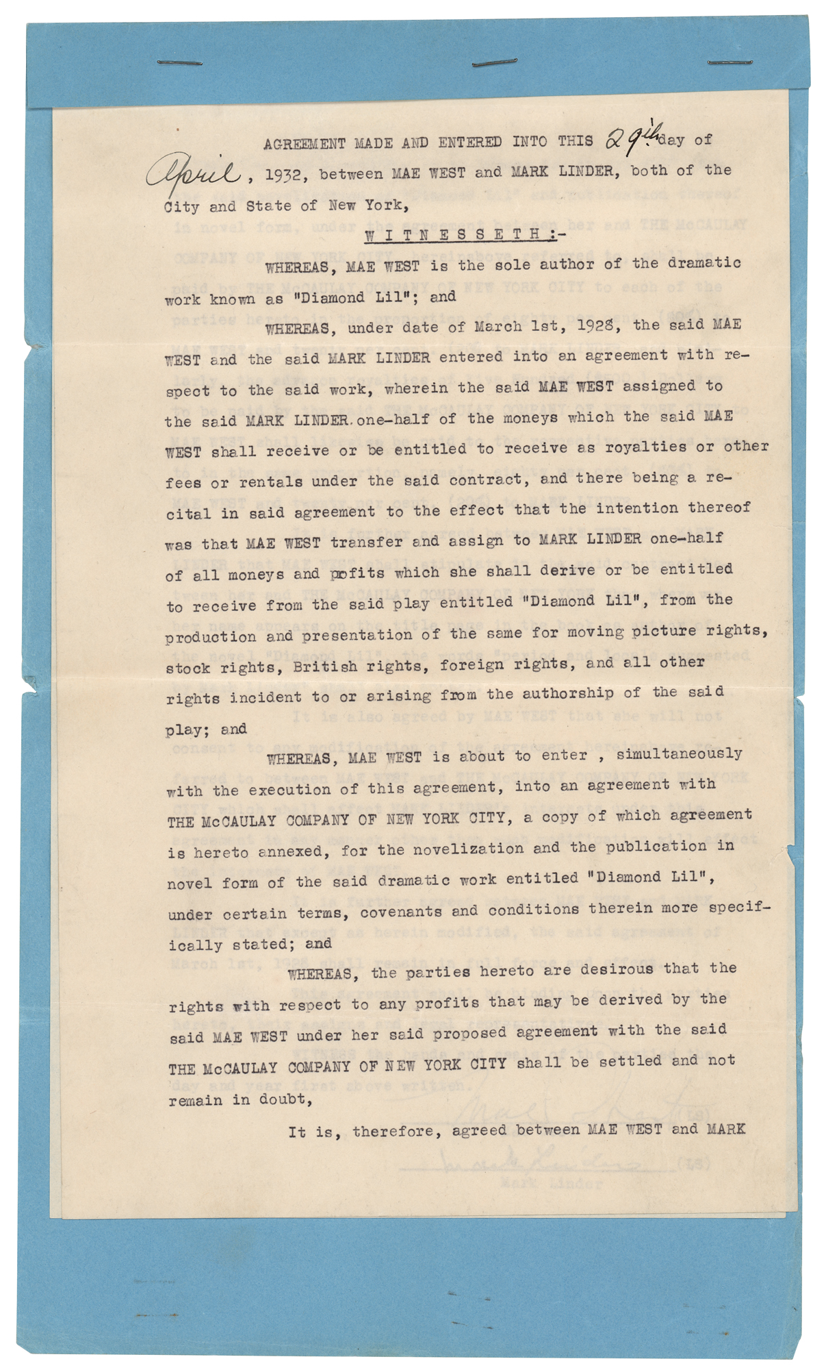DS, two pages, 8 x 13, April 29, 1932. Agreement between Mae West and Mark Linder regarding royalties for a novelization of her 1928 play Diamond Lil, in part: "Whereas, Mae West is the sole author of the dramatic work known as 'Diamond Lil'; and wheres, under date of March 1st, 1928, the said Mae West and the said Mark Linder entered into an agreement with respect to the said work, wherein the said Mae West assigned to the said Mark Linder one-half of the moneys which the said Mae West shall receive or be entitled to…It is, therefore, agreed between Mae West and Mark Linder that the moneys due or to become due to Mae West from the said novelization of 'Diamond Lil' and publication thereof in novel form…shall be paid by The McCaulay Company of New York City to each of the parties hereto in the proportion of eighty per cent (80%) to Mae West and twenty per cent (20%) to Mark Linder." Signed at the conclusion in fountain pen by both West and Linder. Stapled into its original blue paper folder. In fine condition. Diamond Lil was Mae West's first major Broadway success, and was the basis for her character Lady Lou in her 1933 film She Done Him Wrong.