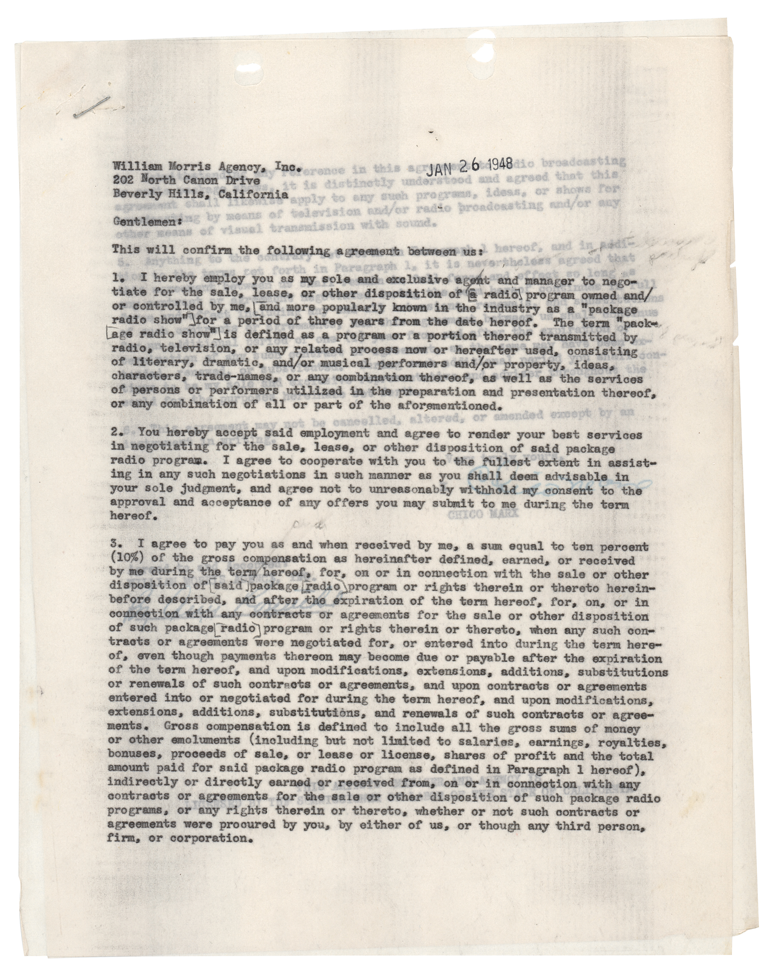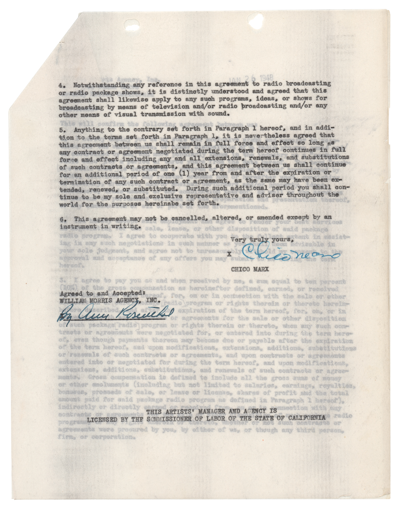 DS, two pages, 8.5 x 11, January 26, 1948. Agreement between Chico Marx and the William Morris Agency by which he employs the firm as his "sole and exclusive agent and manager to negotiate for the sale, lease, or other disposition of a radio program owned and/or controlled by me." Signed at the conclusion in blue ink by Chico Marx, and countersigned by a William Morris agent. In fine condition.