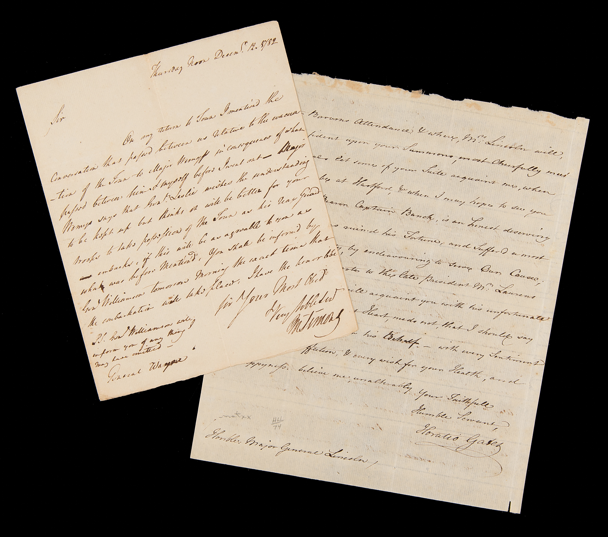 Important pairing of Revolutionary War–dated letters related to the capture of Charleston by the British in 1779, and their evacuation of the city in 1782—virtually the last act of the Revolutionary War in the Southern states—highlighted by an autograph letter signed by Horatio Gates (1727-1806), a former British soldier who served as an American general during the Revolutionary War, controversially taking credit for the victory at Saratoga. Includes: