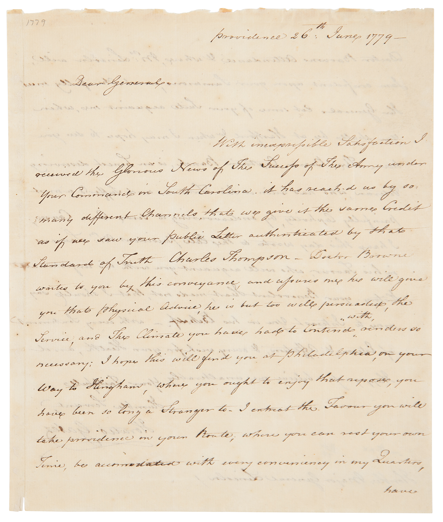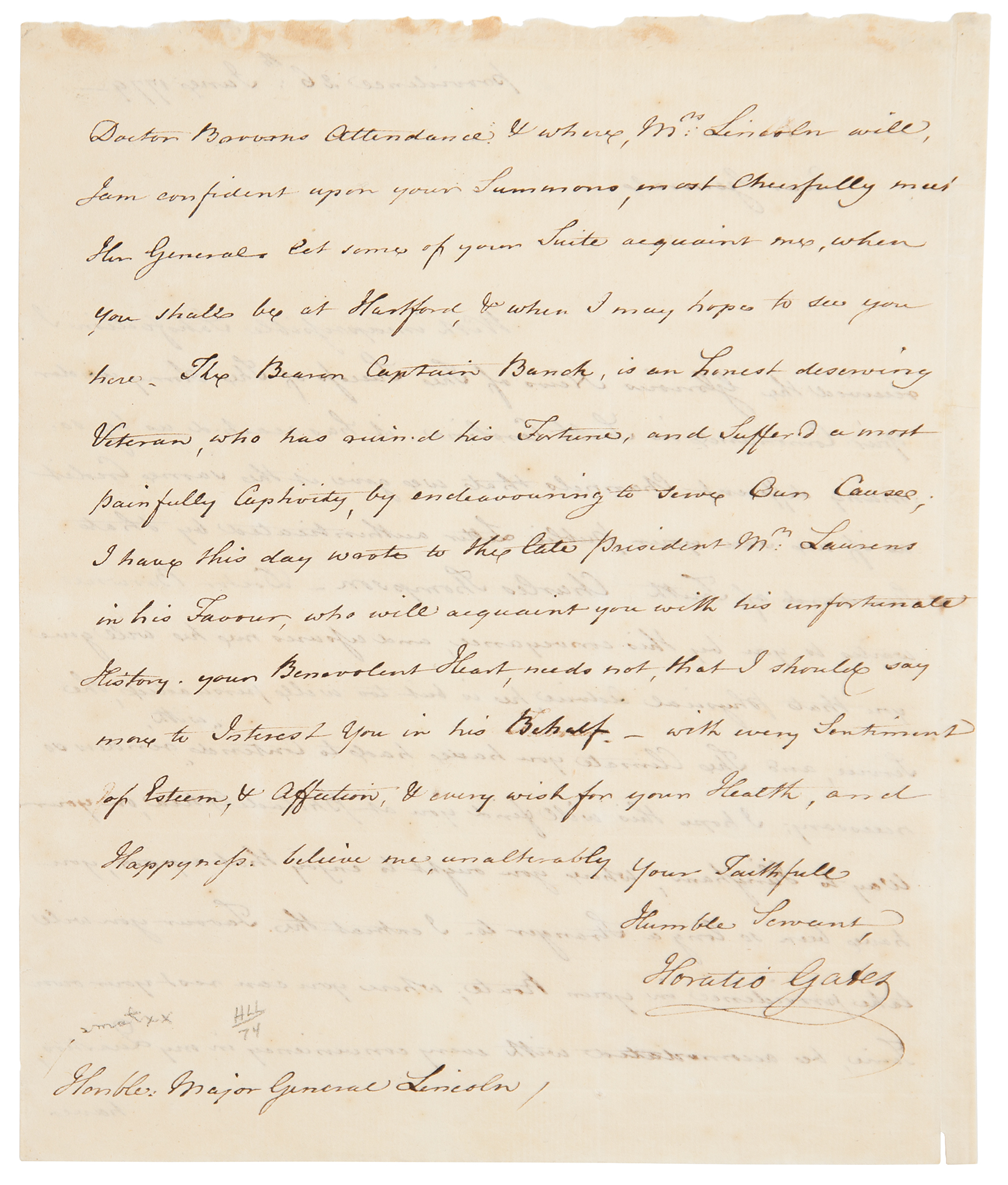 ALS signed "Horatio Gates," one page both sides, 7.75 x 9.25, June 26, 1779. Handwritten letter to Major General Benjamin Lincoln, who would oversee the largest American surrender of the war at the 1780 siege of Charleston. In part: "With inexpressible satisfaction I received the Glorious News of the Success of The Army under your command in South Carolina. It has reached us by many different channels, that we give the same credit as if we saw your public Letter authenticated by that standard of Truth Charles Thompson…I hope this will find you at Philadelphia, on your way to Hingham, where you ought to enjoy that repose, you have been so long a Stranger to. I entreat the Favour you will take providence in your Route, where you can rest…& where Mrs. Lincoln will, I am confident upon your Summons, most cheerfully meet Her General…The Bearer, Captain Branch, is an honest deserving Veteran, who has…suffered a most painfull captivity, by endeavouring to serve Our Cause; I have this day wrote to the late president Mr. Laurens in his Favour, who will acquaint you with his unfortunate History." Gates dramatically overestimates Lincoln's success in the South: within a year, he would be forced to surrender more than 5,000 men to Lieutenant General Sir Henry Clinton.